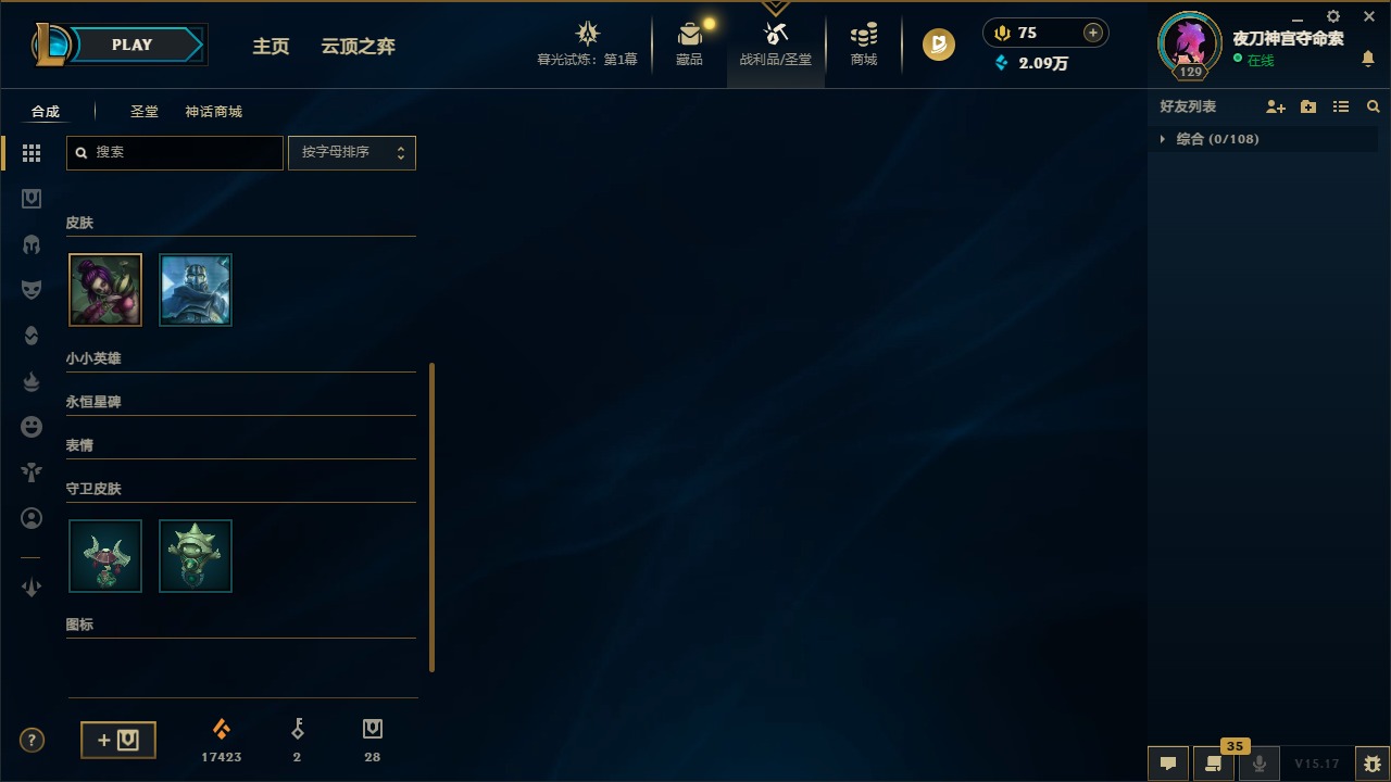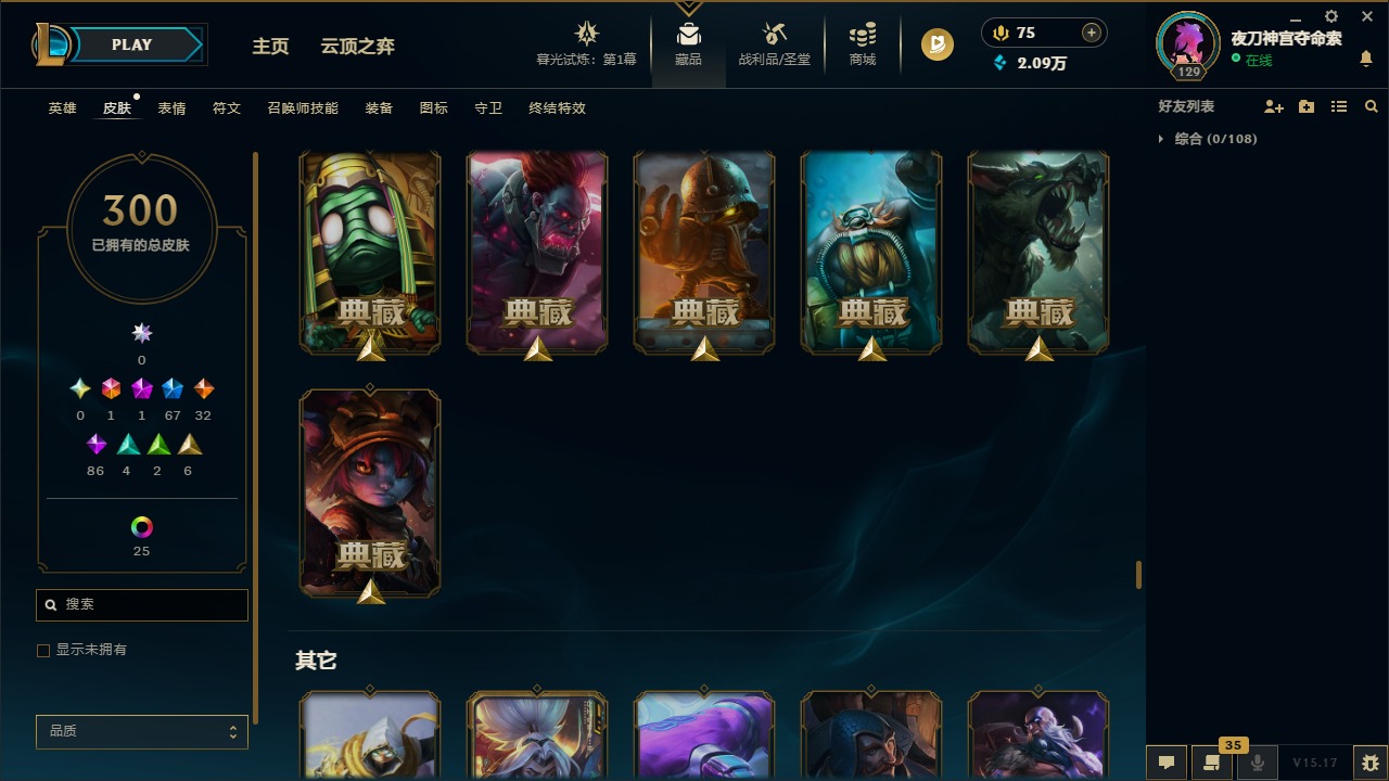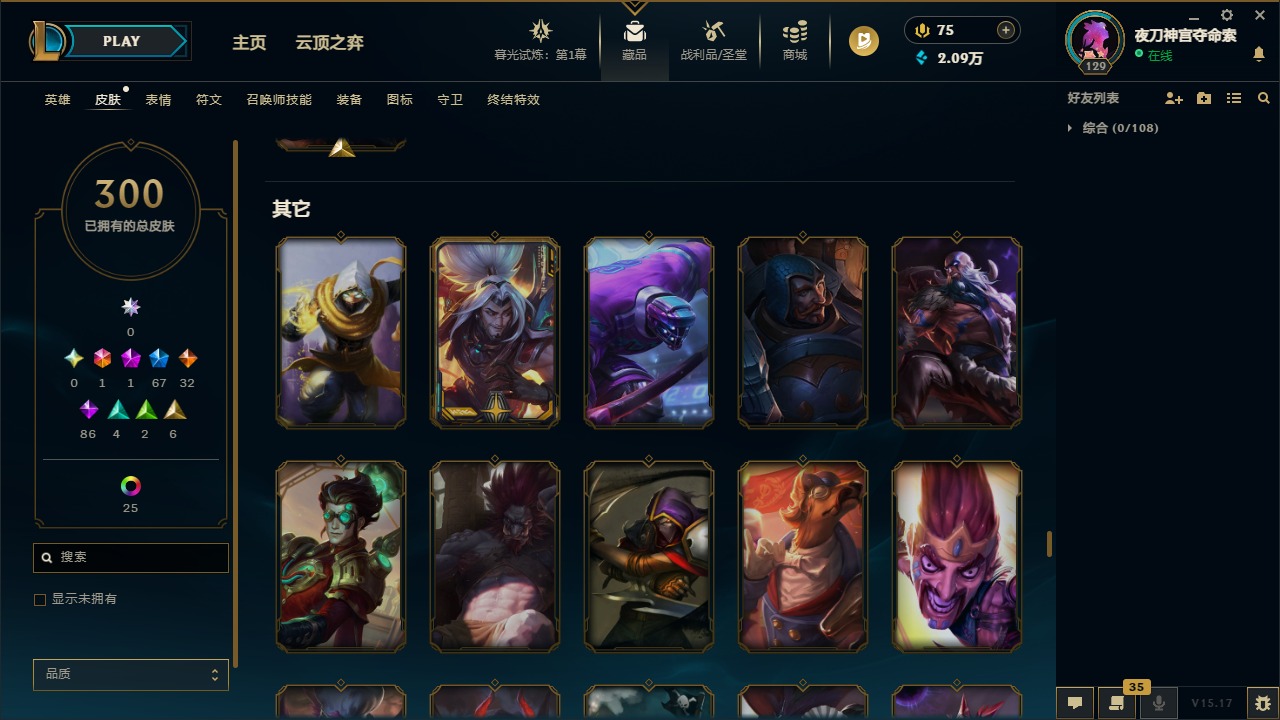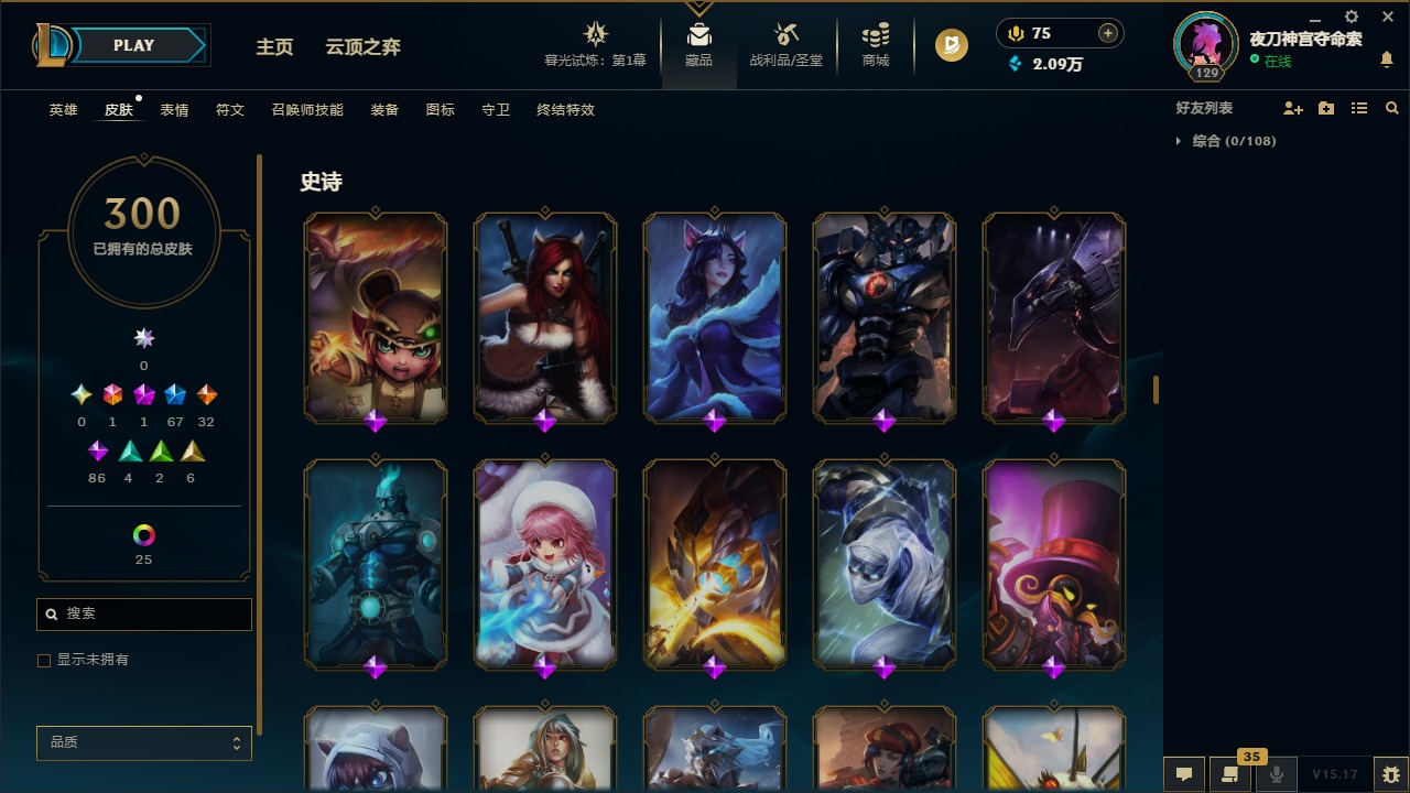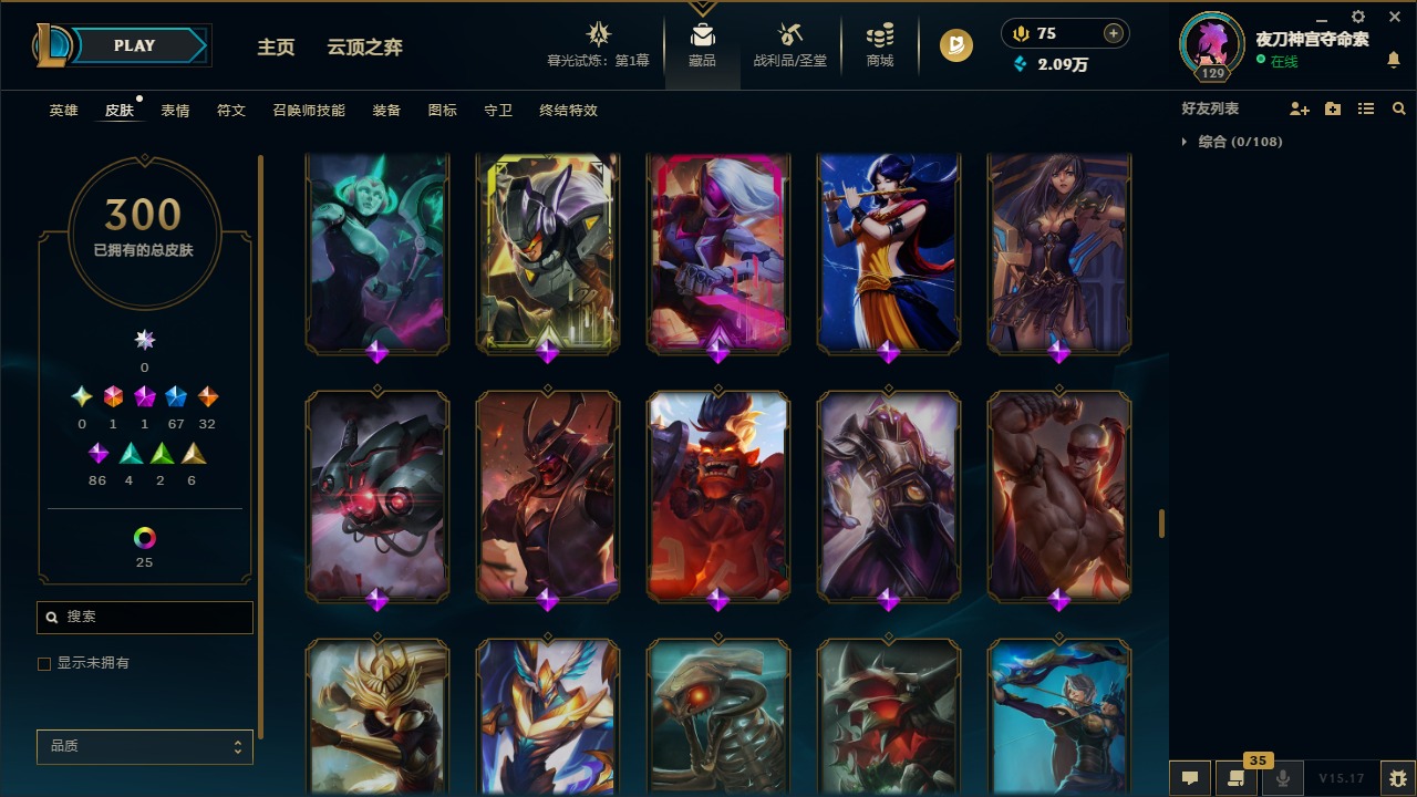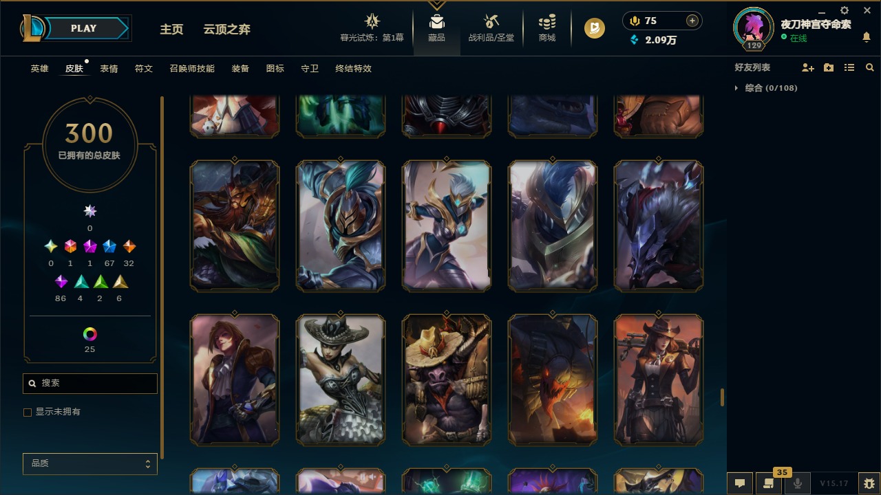 [11684318]1终极 1神话 67限定 32传说 86史诗 300皮肤 35炫彩 115英雄 可二次 可修改实名 优质装备:穿星魔锋,斩星魔剑,源代码 乐芙兰,防爆天使 凯尔,巧克力工坊 波比,电玩战魂 人马,防爆士兵 炼金,防爆士兵 格雷福斯,钢铁之翼 凤凰,冠军之血 希瓦娜,惊悚派对 阿木木,惊悚派对 费德提克,警用试作体K-9 内瑟斯,密林猎手 提莫,野兽猎人 德莱文,野兽猎人 瑟庄妮,野兽猎人 泰达米尔,御魔星矢 寒冰,灵魂守卫,霸天巨兽·雪崩 墨菲特,玉剑传说 无影 竞星,玉剑传说 无影 莫问,净雪之月 莫甘娜 冬虹,魔女 阿卡丽 虚荣 限定:战熊骑士,创星之灵 璐璐 情人节限定:甜心之翎 洛,甜心宝贝 娑娜 冠军限定系列:S1FNC 酒桶,S2 暗杀星 蒙多,S3 SKT T1 劫,S4 SSW 图奇,S4 SSW 炼金,S5 SKT T1 雷克顿,S5 SKT T1 阿利斯塔,S5 SKT T1 阿兹尔,S5 SKT T1 蜘蛛,S6 SKT T1 烬,S7 SSG 嘉文四世,S7 SSG 洛,S7 SSG 纳尔,S7 SSG 塔利亚,S7 SSG 霞,S7 SSG 伊泽瑞尔 冰雪节限定:“主人不要我了” 阿木木,冰雪节 马尔扎哈,冰雪节 炼金,胡桃夹子 小丑,平安夜女神 娑娜,魄罗骑士 瑟庄妮,圣诞开心鬼 提莫,圣诞精灵 崔丝塔娜,圣诞狂欢 时光,圣诞老人 酒桶,圣诞玩偶 波比,圣诞驯鹿 克格莫,冰雪节 茂凯,邪恶圣诞老人 维迦,幸福女神 乐芙兰,雪球也能爆炸 吉格斯,雪装 奈德丽 泳池派对:泳池派对 吉格斯,泳池派对 菲奥娜 万圣节限定:鬼影森森 茂凯,鬼影重重 魔腾,魅惑女巫 莫甘娜,南瓜头 费德提克,无头骑士 人马 年限:猴年 凯特琳,鸡年 盖伦 周年:2周年 德莱厄斯,3周年 厄运小姐,4周年 锐雯,5周年 阿狸,7周年 泰隆