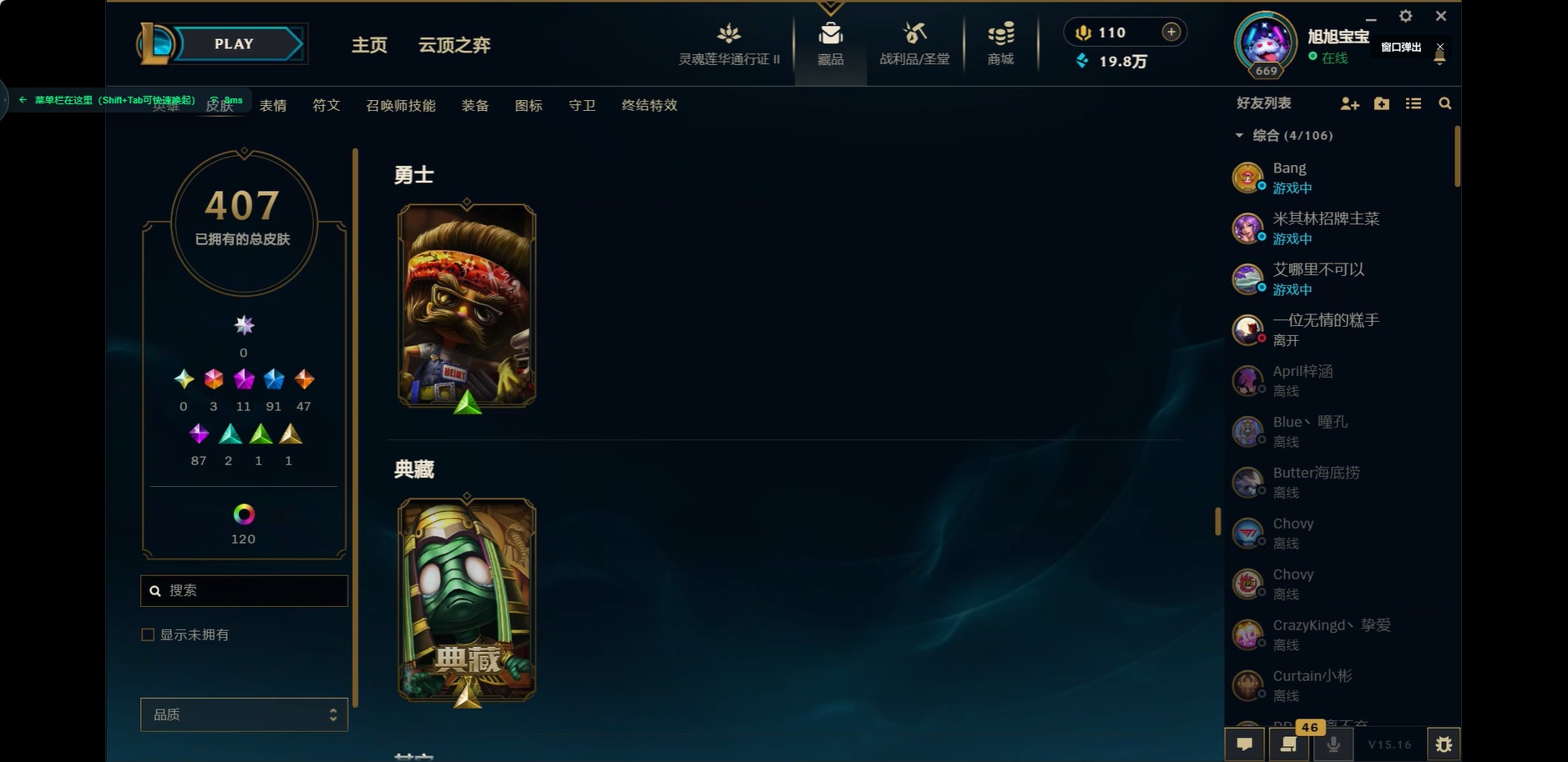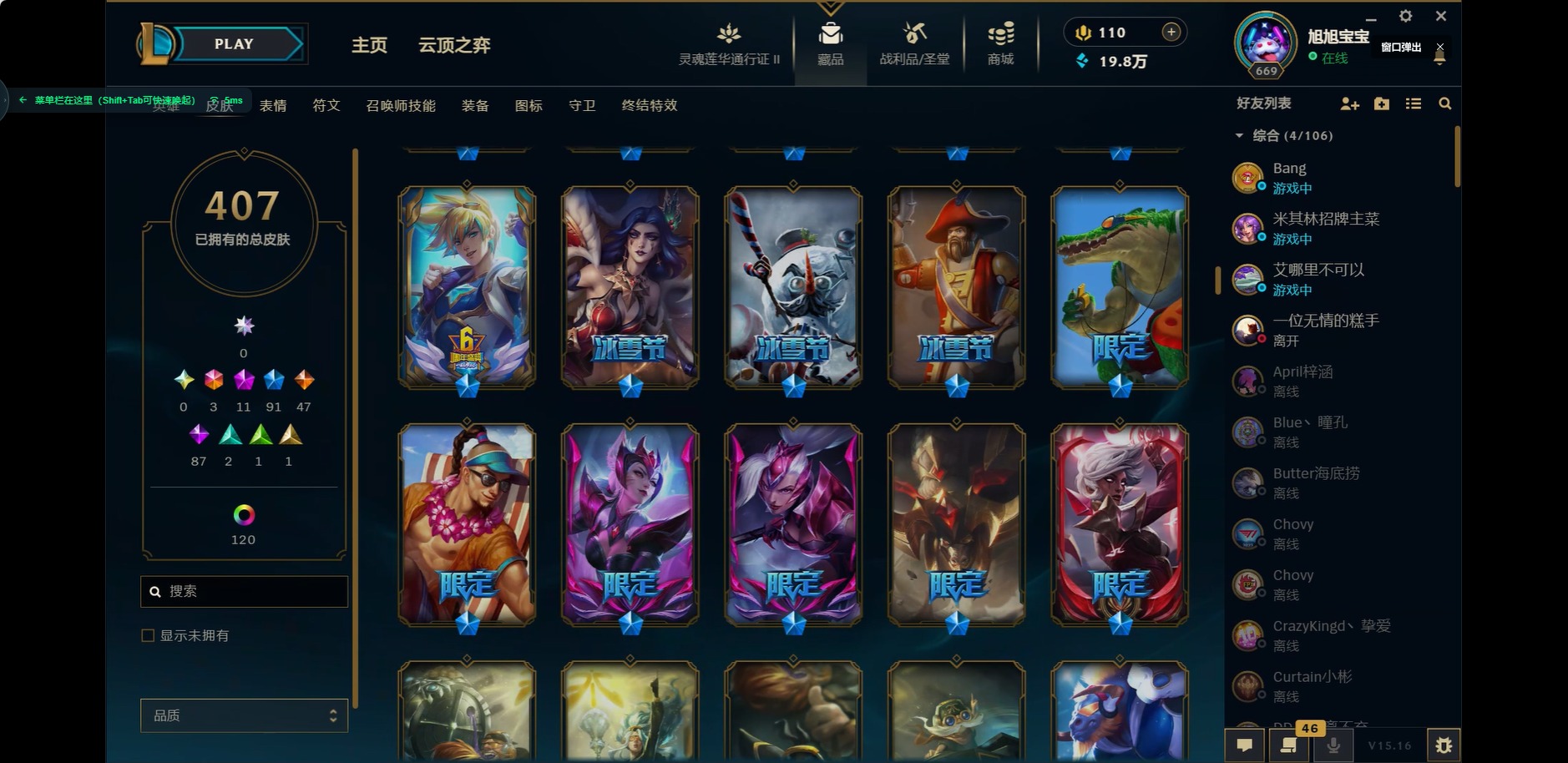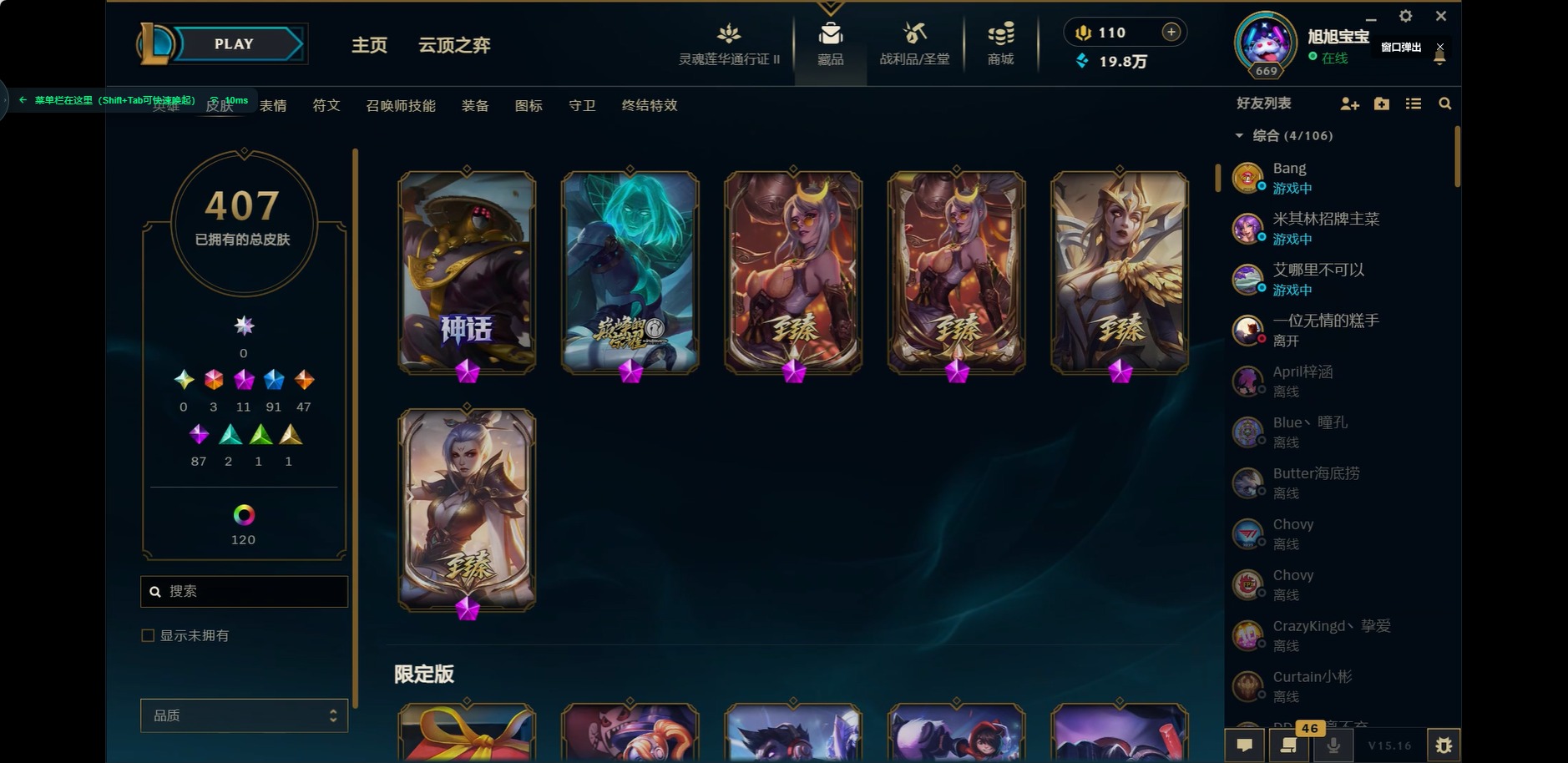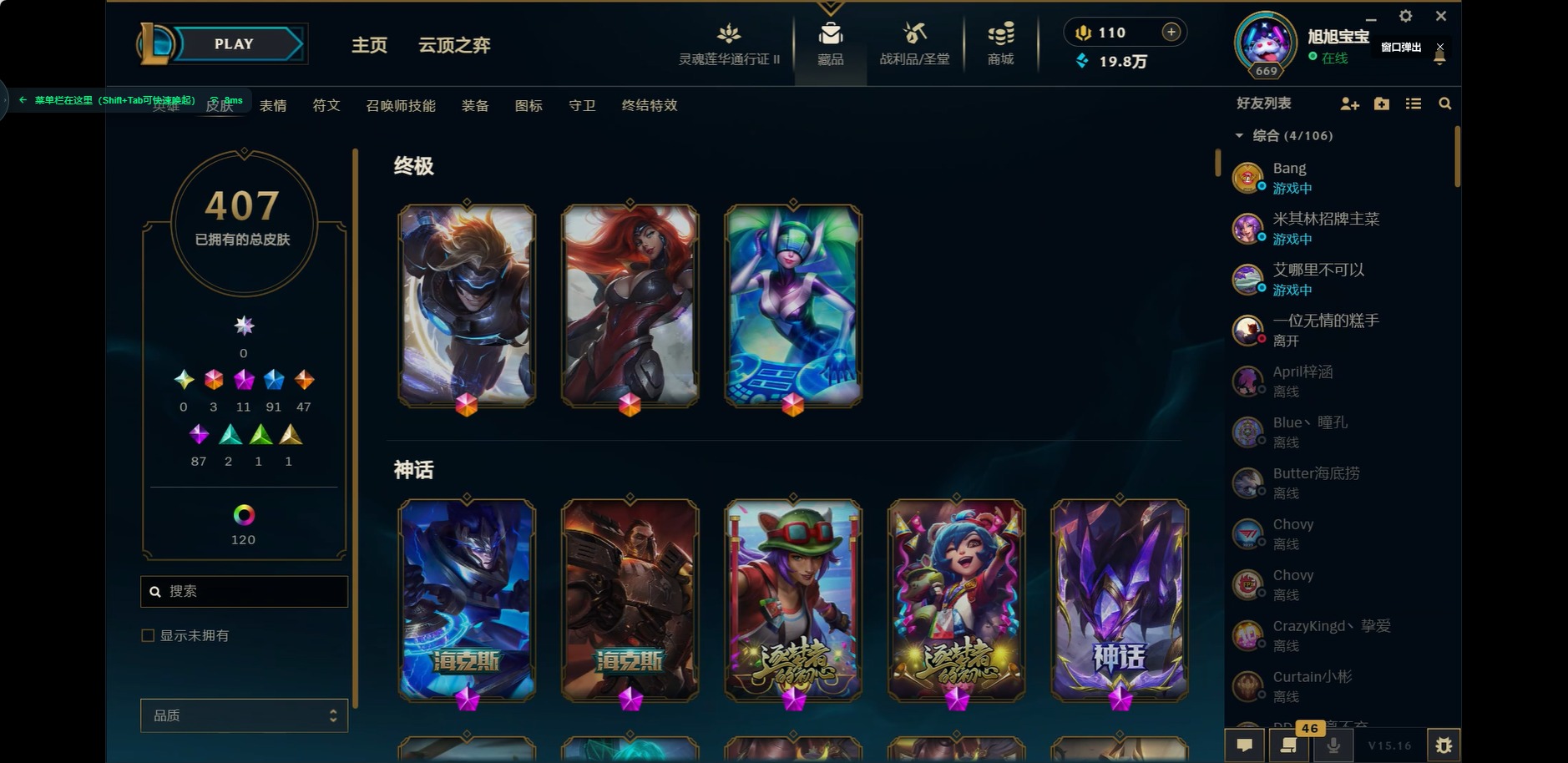 - [11578957]V6 1典藏 1珍品传说 2传说 123英雄 204皮肤 可修改实名 金蝉小国标 荣耀水晶:星域神启(倪克斯贼亮) 珍品传说:怪盗基德 传说皮:冠军飞将 珍宝阁皮:万物之道,蔷薇恋人 限定皮:逐霄战戟,鸣野蒿,遇见飞天,高山流水,五谷丰年,梁祝,孙行者,一生所爱,大圣娶亲 史诗皮:星界战将,器灵·浮梦炉,破空之剑,紫霞仙子,白龙吟,黄金分割率,千年之狐,江河有灵,蒙恬荣光圣徽,冰冠公主,魅语,末日机甲-吕布,乱世虎臣,女仆咖啡,摇滚巨星,水果甜心,天才门将,星夜王子,心灵骇客,时之奇旅-安琪拉,功夫厨神,暗隐猎兽者,幽灵船长,鬼剑武藏,心灵战警,舞动绿茵,缤纷独角兽,逐浪之夏,水晶猎龙者,金属风暴,原初追逐者,圣诞恋歌,鹰眼统帅,魅力维加斯,黎明之约,无心