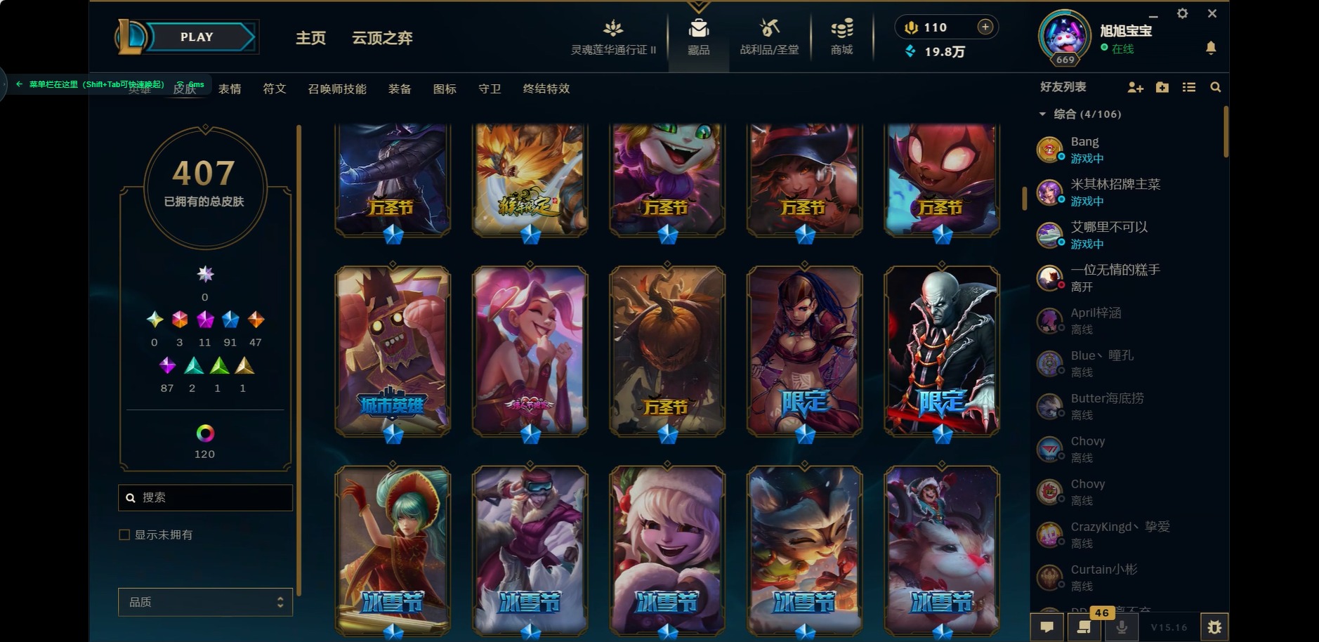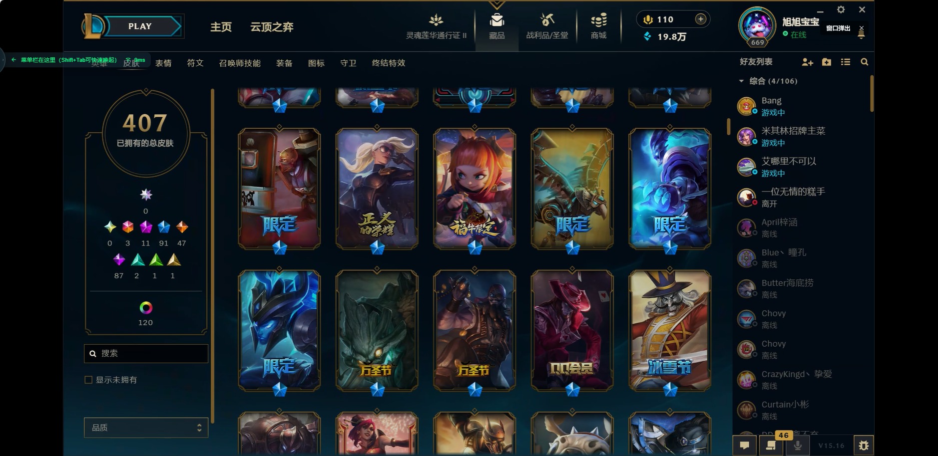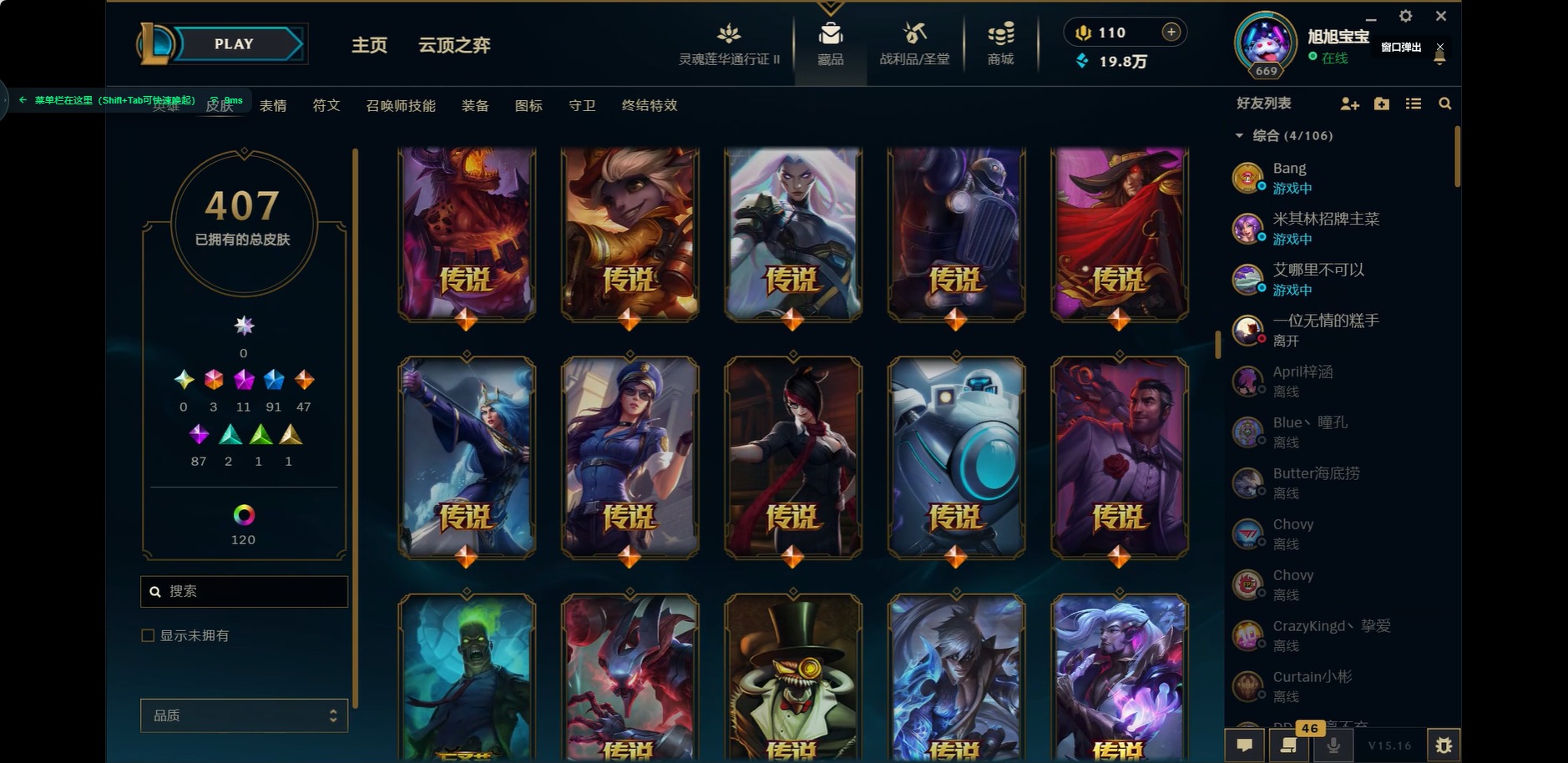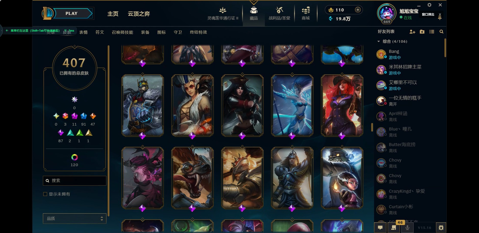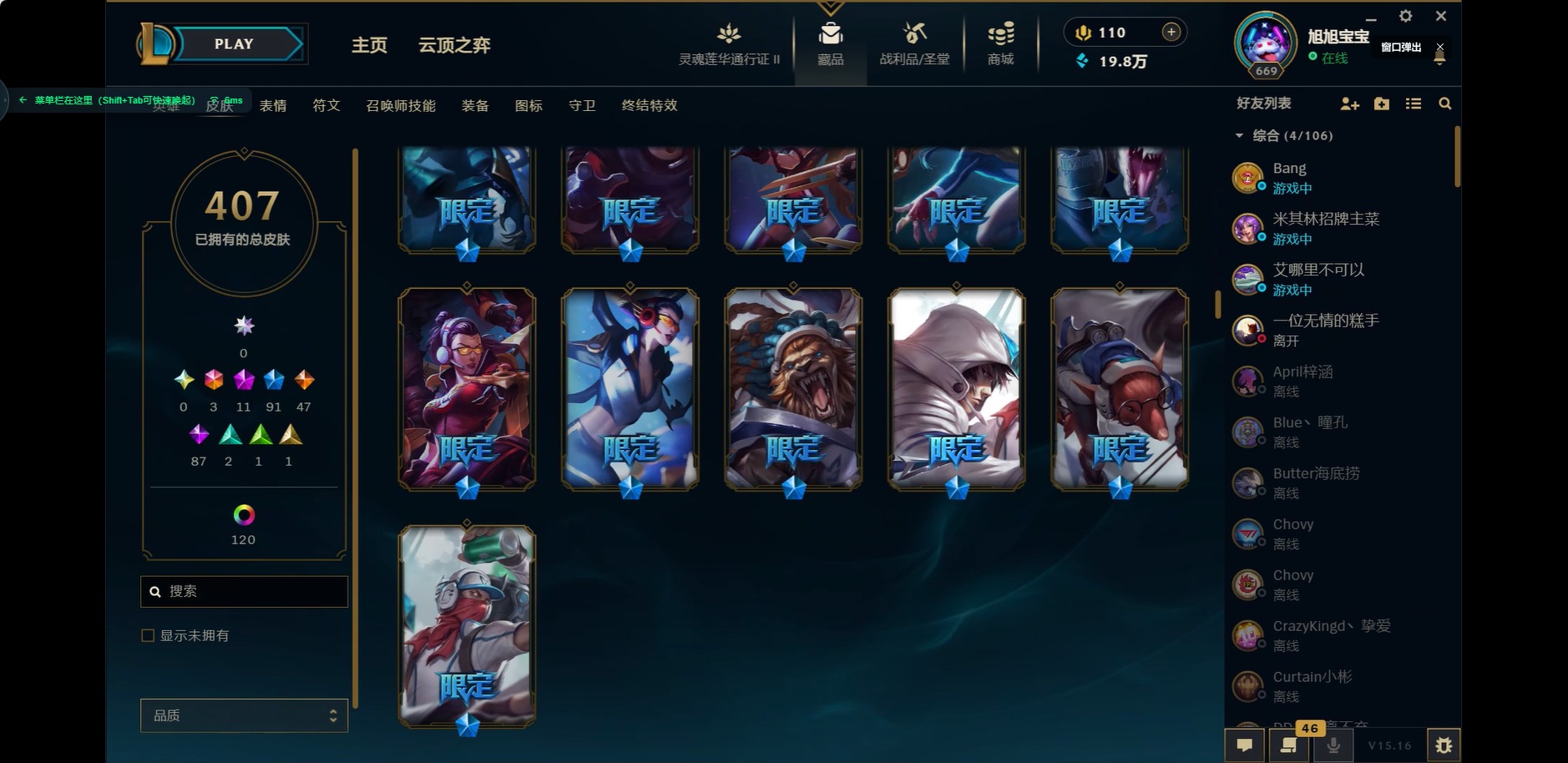 [11684345]可二次 可修改实名 3终极 11神话 5臻彩 90限定 47传说 87史诗 407皮肤 153炫彩 171英雄 铂金 皮肤:天龙之子 斯莫德,灵魂莲华 莉莉娅,腥红之月 派克,星之守护者 妮蔻,绝息圣堂 洛,永恒之森 巴德,SKT T1 卡莉丝塔,冠军之矛 卡莉丝塔,灌篮高手 艾翁,永恒之森 雷克塞,腥红之月 锤石,冠军典狱长 锤石,深渊恐惧 锤石,太空律动 “音浪狂舞” 莎弥拉,魅惑女巫 悠米,司马懿 仲达,SKT T1 阿兹尔,幽冥领主 阿兹尔,源代码 娜美,鲛妮座人 娜美,胜利之剑 亚托克斯,炼狱魔女 蔚,任性学霸 艾克,胜利枪神 卢锡安,源计划:雷 卢锡安,职业杀手 卢锡安,海牛大大 塔姆,觅心萝莉 金克丝,源计划:疯狂 金克丝,星之守护者 金克丝,丧尸杀手 金克丝,黑帮管家 布隆,屠龙勇士 布隆,荣誉使者 阿克尚,这货不是维克兹,神龙尊者 夜月幻龙 亚索,黑夜使者 亚索,腥红之月 亚索,源计划:风 亚索,西部牛仔 亚索,泳池派对 扎克,邪恶魔人 扎克