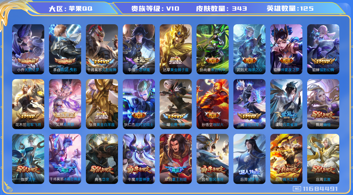 [11684491]V10 2典藏 23传说 125英雄 343皮肤 典藏英雄武则天 可修改实名 优质装备:天鹅之梦(小乔典藏),鸣剑·曳影,黄金狮子座,冠军飞将,云鹰飞将(小将军),黄金白羊座,猫影幻舞,久胜战神,一念神魔,云霓雀翎,末日机甲-孙尚香(绿蚂蚱),地狱火,仲夏夜之梦(大飞蛾),海洋之心,超时空战士-狄仁杰,澜逐花归海,艾琳觅芳踪 珍宝阁皮:妄想食味,女武神 限定皮:鸣野蒿,至尊宝,凤求凰(白切鸡),凤凰于飞,太华(伽罗年限),时之彼端,白晶晶,时雨天司(水龙头),飞衡(韩信年限),玄嵩(庄周年限),遇见飞天,冰锋战神,幽恒(沐浴露),梁祝,御风骁将(吕布年限),逐梦之星,岱宗(典韦年限),奔雷神使(牛魔年限),祈雪灵祝(雪兔子),天狼绘梦者,李小龙,逐梦之光,永曜之星,辉光之辰,如梦令-嫦娥,如梦令-后羿,霸王别姬-项羽,霸王别姬-虞姬,奇迹圣诞,默契交锋-兰陵王,默契交锋-花木兰,引擎之心,冰霜恋舞曲,热情桑巴,美猴王 史诗皮:鸭鸭历险记-刘禅,遇见神鹿,紫霞仙子,电玩小子(小书包),白龙吟,黄金分割率,特工魅影,千年之狐,偶像歌手,龙骑士(小龙虾),白蛇,暗夜猫娘,魅语,无限星赏官,晚萤,冰冠公主,青蛇,末日机甲-吕布,猫狗日记-孙策,猫狗日记-大乔,时之恋人-孙尚香,乱世虎臣,节奏热浪,修罗,女仆咖啡,摇滚巨星,水果甜心,绅士熊喵,天才门将,星夜王子,心灵骇客,功夫厨神,德古拉伯爵,暗隐猎兽者,幽灵船长,鬼剑武藏,心灵战警,舞动绿茵,地狱岩魂,纤云弄巧,繁星吟游(呼啦呼啦),缤纷独角兽,乘风破浪,逐浪之夏,龙鼓争鸣,水晶猎龙者,曙光守护者,热力回旋,箭羽风息,金属风暴,原初追逐者,圣诞狂欢,圣诞恋歌,鹰眼统帅,暗夜贵公子,魅力维加斯,未来纪元-赵云