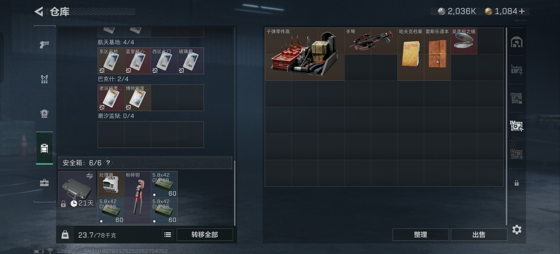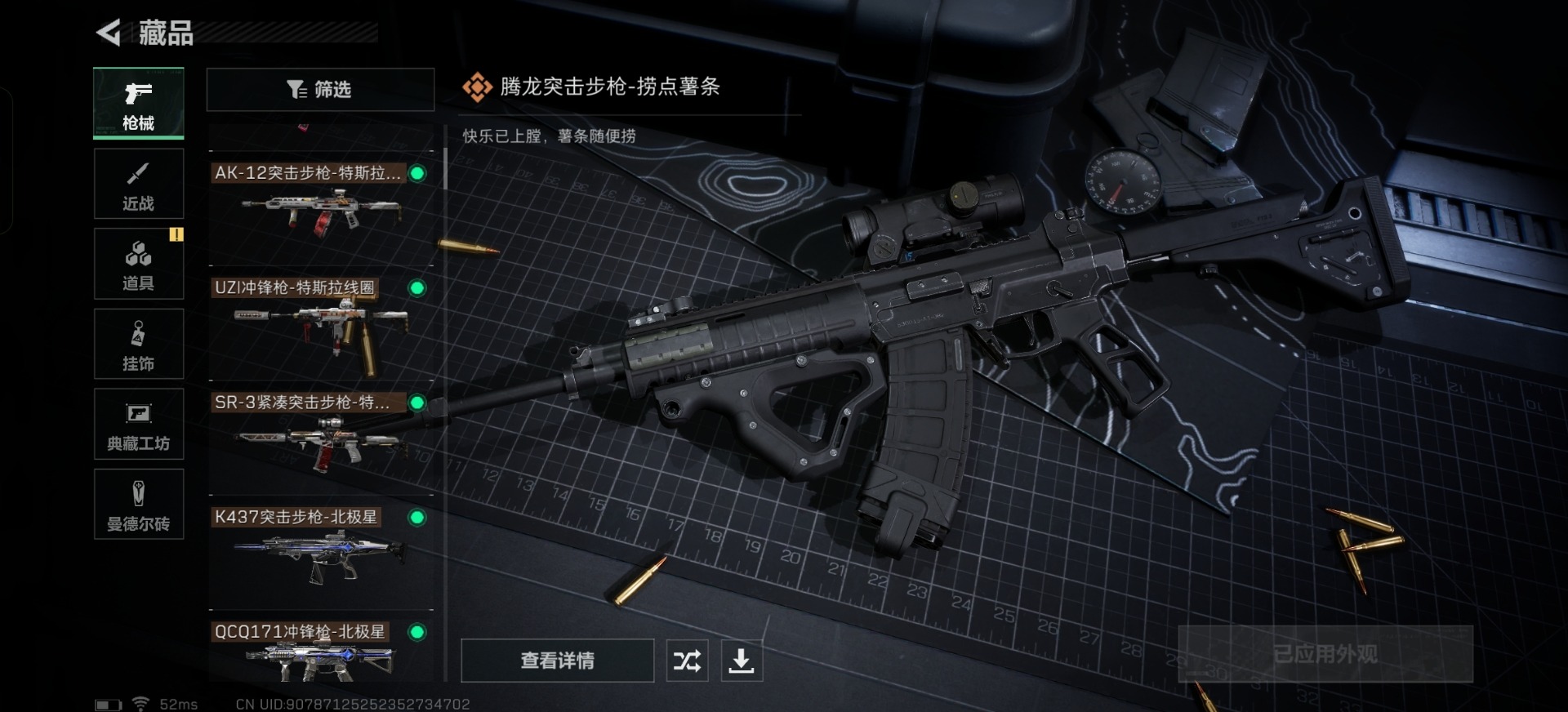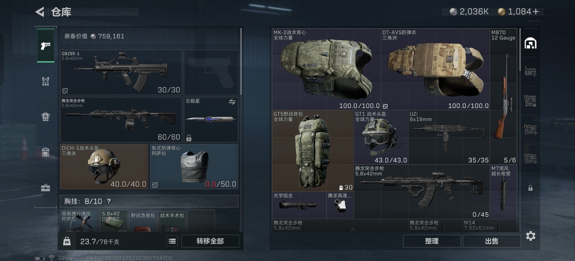 [11684497]总资产:34.3M 1干员外观 2近战传说 18传说枪械 哈夫币:2.036K 高级安全箱(2×3)9.15号到期 可二次 可修改实名 优质装备:近战-黑海,近战-北极星 烽火地带段位:铂金 全面战场段位:无段位 传说武器皮肤:SMG45冲锋枪-骑士,M4A1突击步枪-阿米娅,CAR-15突击步枪-阿米娅,复合弓-黑-天际线,AWM狙击步枪-捞点薯条,QCQ171冲锋枪-北极星,腾龙突击步枪-捞点薯条,93R-捞点薯条,AK-12突击步枪-特斯拉线圈,SR-3M紧凑突击步枪-特斯拉线圈,UZI冲锋枪-特斯拉线圈,勇士冲锋枪-能天使-午夜邮差,725双管霰弹枪-送葬人-无题密令,K437突击步枪-北极星,MP5冲锋枪-黑海,QJB201轻机枪-黑海 史诗武器皮肤:AUG突击步枪-蝮蛇,M16A4突击步枪-竞赛选手,PKM通用机枪-荒野求生,SR-3M紧凑突击步枪-荒野求生,SV-98狙击步枪-林中猎手,SVD狙击步枪-荒野求生,SV-98狙击步枪-囚徒,腾龙突击步枪-无垢,QBZ95-1突击步枪-曙光 干员外观:红狼-蚀金玫瑰