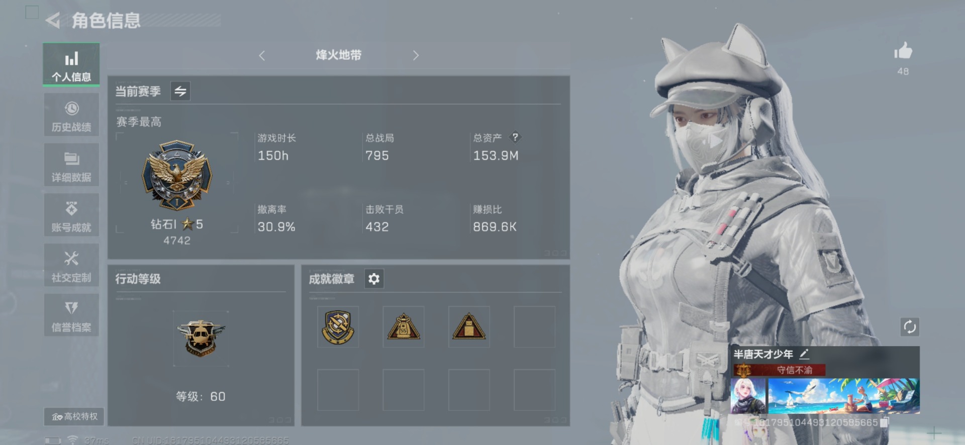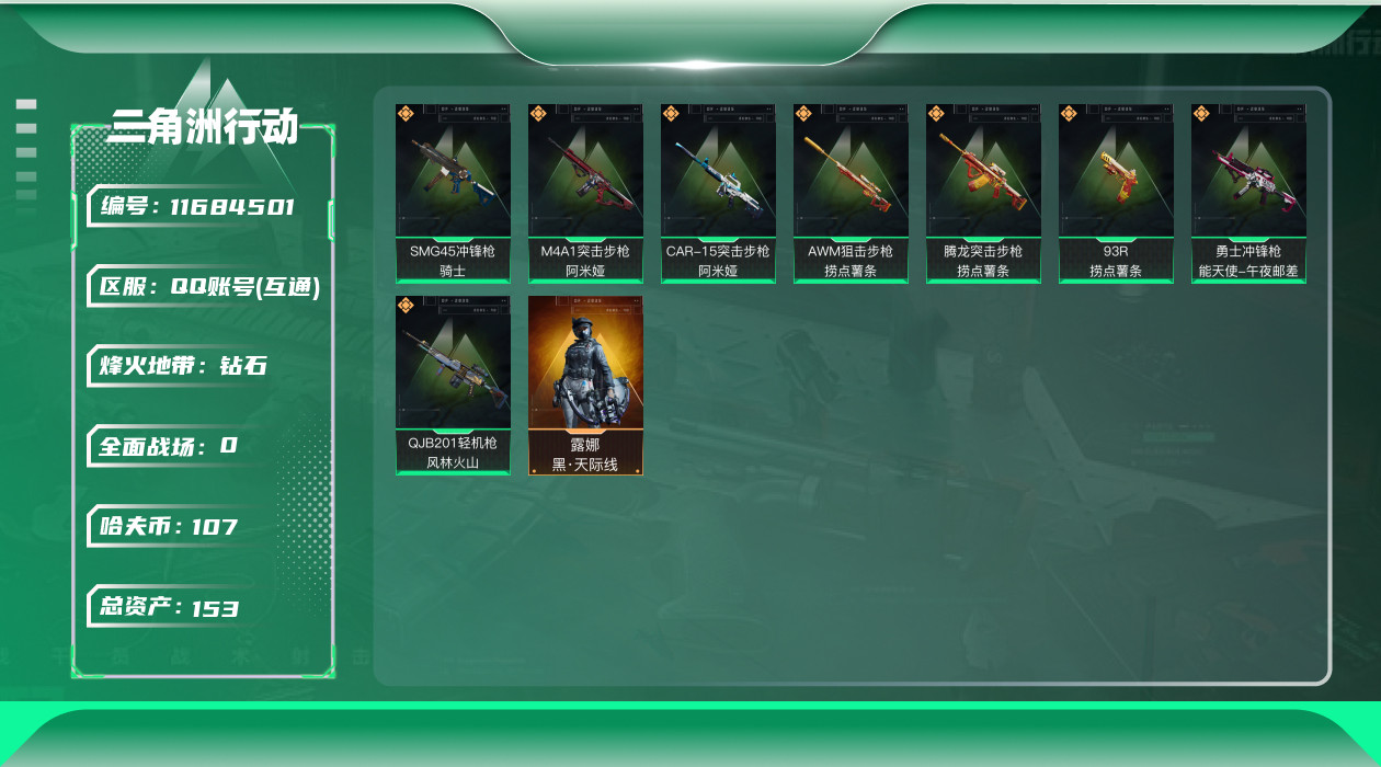 [11684501]总资产:153.9M 1干员外观 8传说枪械 哈夫币:107K 顶级安全箱(3×3)9.15号到期 可二次 可修改实名 优质装备:顶级安全箱(3x3) 烽火地带段位:钻石 全面战场段位:无段位 传说武器皮肤:QJB201轻机枪-风林火山,SMG45冲锋枪-骑士,M4A1突击步枪-阿米娅,CAR-15突击步枪-阿米娅,AWM狙击步枪-捞点薯条,腾龙突击步枪-捞点薯条,93R-捞点薯条,勇士冲锋枪-能天使-午夜邮差 干员外观:露娜-黑·天际线