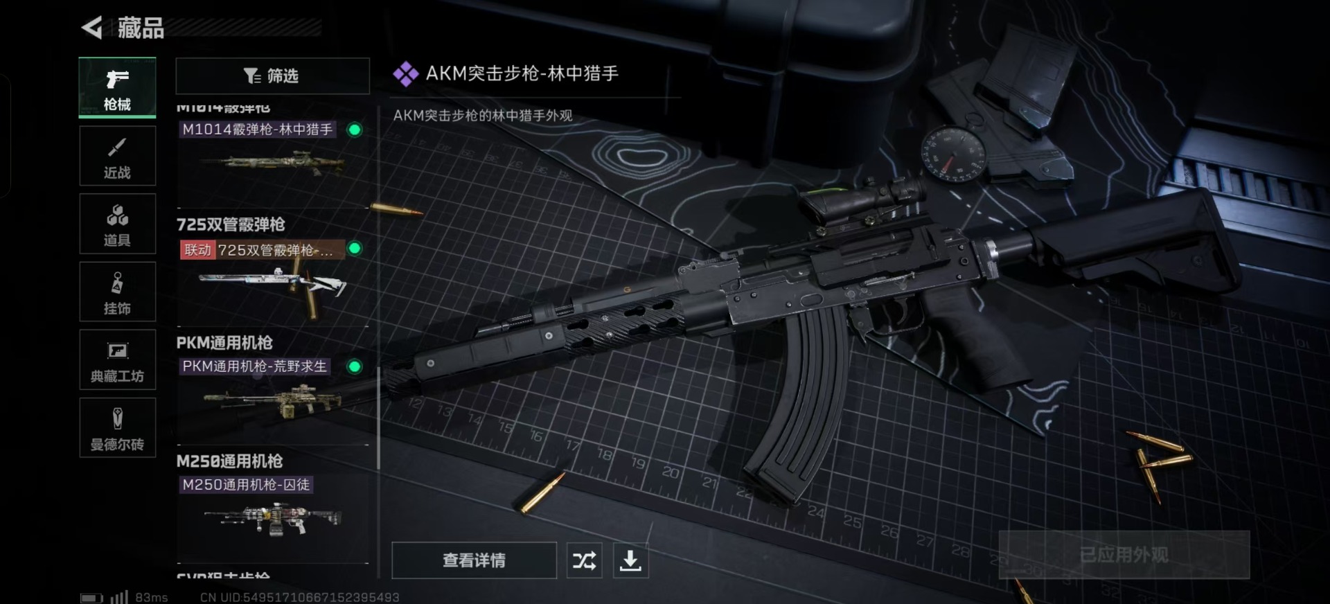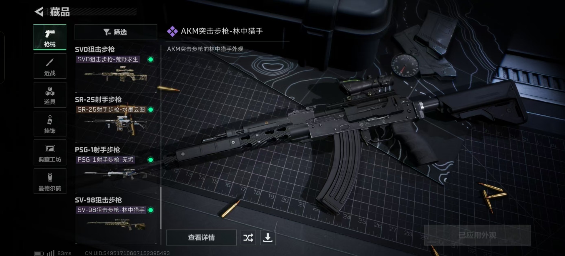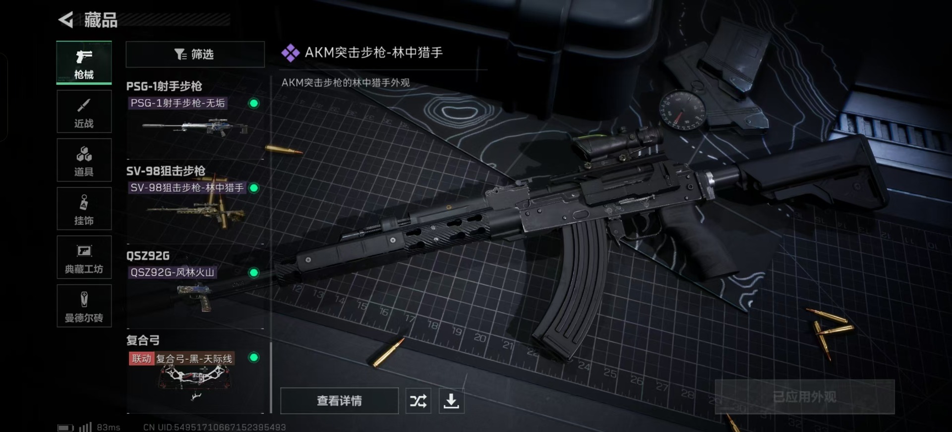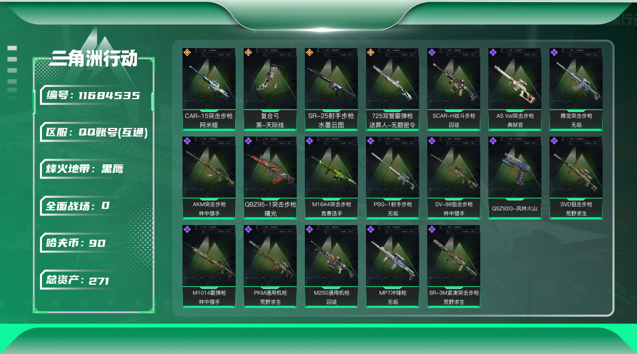 [11684535]总资产:271.8 4传说枪械 高级安全箱(2×3)9.15号到期 可二次 可修改实名 烽火地带段位:黑鹰 全面战场段位:列兵 哈夫币:90.202 传说武器皮肤:SR-25射手步枪-水墨云图,复合弓-黑-天际线,CAR-15突击步枪-阿米娅,725双管霰弹枪-送葬人-无题密令 史诗武器皮肤:PKM通用机枪-荒野求生,SR-3M紧凑突击步枪-荒野求生,AKM突击步枪-林中猎手,M16A4突击步枪-竞赛选手,SVD狙击步枪-荒野求生,M1014霰弹枪-林中猎手,SV-98狙击步枪-林中猎手,PSG-1射手步枪-无垢,AS Val突击步枪-典狱官,M250通用机枪-囚徒,SCAR-H战斗步枪-囚徒,腾龙突击步枪-无垢,MP7冲锋枪-无垢,QBZ95-1突击步枪-曙光,QSZ92G-风林火山