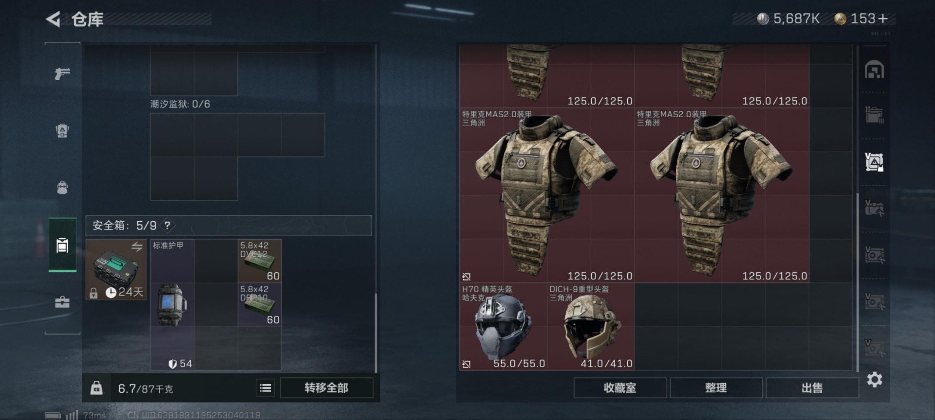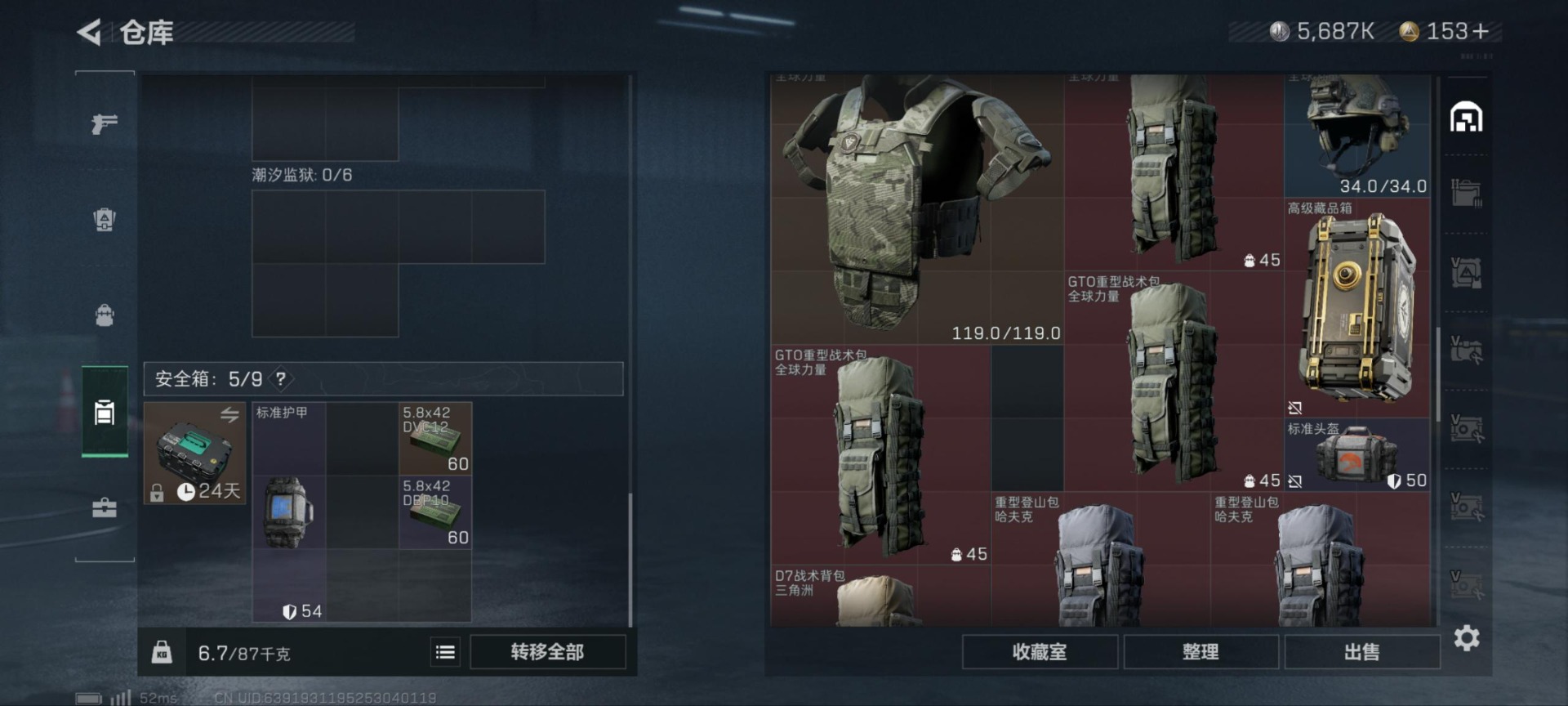 - [11819676]总资产:263.6 5传说枪械 顶级安全箱(3×3)9.15号到期 可二次 可修改实名 优质装备:顶级安全箱(3x3) 烽火地带段位:黄金 全面战场段位:无段位 哈夫币:144 传说武器皮肤:M16A4突击步枪-狩猎时刻,G3战斗步枪-狩猎时刻,Vector冲锋枪-狩猎时刻,复合弓-黑-天际线,CAR-15突击步枪-阿米娅 史诗武器皮肤:MP5冲锋枪-深海恐惧,SG552突击步枪-深海恐惧,AKM突击步枪-林中猎手,M1014霰弹枪-林中猎手,SV-98狙击步枪-林中猎手,S12K霰弹枪-曙光