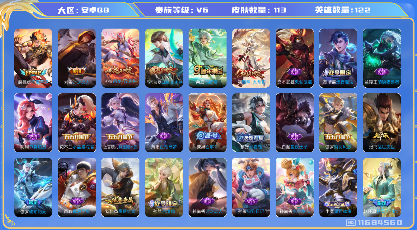 [11684560]V6 5传说 122英雄 113皮肤 可修改实名 优质装备:时之恋人-刘备(电焊工) 传说皮:乘龙·淬吴钩(孙策年限),祥瑞亨通 珍宝阁皮:妄想食味 限定皮:愿照·九州拓(澜年限),鸣野蒿,山海·玄木吟(马可年限) 史诗皮:器灵·浮梦炉,星界战将,龙之律动,茶境仙,蒙犽顽岩魄,上官婉儿群星魔术团,琥珀纪元伽罗,百相守梦-黄忠,紫霞仙子,百解令(蒙犽),高渐离燃音魔法,偶像歌手,猫狗日记-孙策,时之恋人-孙尚香,乱世虎臣,节奏热浪,摇滚巨星,水果甜心,天才门将,星夜王子,暗隐猎兽者,鬼剑武藏,暗渊魔法,舞动绿茵,纤云弄巧,水晶猎龙者,箭羽风息,鹰眼统帅