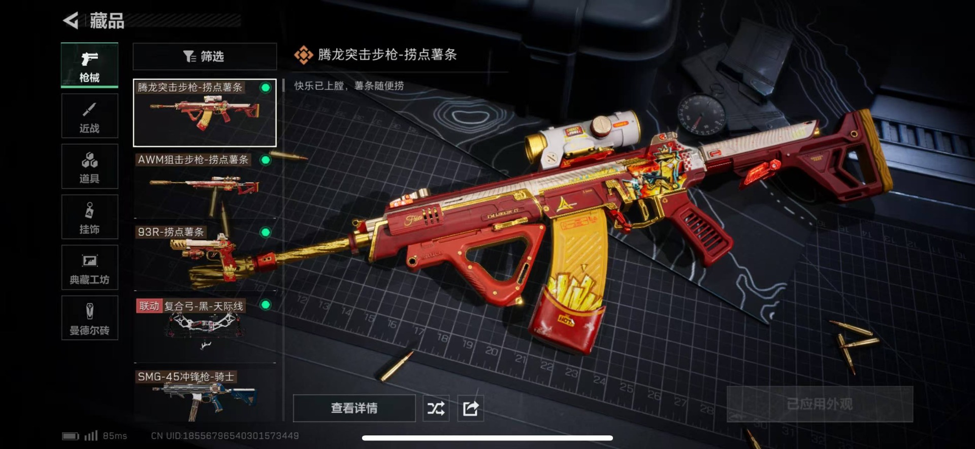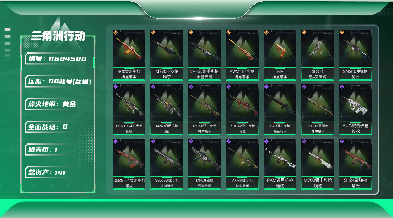[11684588]总资产:141.4 7传说枪械 进阶安全箱(9.17到期) 可二次 可修改实名 烽火地带段位:黄金 全面战场段位:尉官 哈夫币:1.470 传说武器皮肤:SR-25射手步枪-水墨云图,SMG45冲锋枪-骑士,93R-捞点薯条,腾龙突击步枪-捞点薯条,AWM狙击步枪-捞点薯条,复合弓-黑-天际线,M7战斗步枪-维京 史诗武器皮肤:AUG突击步枪-蝮蛇,M700狙击步枪-蝮蛇,PKM通用机枪-蝮蛇,MP5冲锋枪-深海恐惧,SG552突击步枪-深海恐惧,AKM突击步枪-林中猎手,SVD狙击步枪-暗夜猎手,M1014霰弹枪-林中猎手,SV-98狙击步枪-林中猎手,PTR-32突击步枪-英雄,M250通用机枪-囚徒,SCAR-H战斗步枪-囚徒,QBZ95-1突击步枪-曙光,UZI冲锋枪-危险实验,M249轻机枪-维京,SCAR-H战斗步枪-危险实验,沙漠之鹰-曙光,S12K霰弹枪-曙光,AS Val突击步枪-刀锋,QSZ92G-风林火山,93R-博士