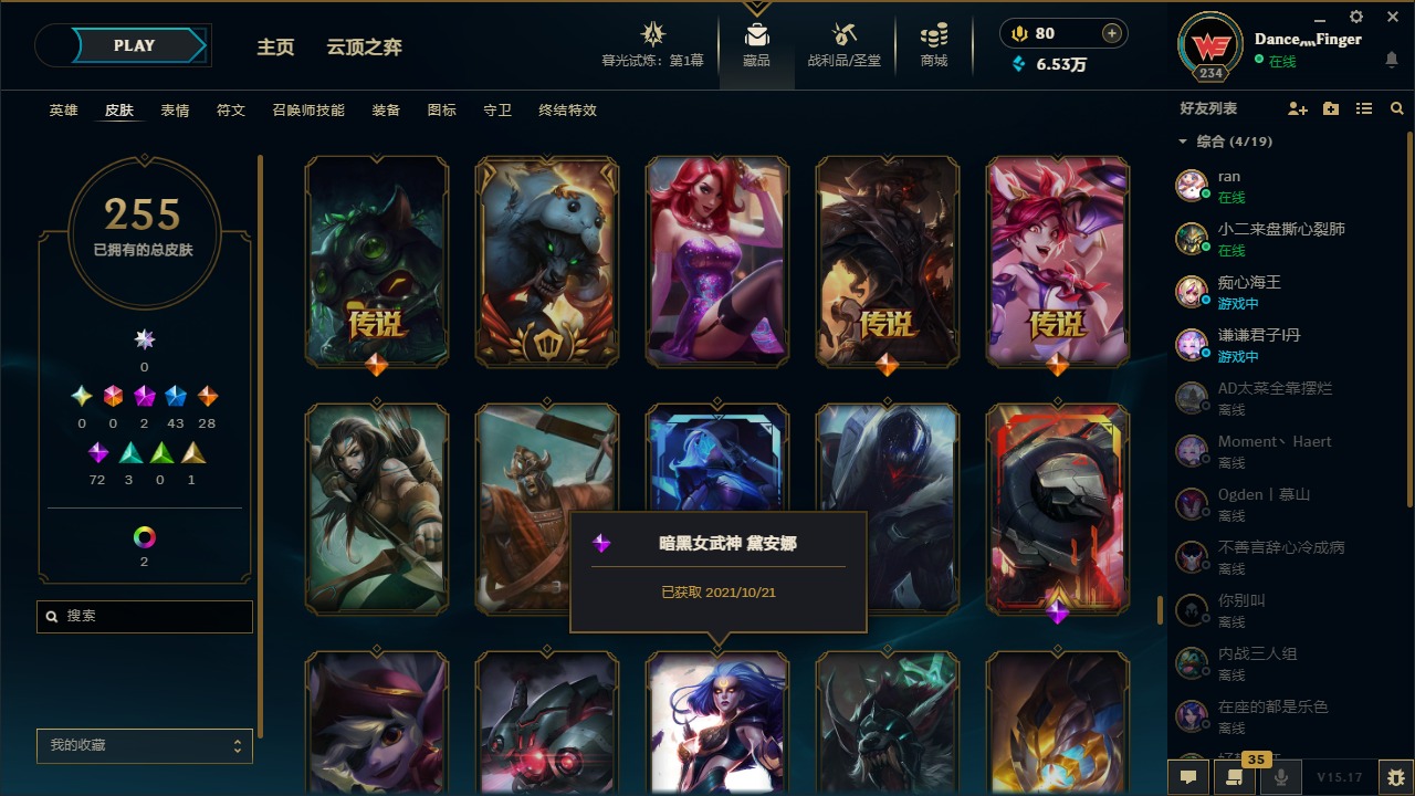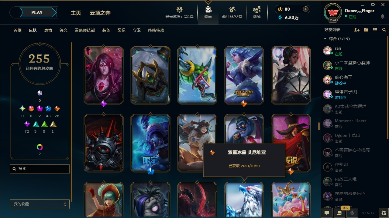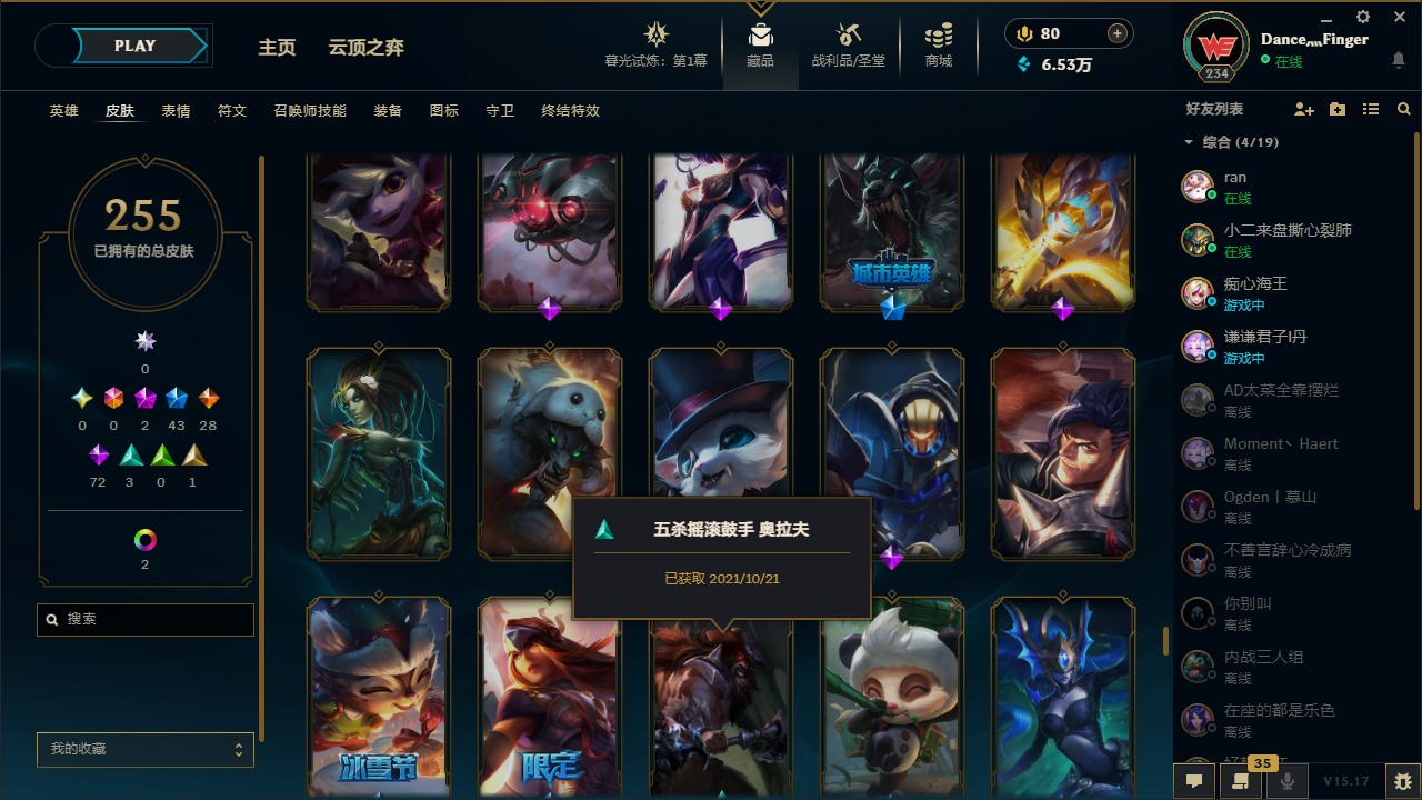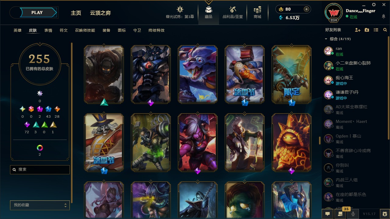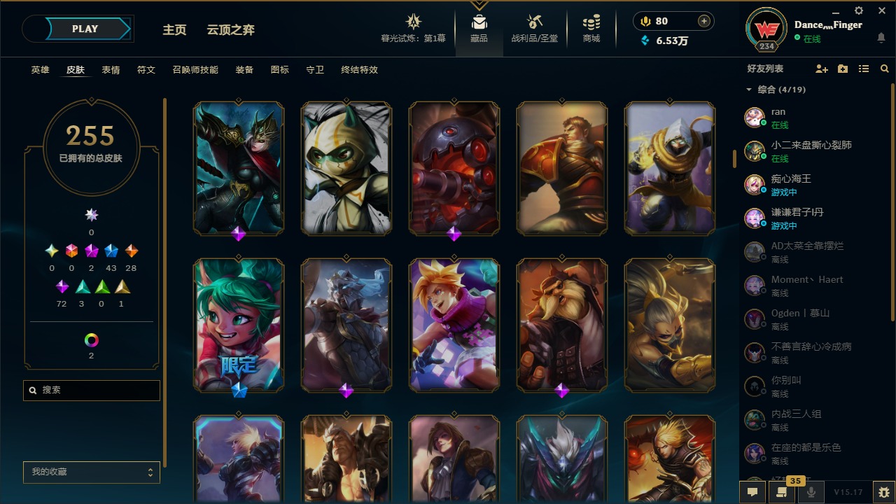 [11684599]2神话 43限定 28传说 72史诗 255皮肤 6炫彩 171英雄 可二次 可修改实名 优质装备:防爆天使 凯尔,暗影 沃里克,巧克力工坊 波比,都铎王朝 图奇,夺命美人 卡特,钢铁之翼 凤凰,冠军典狱长 锤石,冠军之箭 艾希,冠军之刃 锐雯,冠军之刃 锐雯 2016,警用试作体K-9 内瑟斯,蓝色忧郁 崔斯特,女猎手 希维尔,诺斯费拉图 弗拉基米尔,冠军之刃 锐雯 2016 凯旋圣装,外星装甲 库奇,净雪之月 莫甘娜 冬虹,魔女 阿卡丽 虚荣 海克斯:海克斯 安妮 赛季限定皮:胜利女神 希维尔,胜利之树 茂凯,胜利枪神 格雷福斯 冠军限定系列:S13 T1 李青,S1FNC 酒桶,S2 暗杀星 努努,S2 暗杀星 慎,S3 SKT T1 贾克斯,S3 SKT T1 李青,S4 SSW 图奇,S6 SKT T1 艾克 冰雪节限定:冰雪节 炼金,冬季仙境 发条,冬季仙境 卡尔玛,胡桃夹子 小丑,平安夜女神 娑娜,圣诞开心鬼 提莫,圣诞老人 酒桶,圣诞糖果棒 厄运小姐,圣诞驯鹿 克格莫,冰雪节 茂凯,幸福女神 乐芙兰,雪默丁格,英勇玩具兵船长 泳池派对:泳池派对 吉格斯 万圣节限定:鬼影森森 茂凯,鬼影重重 魔腾,魅惑女巫 奈德丽,南瓜头 费德提克,无头骑士 人马 周年:10周年 安妮