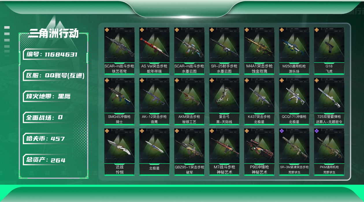 [11684631]可二次 可修改实名 实名:可修改 顶级安全箱(9.17到期) 烽火地带段位:黑鹰 全面战场段位:上等兵 总资产:264.8 哈夫币:457.414 传说武器皮肤:近战-怜悯,近战-北极星,AS Val突击步枪-蛇年祥瑞,SCAR-H战斗步枪-水墨云图,SR-25射手步枪-水墨云图,SCAR-H战斗步枪-铁艺苍穹,AK-12突击步枪-夜鹰,SMG45冲锋枪-骑士,AKM突击步枪-秘银工艺,复合弓-黑-天际线,725双管霰弹枪-送葬人-无题密令,QCQ171冲锋枪-北极星,K437突击步枪-北极星,M250通用机枪-游乐场,G18-飞虎,M4A1突击步枪-蚀金玫瑰,P90冲锋枪-神秘艺术,QBZ95-1突击步枪-破军,M7战斗步枪-神秘艺术 史诗武器皮肤:PKM通用机枪-荒野求生,SR-3M紧凑突击步枪-荒野求生,PSG-1射手步枪-无垢,M250通用机枪-囚徒,SCAR-H战斗步枪-囚徒 干员外观:红狼-蚀金玫瑰,骇爪-水墨云图,威龙-飞虎