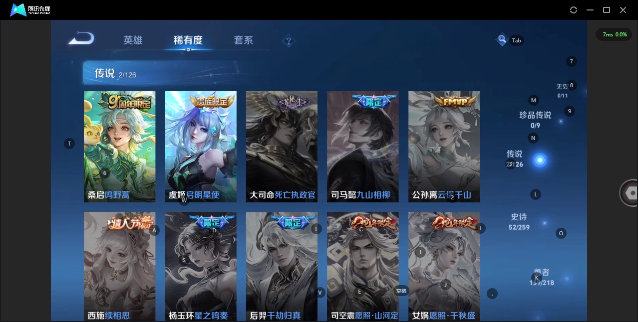 - [12090496]V7 2典藏 1珍品传说 8传说 125英雄 260皮肤 可修改实名 优质装备:鸣剑·曳影,弑枪猎影(韩信典藏),绛天战甲(鸡嘴战神),挚爱之约,山海·苍雷引(电光曜子) 珍品传说:时之奇旅-孙策 传说皮:乘龙·淬吴钩(孙策年限),幻光神枪 珍宝阁皮:妄想食味,蔷薇恋人 限定皮:愿照·九州拓(澜年限),逐霄战戟,鸣野蒿,傲雪梅枪,齐天大圣,五谷丰年,梁祝,岱宗(典韦年限),孙行者 史诗皮:鸭鸭历险记-刘禅,器灵·浮梦炉,化蝶舞,灵蛊蚀心,星界战将,谪仙醉月,龙之律动,石田雨龙,百相守梦-周瑜,茶境仙,怒海争锋,破空之剑,蒙犽顽岩魄,琥珀纪元伽罗,百相守梦-百里守约,织梦人,白龙吟,特工魅影,江河有灵,雪夜绮愿(周瑜),百解令(蒙犽),高渐离燃音魔法,蒙恬荣光圣徽,冰冠公主,青蛇,电玩·爆裂旋风,暗夜猫娘,猫狗日记-孙策,时之恋人-孙尚香,节奏热浪,女仆咖啡,水果甜心,星夜王子,功夫厨神,德古拉伯爵,暗隐猎兽者,幽灵船长,鬼剑武藏,心灵战警,舞动绿茵,地狱岩魂,纤云弄巧,繁星吟游(呼啦呼啦),拒霜思,缤纷独角兽,乘风破浪,逐浪之夏,水晶猎龙者,箭羽风息,金属风暴,原初追逐者,圣诞狂欢,圣诞恋歌,鹰眼统帅,暗夜贵公子,魅力维加斯,无心,未来纪元-赵云