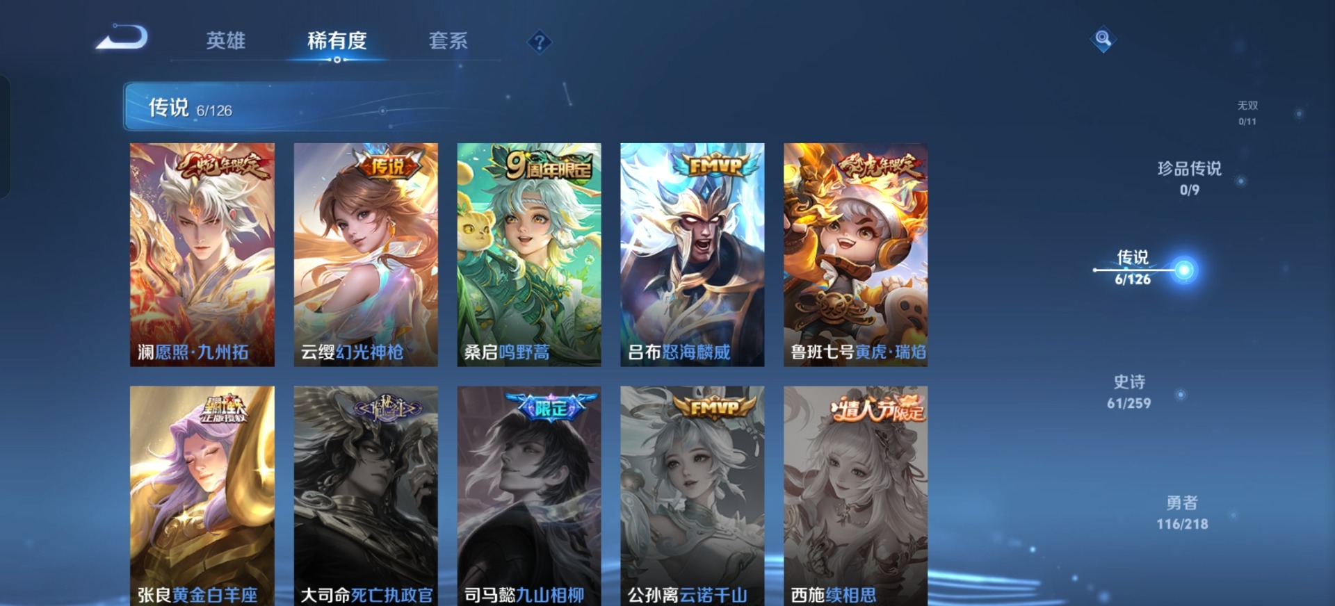 - PX_2069296-贵族7/皮肤212/传说6/史诗56/英雄124/女武神/地狱火/末日机甲女/零号赤焰/时雨天司/寅虎赤拳/深海之息/狰/狄仁杰阴阳师/凯尔特女王/赵云皇家上将/龙胆/墨子神迹守卫/白昼王子/狮舞东方/乒乒小将/蜃楼王/阿轲迷踪丽影/钟无艳王者之锤/妖精王/炼金王/重明/猎兽之王/赤莲之焰/云间偶戏/朔风刀/烛龙/穷奇/蓝屏警告/逐梦之星/暗影游猎/深海之息/狄仁杰魔术师/万