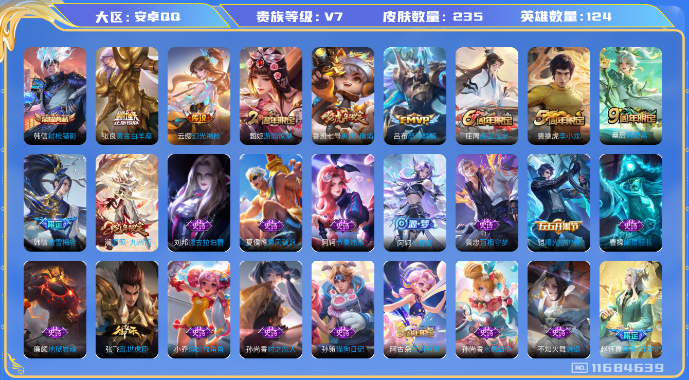 [11684639]V7 1典藏 6传说 124英雄 235皮肤 可修改实名 优质装备:弑枪猎影(韩信典藏),黄金白羊座 传说皮:幻光神枪 珍宝阁皮:万物之道,女武神 限定皮:愿照·九州拓(澜年限),鸣野蒿,傲雪梅枪,高山流水,怒海麟威,游园惊梦,李小龙,寅虎·瑞焰(虎皮蛋子) 史诗皮:鸭鸭历险记-刘禅,器灵·浮梦炉,化蝶舞,龙之律动,破空之剑,蒙犽顽岩魄,百相守梦-黄忠,紫霞仙子,黄金分割率,特工魅影,千年之狐,电玩·爆裂旋风,江河有灵,百解令(蒙犽),魅语,无限星赏官,晚萤,末日机甲-吕布,猫狗日记-孙策,时之恋人-孙尚香,乱世虎臣,节奏热浪,修罗,女仆咖啡,水果甜心,绅士熊喵,星夜王子,心灵骇客,时之奇旅-安琪拉,德古拉伯爵,幽灵船长,鬼剑武藏,舞动绿茵,地狱岩魂,拒霜思,缤纷独角兽,乘风破浪,水晶猎龙者,曙光守护者,金属风暴,原初追逐者,圣诞狂欢,圣诞恋歌,鹰眼统帅,暗夜贵公子,魅力维加斯,未来纪元-赵云