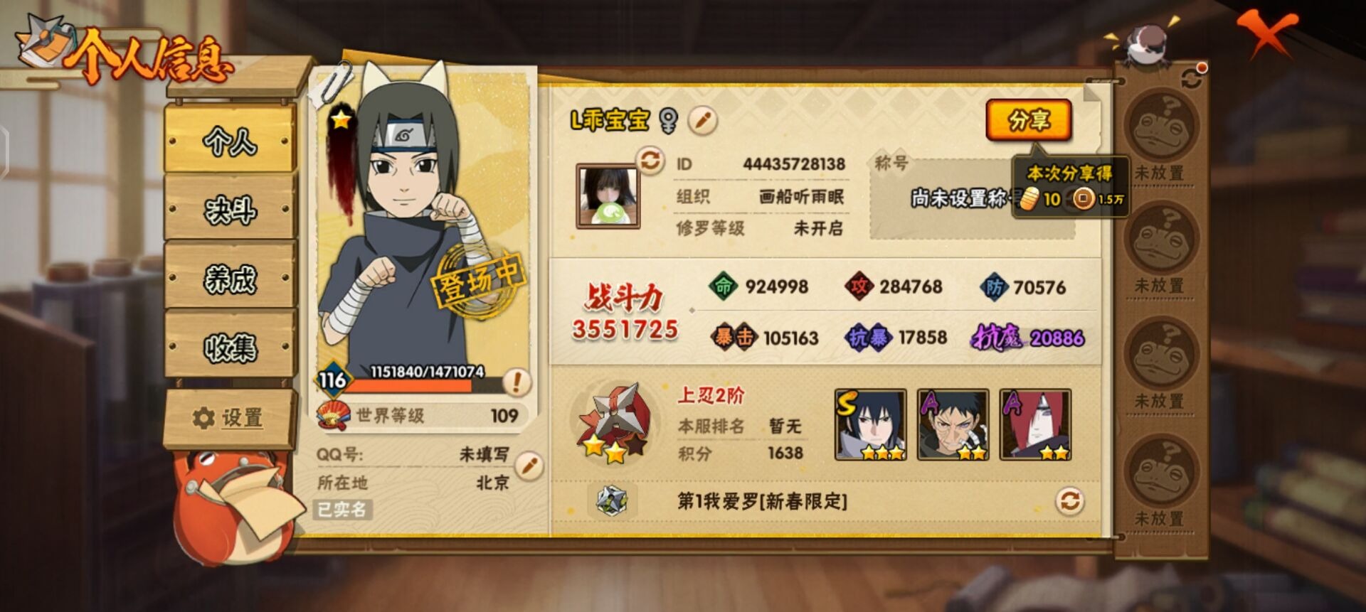 [11684641]V8 4S忍 14A忍 12通灵 355.1W战力 可二次 可修改实名 优质装备:宇智波鼬「秽土转生」,宇智波佐助「永恒万花筒」 S级忍者:自来也 「舞之豪杰」,宇智波鼬 「须佐能乎」