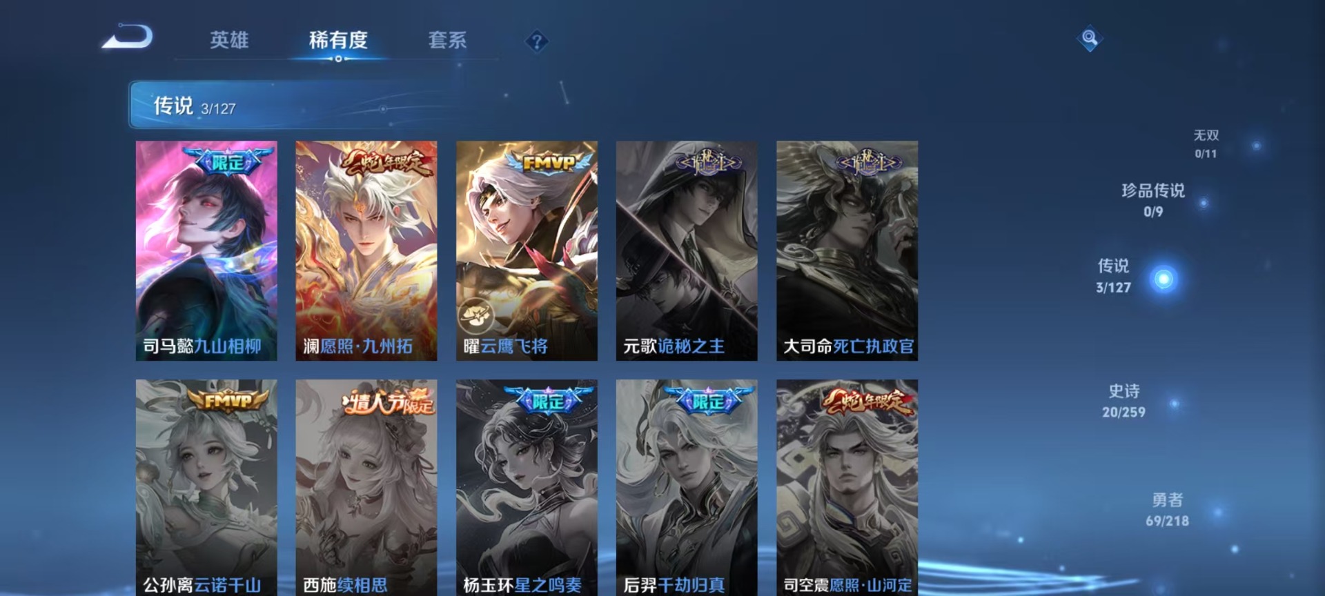 - PX_2061635-42 安卓QQ/永恒钻石/65皮肤/102英雄/0典藏/0珍品无双/0无双/0珍品传说/6传说/12史诗/5稀有英雄 【6 传说皮肤】胖达荣荣 梦奇,地狱火 孙悟空,一念神魔 李信,绛天战甲 铠,愿照·九州拓 澜,幻光神枪 云缨, 【12 史诗皮肤】末日机甲 吕布,紫霞仙子 露娜,五谷丰年 鬼谷子,鬼剑武藏 宫本武藏,魅力维加斯 妲己,鹰眼统帅 狄仁杰,孙行者 孙悟空,特工魅