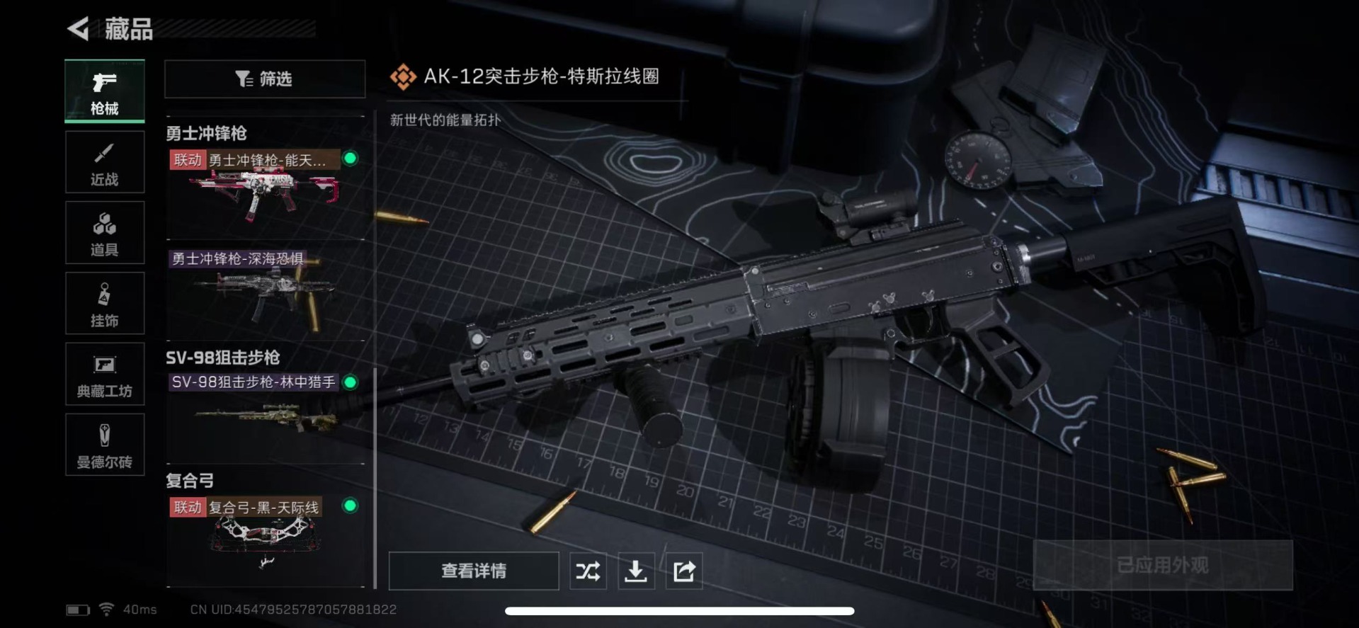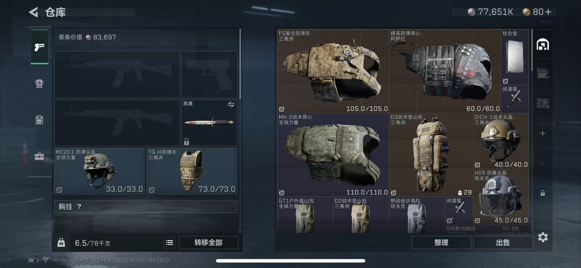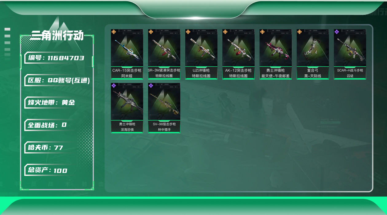 [11684703]总资产:100.3M 6传说枪械 哈夫币:77.651K 进阶安全箱(2×2)9.15号到期 可二次 可修改实名 烽火地带段位:黄金 全面战场段位:无段位 传说武器皮肤:CAR-15突击步枪-阿米娅,复合弓-黑-天际线,AK-12突击步枪-特斯拉线圈,SR-3M紧凑突击步枪-特斯拉线圈,UZI冲锋枪-特斯拉线圈,勇士冲锋枪-能天使-午夜邮差 史诗武器皮肤:勇士冲锋枪-深海恐惧,SV-98狙击步枪-林中猎手,SCAR-H战斗步枪-囚徒