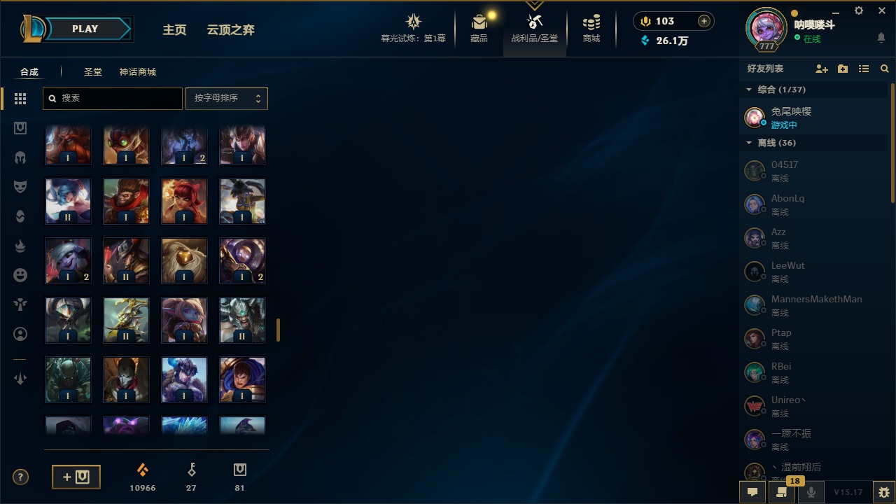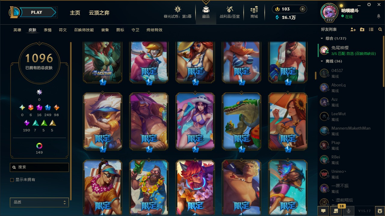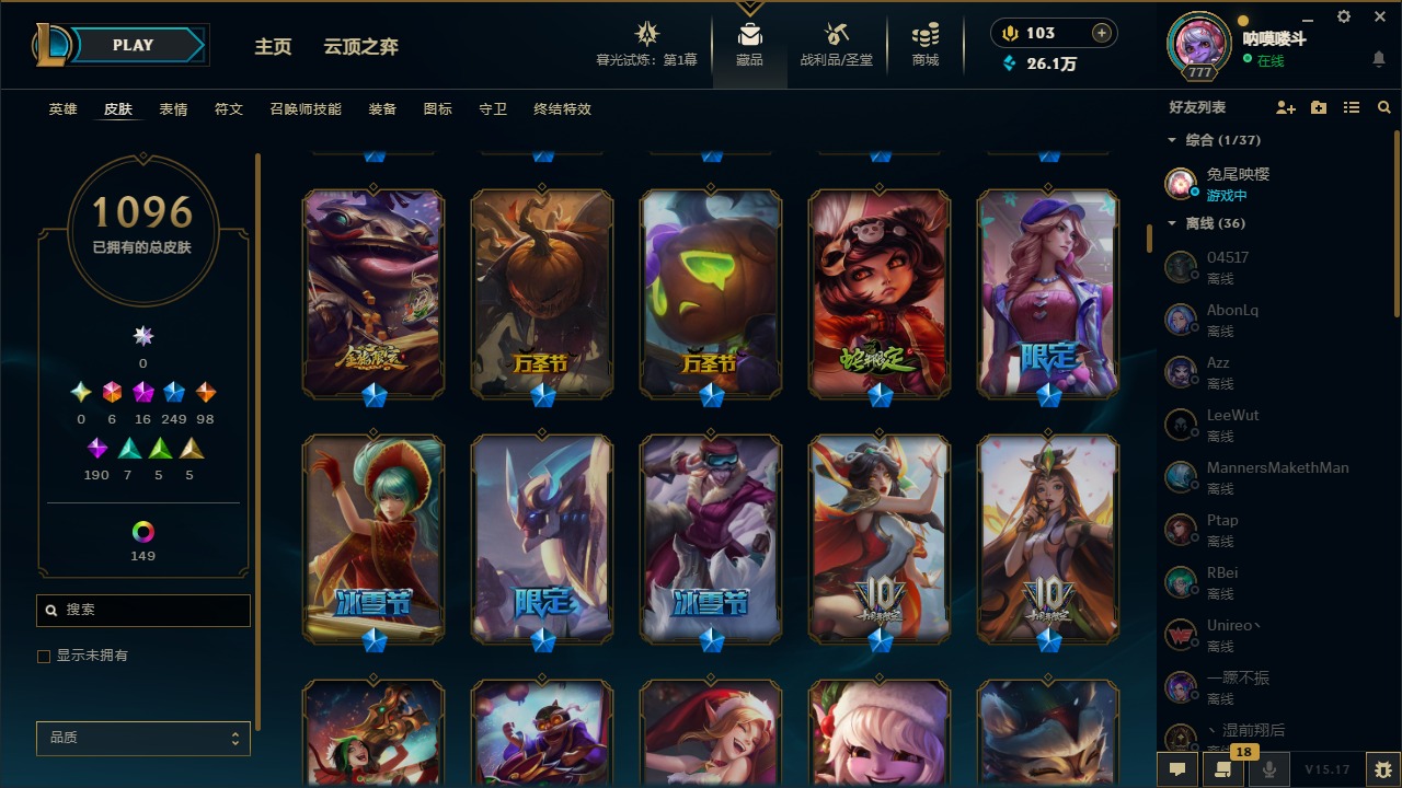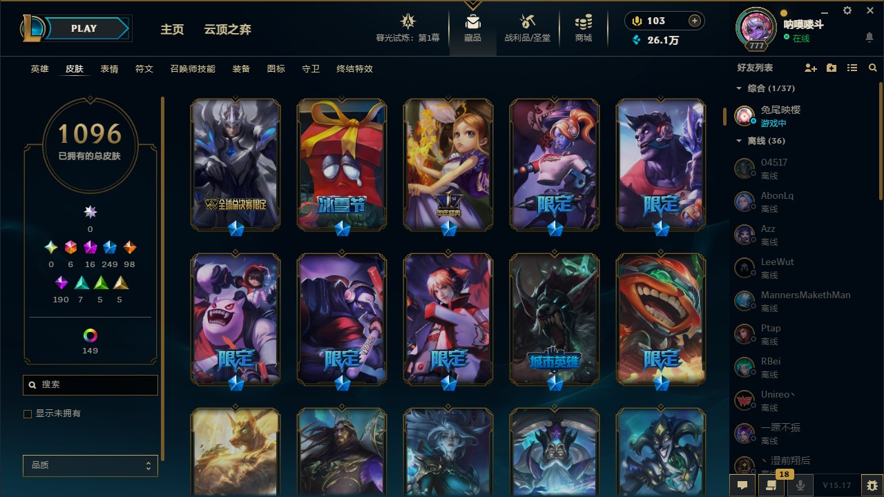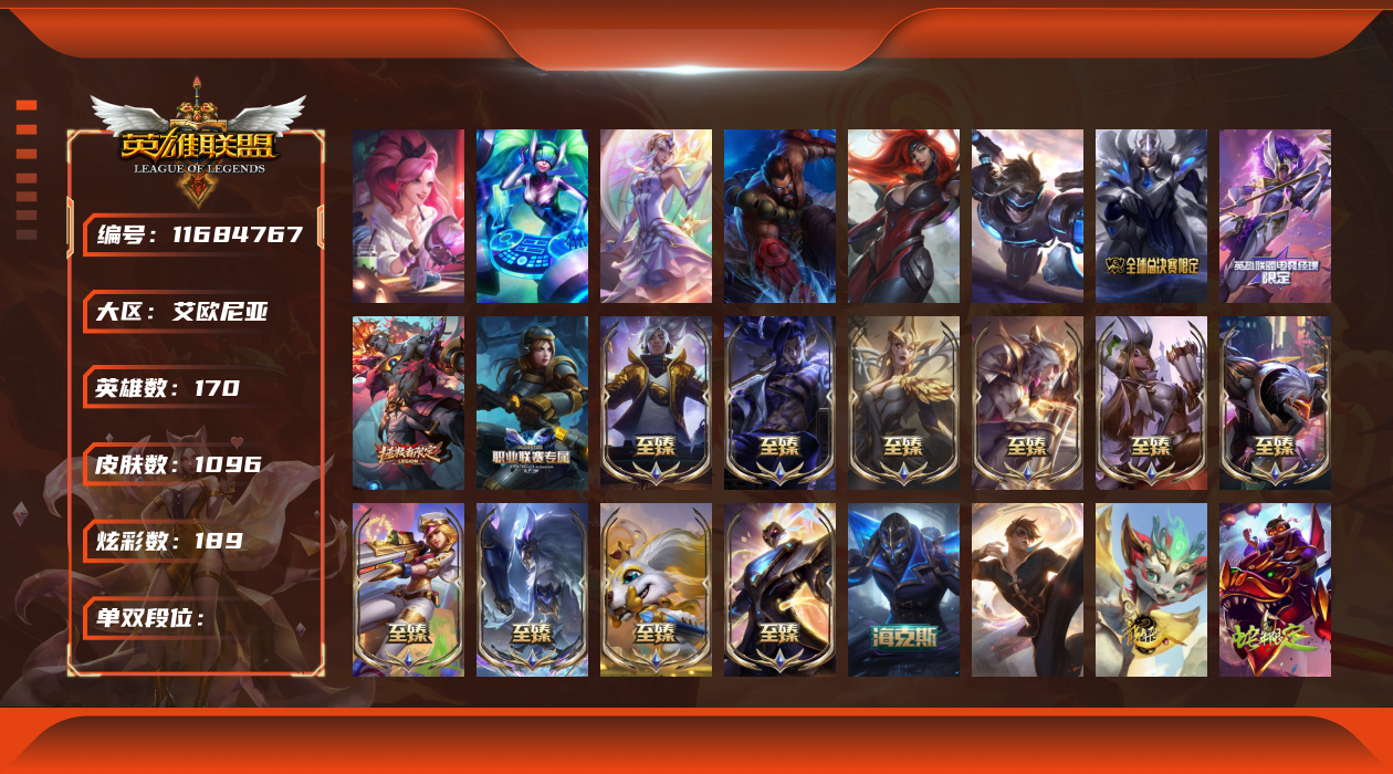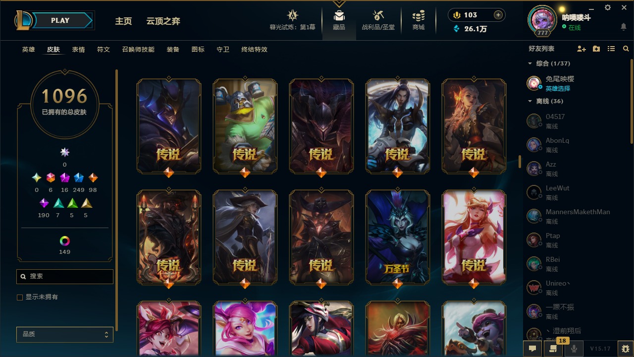 [11684767]6终极 16神话 249限定 98传说 190史诗 1096皮肤 189炫彩 170英雄 可二次 可修改实名 优质装备:至臻 未来战士 锤石,至臻 电玩女神 凯特琳,至臻 绒毛菲兹,至臻 魅惑女巫 厄运小姐,至臻 魔女 乐芙兰,至臻 女帝 黛安娜,至臻 源计划:阴 劫,至臻 真实伤害 亚索,源代码 乐芙兰,防爆天使 凯尔,暗影 沃里克,巧克力工坊 波比,创世纪 希维尔,地底世界 崔斯特,电玩战魂 人马,都铎王朝 图奇,夺命美人 卡特,防爆机器人 布里茨,防爆士兵 炼金,防爆士兵 格雷福斯,钢铁之翼 凤凰,冠军典狱长 锤石,冠军蔷薇 乐芙兰,冠军之箭 艾希,冠军之矛 滑板鞋,冠军之刃 锐雯 2016,冠军之血 希瓦娜,冠军之隐 劫,冠军之志 瑞兹,红桃杰克 崔斯特,惊悚派对 阿木木,惊悚派对 费德提克,警用试作体K-9 内瑟斯,克格汪 克格莫,蓝色忧郁 崔斯特,蒙多蒙多,密林猎手 提莫,破空枪骑 孙悟空,糖果使徒 费德提克,野兽猎人 德莱文,野兽猎人 瑟庄妮,野兽猎人 泰达米尔,永恒之森 乐芙兰,勇者 阿狸,勇者 奈德丽,战场BOSS 吉格斯,征服者 阿利斯塔,征服者 韦鲁斯,征服者 贾克斯,制胜金靴 李青,灰烬骑士 派克,大元素使,灵魂守卫,未来战士,武装战姬,DJ-娑娜,K/DA ALL OUT-萨勒芬妮 独立音乐人,征服者 诺提勒斯,卧虎藏龙 贾克斯,至臻 墨之影武者 亚索,2021 全球总决赛 嘉文四世,奥德赛 吉格斯,泳池派对 奥莉安娜 优雅珠光鲸,冠军之刃 锐雯 2016 凯旋圣装,源计划: 毁灭 派克 幻灭,星之吞噬者 莫甘娜 热情之末,外星装甲 库奇,可爱可爱粉红红 布里茨,冠军之隐 劫 凯旋圣装,至臻 绒毛 菲兹,神龙尊者 圣龙李青 登龙,净雪之月 莫甘娜 冬虹,墨之影武者 亚索 金墨耀影,十五周年纪念 希维尔,心之钢 伊泽瑞尔 天纵才华,魔女 阿卡丽 虚荣,王国机神 白虎 贾克斯 云霄,北极星钢影 卡蜜尔 智慧纽带,墨之影武者 易 金墨耀影,幻灵战斗兔 阿萝拉 梦幻强袭,定海神珍 孙悟空 四海扬威,红莲之刃 锐雯,剪纸仙灵 嘉文四世 日进斗金 海克斯:海克斯 卡萨丁 限定:斗魂觉醒 佛耶戈,星之守护者 芮尔,钢铁军团 拉克丝 情人节限定:穿心之剑 菲奥娜,觅心猎手 薇恩,觅心猫猫 悠米,觅心魔灵 奥利安娜,觅心游侠 卢锡安,觅心之翼 奎因,水晶玫