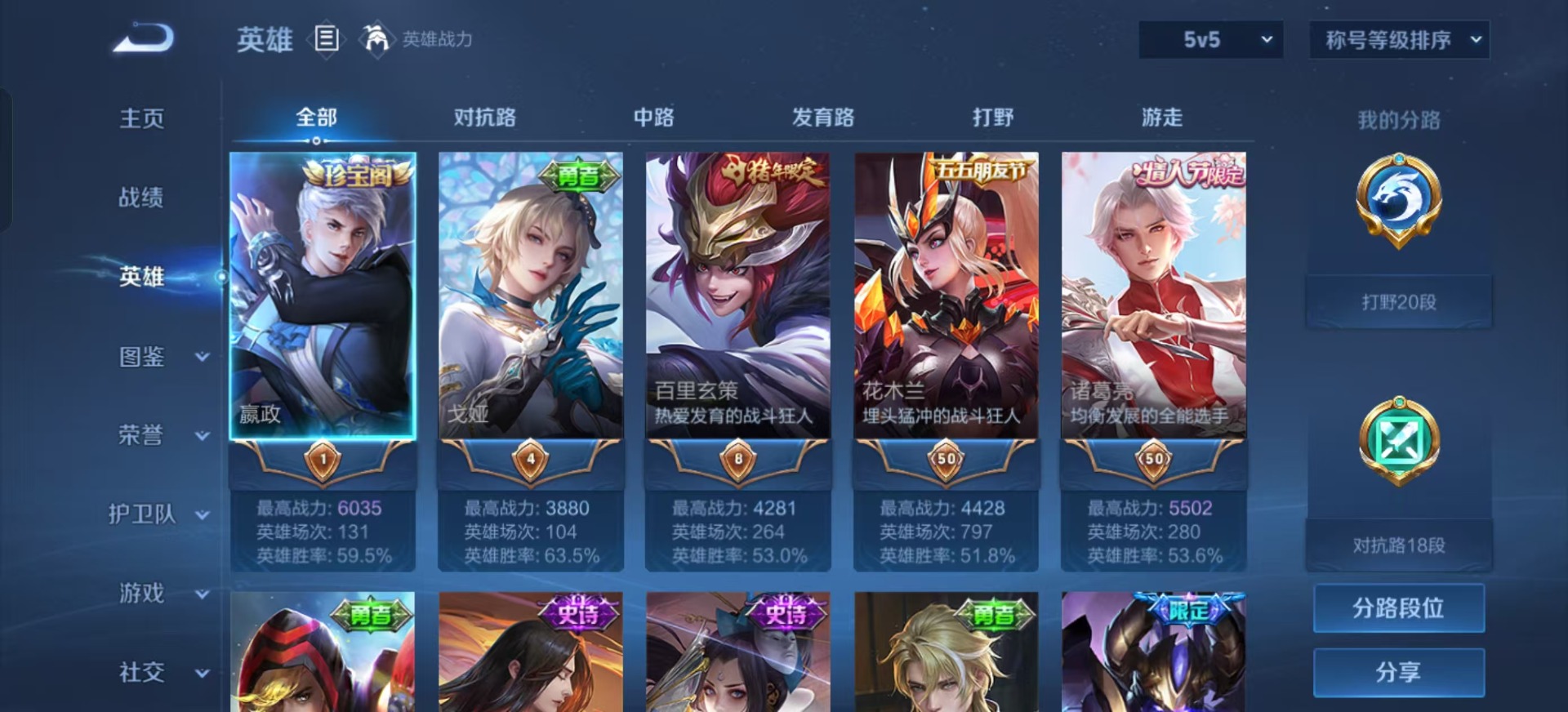 - PX_2086076-实名: 可修改 贵族等级: V5 英雄数: 97 皮肤数: 69 传说皮: 冠军飞将,幻光神枪 限定皮: 鸣野蒿,愿照·山河定,愿照·九州拓