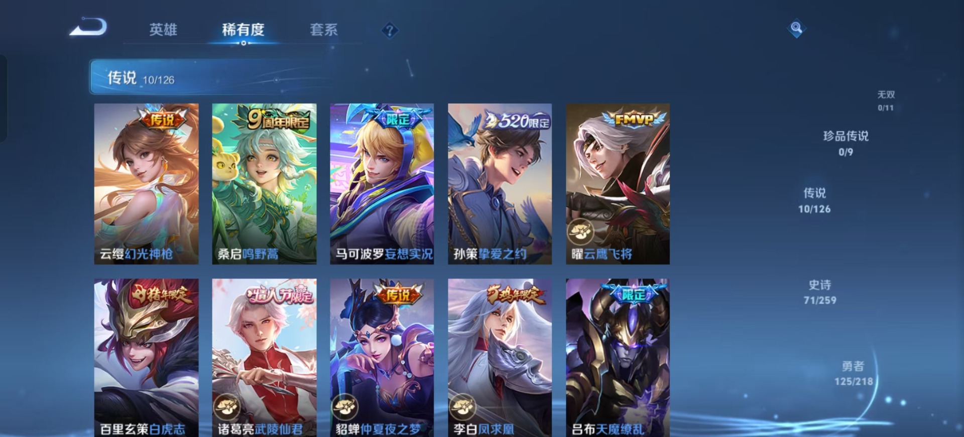 刘邦夺宝奇兵,夏侯惇朔风刀,老夫子醍醐杖,沈梦溪星空之诺,沈梦溪大漠名商,盾山御銮,曹操烛龙,孙膑妖精王,苏烈千军破阵,典韦穷奇,典韦蓝屏警告,达摩沙漠行僧,牛魔御旌,鲁班七号狮舞东方,吕布猎兽之王,庄周蜃楼王,兰陵王金庭之子,裴擒虎擒涛扼浪,鲁班大师探海日志,明世隐疑决卦,白起狰,鬼谷子原初探秘者,张良古海寻踪,桑启海盐诗旅,狄仁杰万华元夜,嬴政白昼王子,芈月重明,程咬金演武夺筹,扁鹊炼金王,李元芳银河之约,李元芳云中旅人,弈星混沌棋,虞姬凯尔特女王,米莱狄御霄,钟馗神迹守卫,钟馗驱傩正仪,狂铁御狮,太乙真人饕餮