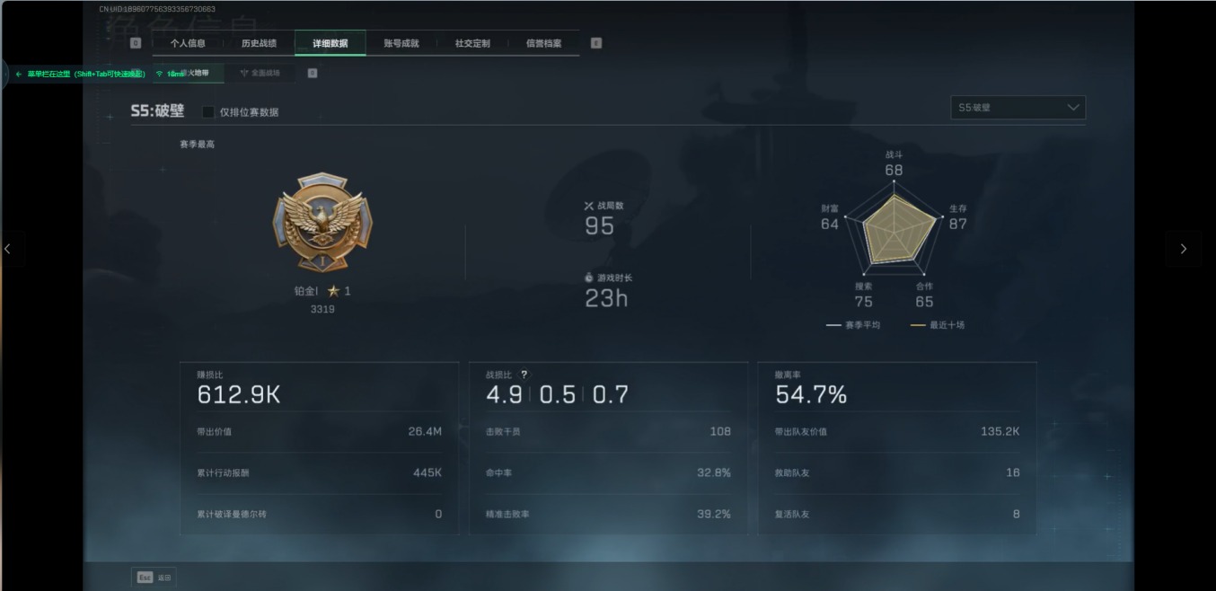 - [11762647]总资产:34.1M 4干员外观 2近战传说 19传说枪械 哈夫币:1.263K 可二次 可修改实名 优质装备:近战-影锋,近战-北极星,顶级安全箱(3x3) 烽火地带段位:钻石 全面战场段位:列兵 传说武器皮肤:SR-25射手步枪-水墨云图,SCAR-H战斗步枪-铁艺苍穹,SMG45冲锋枪-骑士,UZI冲锋枪-特斯拉线圈,AWM狙击步枪-捞点薯条,腾龙突击步枪-捞点薯条,93R-捞点薯条,AK-12突击步枪-特斯拉线圈,SR-3M紧凑突击步枪-特斯拉线圈,勇士冲锋枪-能天使-午夜邮差,复合弓-黑-天际线,K437突击步枪-北极星,QCQ171冲锋枪-北极星,725双管霰弹枪-送葬人-无题密令,M4A1突击步枪-阿米娅,AK-12突击步枪-夜鹰,M4A1突击步枪-蚀金玫瑰 史诗武器皮肤:PSG-1射手步枪-原型机(典藏),SR-3M紧凑突击步枪-英雄,PTR-32战斗步枪-ACE,QBZ95-1突击步枪-ACE,M4A1突击步枪-特勤执行,Vector冲锋枪-红色彗星,AUG突击步枪-特勤执行,SKS射手步枪-ACE,PKM通用机枪-蝮蛇,AUG突击步枪-蝮蛇,M700狙击步枪-蝮蛇,G3战斗步枪-战场英杰,SG552突击步枪-尖端治疗,QJB201轻机枪-Old Habits,M1014霰弹枪-林中猎手,PKM通用机枪-守夜人,AS Val突击步枪-尖端治疗,M700狙击步枪-守夜人,Ash-12战斗步枪-守夜人,SR-25射手步枪-尖端治疗,MP5冲锋枪-深海恐惧,勇士冲锋枪-深海恐惧,SG552突击步枪-深海恐惧,AKM突击步枪-林中猎手,.357左轮-幸运时刻,M16A4突击步枪-竞赛选手,SV-98狙击步枪-林中猎手,PTR-32突击步枪-英雄,AS Val突击步枪-典狱官,SV-98狙击步枪-囚徒,SCAR-H战斗步枪-囚徒,腾龙突击步枪-无垢,MP7冲锋枪-无垢,PSG-1射手步枪-无垢,SVD狙击步枪-荒野求生,SR-3M紧凑突击步枪-荒野求生,PKM通用机枪-荒野求生,QBZ95-1突击步枪-曙光,沙漠之鹰-曙光,Vector冲锋枪-阿萨拉文明,SVD狙击步枪-阿萨拉工艺,S12K霰弹枪-曙光,PKM通用机枪-英雄,M700狙击步枪-竞技风,QSZ92G-风林火山 干员外观:红狼-蚀金玫瑰,威龙-飞虎,蜂医-送葬人·无题密令(S5),露娜-黑·天际线