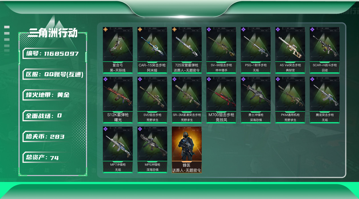 [11685097]总资产:74.6 1干员外观 3传说枪械 高级安全箱(9.17到期) 可二次 可修改实名 烽火地带段位:黄金 全面战场段位:上等兵 哈夫币:283.766 传说武器皮肤:复合弓-黑-天际线,CAR-15突击步枪-阿米娅,725双管霰弹枪-送葬人-无题密令 史诗武器皮肤:PKM通用机枪-荒野求生,MP5冲锋枪-深海恐惧,SR-3M紧凑突击步枪-荒野求生,勇士冲锋枪-深海恐惧,SVD狙击步枪-荒野求生,SV-98狙击步枪-林中猎手,PSG-1射手步枪-无垢,AS Val突击步枪-典狱官,SCAR-H战斗步枪-囚徒,腾龙突击步枪-无垢,MP7冲锋枪-无垢,S12K霰弹枪-曙光,M700狙击步枪-竞技风 干员外观:蜂医-送葬人·无题密令(S5)