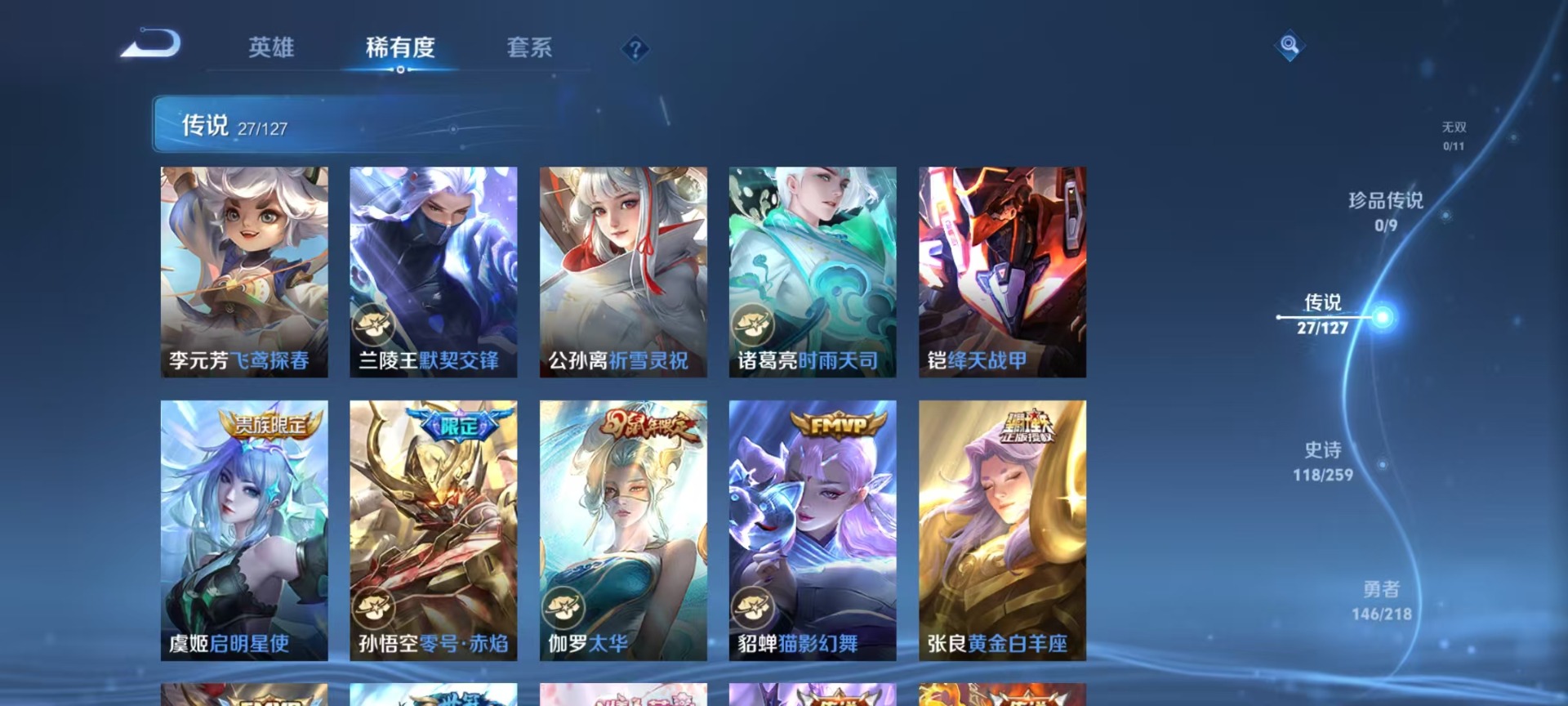 - PX_2077597-实名:,可修改,贵族等级:,V8,英雄数:,121,皮肤数:,278,荣耀水晶:,杀手不太冷,星传说:,幽冥火,金色仲夏夜,传说皮:,久胜战神,炽阳神光,一念神魔,地狱火,仲夏夜之梦,李逍遥,游龙清影,碎云,限定皮:,遇见飞天,李小龙,梁祝,引擎之心,天狼溯光者,神威,时之彼端,逐梦之音,青春决赛季,逐梦之星,凤求凰,美猴王,朱雀志,至尊宝,默契交锋-花木兰,高山流水,补天,
