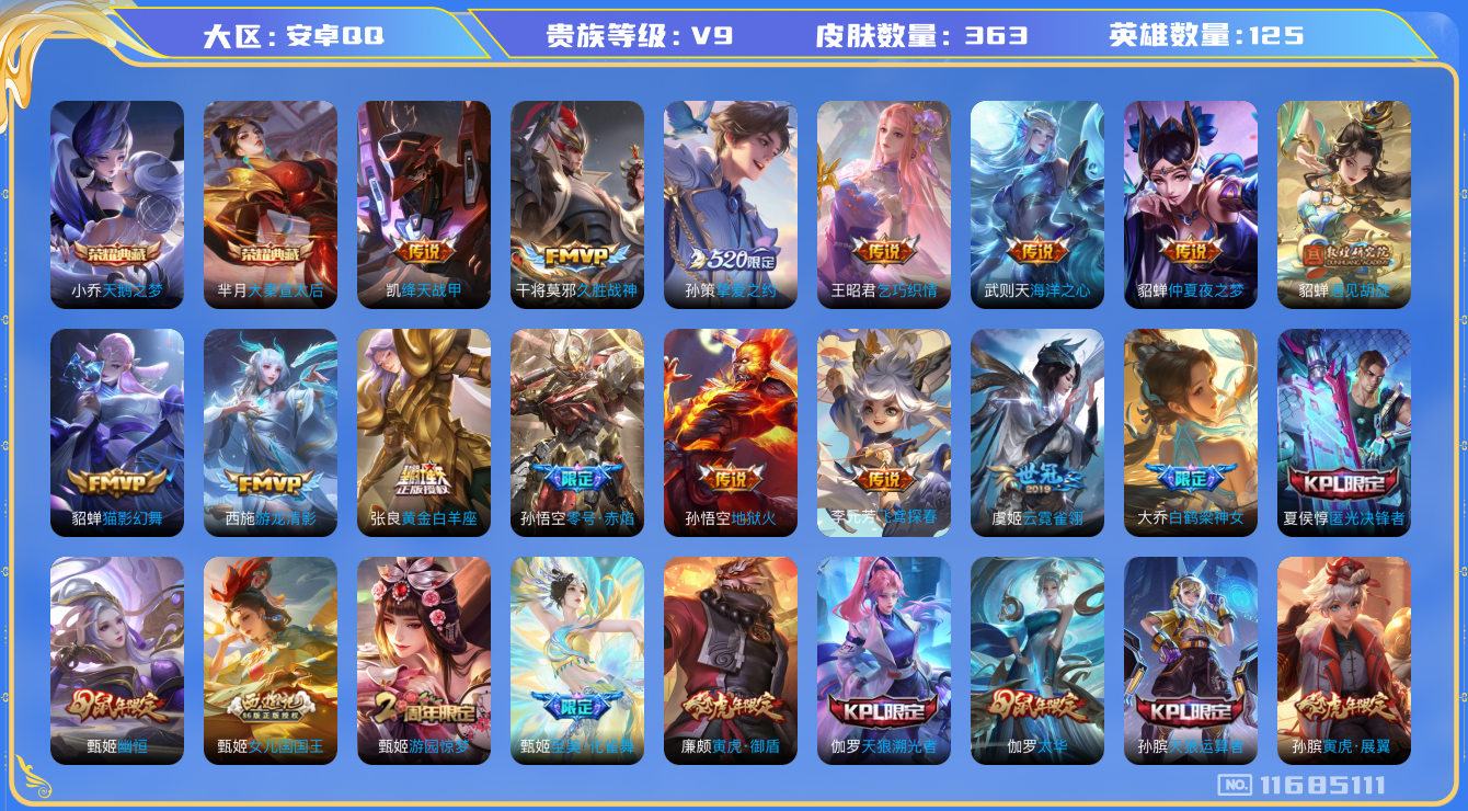 [11685111]V9 2典藏 27传说 125英雄 363皮肤 典藏英雄武则天 可修改实名 优质装备:天鹅之梦(小乔典藏),大秦宣太后,绛天战甲(鸡嘴战神),黄金白羊座,猫影幻舞,久胜战神,云霓雀翎,地狱火,仲夏夜之梦(大飞蛾),零号·赤焰,海洋之心,飞鸢探春,乞巧织情,游龙清影(小青龙),遇见胡旋,挚爱之约 珍宝阁皮:蔷薇恋人,女武神 限定皮:凤凰于飞,太华(伽罗年限),武陵仙君(小桃花),傲雪梅枪,补天,寅虎·展翼(孙膑年限),时之彼端,白鹤梁神女,魔法小厨娘,白晶晶,时雨天司(水龙头),玄嵩(庄周年限),至美·乘鲤谣,至美·化雀舞,遇见飞天,高山流水,匿光决锋者,五谷丰年,幽恒(沐浴露),天狼运算者,游园惊梦,梁祝,御风骁将(吕布年限),天狼溯光者,逐梦之音,奔雷神使(牛魔年限),祈雪灵祝(雪兔子),天狼绘梦者,李小龙,逐梦之光,如梦令-后羿,霸王别姬-项羽,霸王别姬-虞姬,奇迹圣诞,默契交锋-兰陵王,默契交锋-花木兰,孙行者,猪悟能,天魔缭乱,冰霜恋舞曲,乒乒小将,热情桑巴,女儿国国王,寅虎·御盾(廉颇年限),寅虎·瑞焰(虎皮蛋子),寅虎·心曲(虎婆),寅虎·赤拳(老虎年限),时之祈愿-瑶(瑶传限),无尽星芒 史诗皮:化蝶舞,龙之律动,百相守梦-周瑜,守夜人,紫霞仙子,苍穹之光,电玩小子(小书包),特工魅影,江河有灵,百解令(蒙犽),蒙恬荣光圣徽,偶像歌手,龙骑士(小龙虾),暗夜猫娘,魅语,冰冠公主,青蛇,时之恋人-孙尚香,乱世虎臣,节奏热浪,女仆咖啡,摇滚巨星,水果甜心,绅士熊喵,天才门将,星夜王子,心灵骇客,时之奇旅-安琪拉,功夫厨神,德古拉伯爵,暗隐猎兽者,幽灵船长,鬼剑武藏,心灵战警,舞动绿茵,地狱岩魂,诗语江南,纤云弄巧,繁星吟游(呼啦呼啦),拒霜思,缤纷独角兽,乘风破浪,逐浪之夏,水晶猎龙者,曙光守护者,箭羽风息,唤灵魅影,金属风暴,原初追逐者,圣诞狂欢,圣诞恋歌,鹰眼统帅,魅力维加斯,黎明之约,奇遇舞章,天秀·音浪,寅虎·御盾,千筹问战,无心,未来纪元-赵云