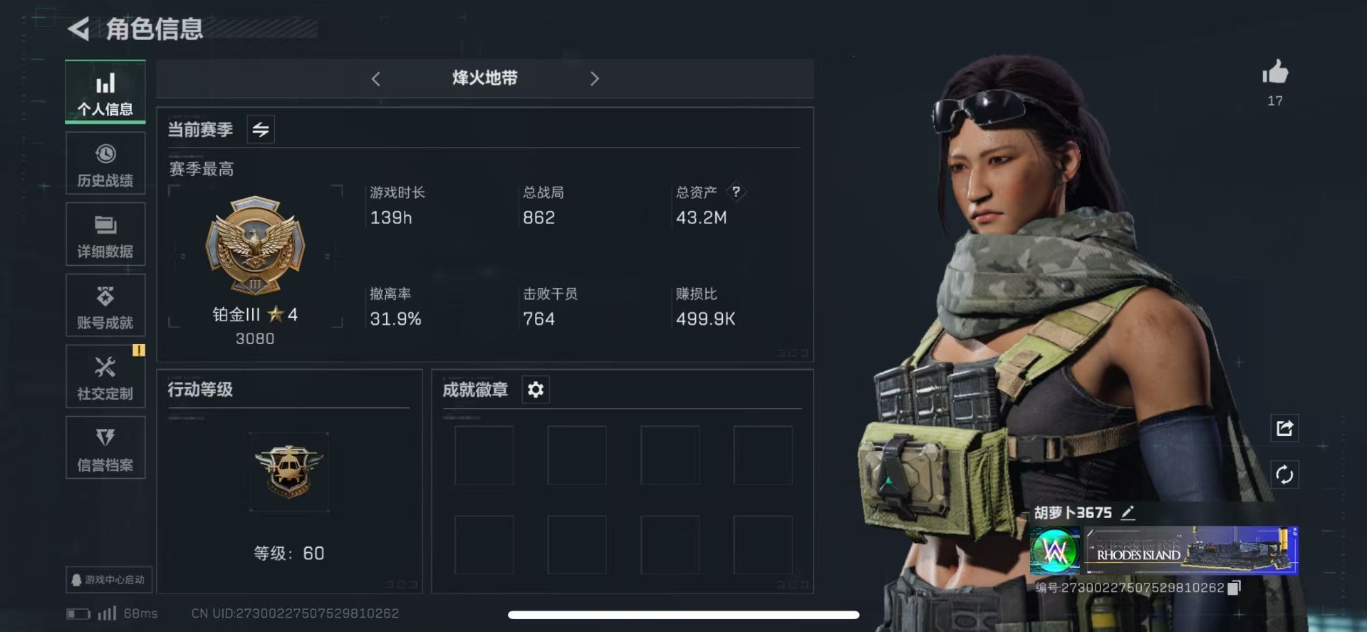 - [10850952]hf2637 总资产110m 纯币54m +水墨云图骇爪全套+s3赛季通行证+烽火等级60 特勤部门等级很高 永久包赔