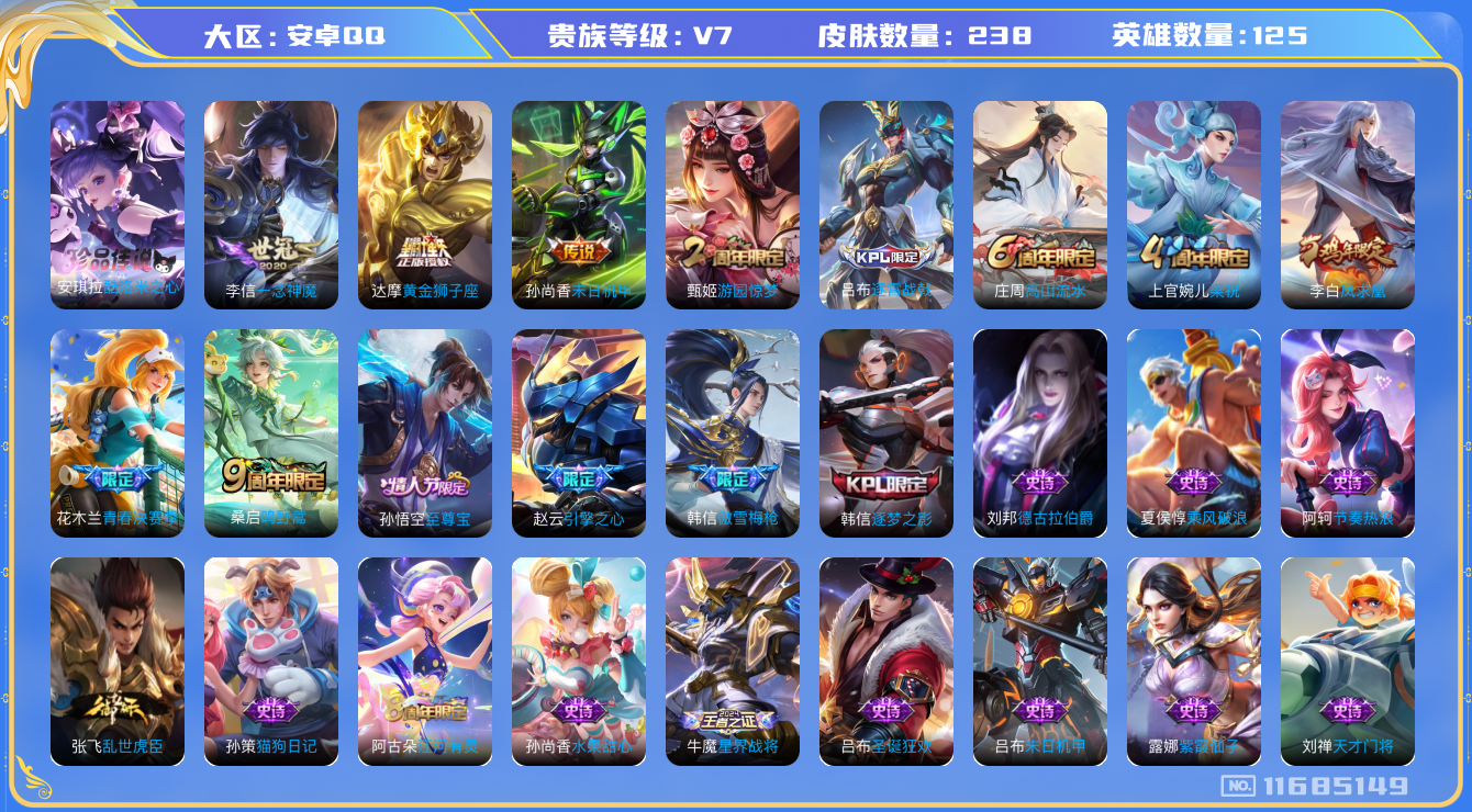 - [11991730]V7 1典藏 4传说 125英雄 209皮肤 可修改实名 优质装备:九霄神辉(木兰典藏),冠军飞将,云鹰飞将(小将军) 传说皮:幻光神枪 珍宝阁皮:妄想食味,女武神 限定皮:愿照·九州拓(澜年限),神威(电光马子),瑞麟志(木兰年限),遇见飞天,冰锋战神,游园惊梦,梁祝,逐梦之星,李小龙,朱雀志(守约年限),默契交锋-花木兰,猪悟能,一生所爱,大圣娶亲,冰霜恋舞曲,云端筑梦师 史诗皮:苍鳞隐世,百相守梦-黄忠,紫霞仙子,电玩小子(小书包),黄金分割率,千年之狐,无限星赏官,偶像歌手,晚萤,电玩·爆裂旋风,龙骑士(小龙虾),末日机甲-吕布,猫狗日记-孙策,节奏热浪,修罗,摇滚巨星,水果甜心,天才门将,德古拉伯爵,幽灵船长,鬼剑武藏,地狱岩魂,纤云弄巧,繁星吟游(呼啦呼啦),缤纷独角兽,水晶猎龙者,原初追逐者,圣诞狂欢,圣诞恋歌,鹰眼统帅,黎明之约,无心
