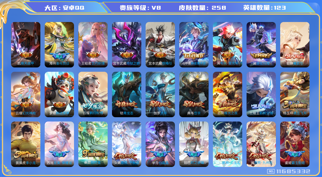 [11685332]V8 20传说 123英雄 258皮肤 可修改实名 优质装备:绛天战甲(鸡嘴战神),地狱之眼,胖达荣荣,乞巧织情,电玩·雷克斯,鹤归松栖(云缨),惊梅引,澜逐花归海,金乌负日,云中君群星魔术团 传说皮:貂蝉曦玄引,幻光神枪 珍宝阁皮:妄想食味 限定皮:愿照·九州拓(澜年限),愿照·岁时盈(虞姬年限),愿照·众生和(妲己年限),愿照·千秋盛(女娲年限),鸣野蒿,太华(伽罗年限),时之彼端,白晶晶,至美·乘鲤谣,遇见飞天,青龙志(铠年限),岱宗(典韦年限),李小龙,辉光之辰,霸王别姬-虞姬,默契交锋-兰陵王 史诗皮:鸭鸭历险记-刘禅,器灵·浮梦炉,化蝶舞,星界战将,龙之律动,茶境仙,破空之剑,涂山红红,东方月初,埋骨钱,怒海争锋,上官婉儿群星魔术团,蔬乡物语(鲁班七号),百相守梦-黄忠,紫霞仙子,黄金分割率,特工魅影,千年之狐,浮梦罗烟,江河有灵,百解令(蒙犽),高渐离燃音魔法,蒙恬荣光圣徽,偶像歌手,魅语,晚萤,猫狗日记-大乔,节奏热浪,修罗,摇滚巨星,水果甜心,绅士熊喵,心灵骇客,功夫厨神,幽灵船长,鬼剑武藏,心灵战警,地狱岩魂,纤云弄巧,拒霜思,乘风破浪,逐浪之夏,水晶猎龙者,曙光守护者,箭羽风息,金属风暴,圣诞狂欢,鹰眼统帅,魅力维加斯,赏金猎手,滕王阁序,未来纪元-赵云