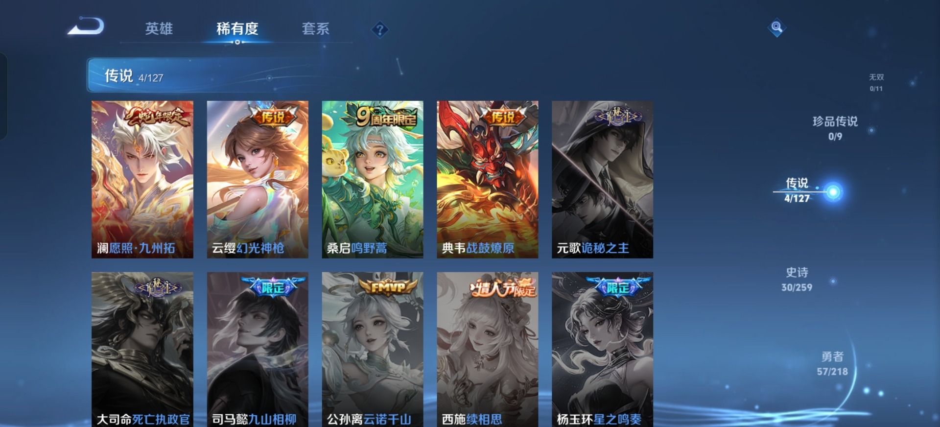 - [11883653]V7 1典藏 1珍品传说 8传说 124英雄 205皮肤 可修改实名 优质装备:弑枪猎影(韩信典藏),器灵·落星盏,猫影幻舞,一念神魔,末日机甲-孙策 传说皮:幻光神枪 珍宝阁皮:优雅恋人,蔷薇恋人,女武神 限定皮:愿照·岁时盈(虞姬年限),逐霄战戟,至尊宝,武陵仙君(小桃花),飞衡(韩信年限),高山流水,诗剑行,怒海麟威,五谷丰年,游园惊梦,岱宗(典韦年限),孙行者,引擎之心 史诗皮:器灵·浮梦炉,化蝶舞,星界战将,龙之律动,茶境仙,百相守梦-百里守约,紫霞仙子,苍穹之光,黄金分割率,特工魅影,江河有灵,蒙恬荣光圣徽,偶像歌手,暗夜猫娘,末日机甲-吕布,猫狗日记-孙策,时之恋人-孙尚香,乱世虎臣,节奏热浪,女仆咖啡,摇滚巨星,水果甜心,绅士熊喵,天才门将,星夜王子,心灵骇客,功夫厨神,德古拉伯爵,暗隐猎兽者,幽灵船长,鬼剑武藏,心灵战警,舞动绿茵,地狱岩魂,纤云弄巧,拒霜思,缤纷独角兽,乘风破浪,逐浪之夏,水晶猎龙者,金属风暴,原初追逐者,圣诞恋歌,鹰眼统帅,魅力维加斯,黎明之约,无心,未来纪元-赵云