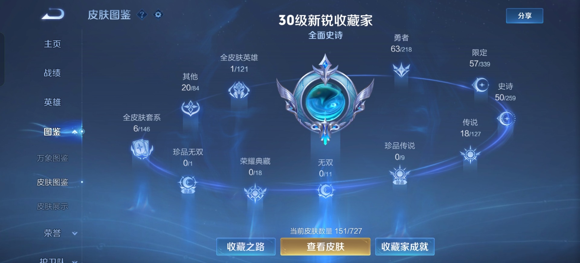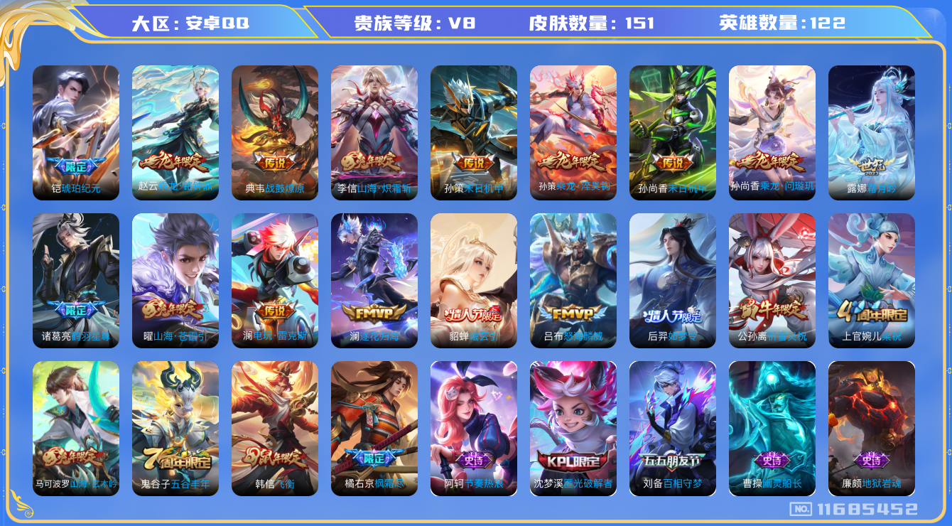 - PX_2082080-贵族等级: V7 英雄数: 122 皮肤数: 211 荣耀水晶: 全息碎影,弑枪猎影 传说皮: 黄金狮子座,云鹰飞将,时之恋人-刘备,澜逐花归海,乘龙·问璇玑,乘龙·淬吴钩,落雪白狼 限定皮: 李小龙,梁祝,大圣娶亲,寅虎·赤拳,五谷丰年,山海·玄木吟,齐天大圣,鸣野蒿,逐霄战戟