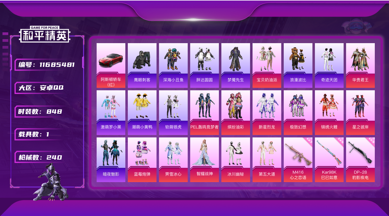 - PX_2102184- 安卓手Q-4王牌印记-10粉装-5特效枪-1载具-67134热力值-149套装-182枪皮-1卓越印记-0传奇印记 【10粉装】,梦幻火箭,宝贝奶油派,天使彩虹糖,第五大道,深海曼妙,寒光使者,妙趣可丽,萨利娅,旋转彩虹,冰霜白皇 【5特效枪】SCAR-L-青春物语-7级 GROZA-镜光银凌-5级 AUG-暖羊咩咩-5级 Kar98K-巳巳如意-5级 Mk14-盛世惊鸿-