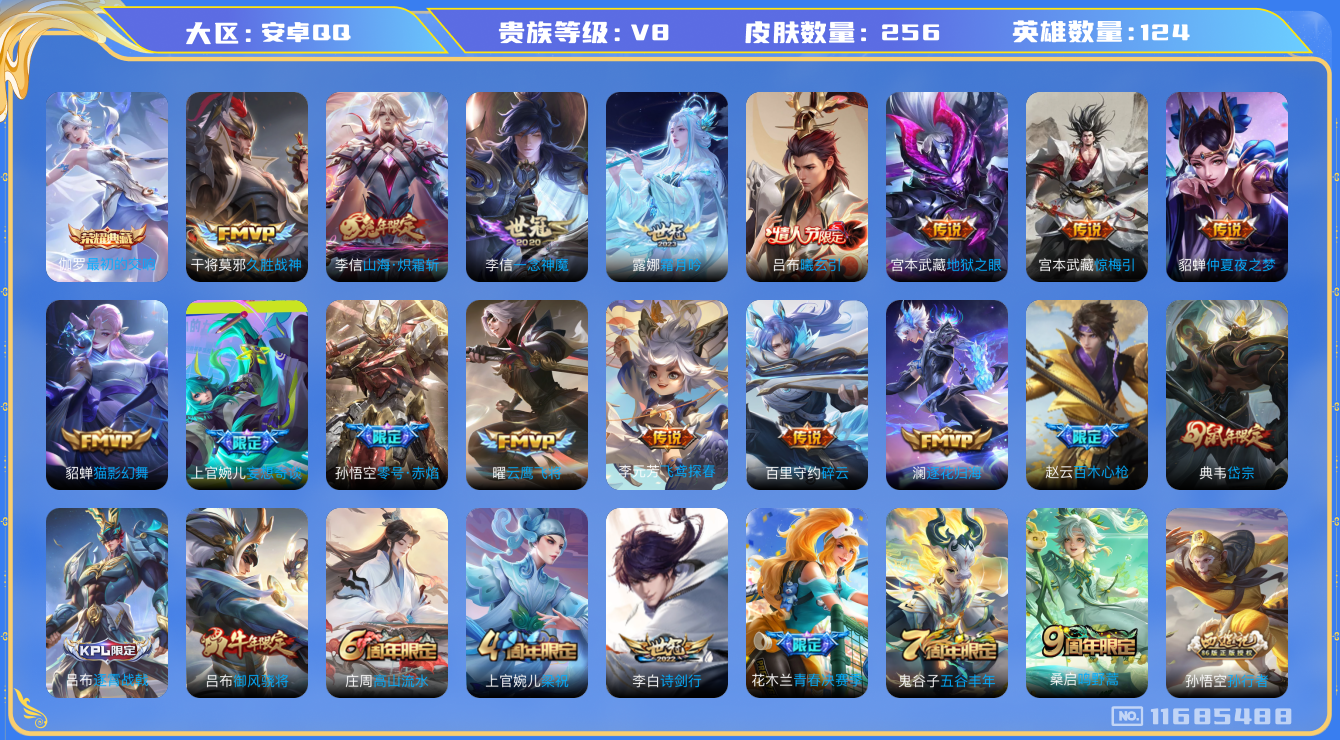 [11685488]V8 1典藏 18传说 124英雄 256皮肤 可修改实名 优质装备:最初的交响(伽罗典藏),云鹰飞将(小将军),猫影幻舞,久胜战神,一念神魔,仲夏夜之梦(大飞蛾),零号·赤焰,地狱之眼,飞鸢探春,碎云,山海·炽霜斩(李信年限),妄想奇谈,惊梅引,霜月吟,澜逐花归海 传说皮:吕布曦玄引 珍宝阁皮:妄想食味,玩趣恶龙 限定皮:逐霄战戟,鸣野蒿,傲雪梅枪,时之彼端,高山流水,诗剑行,五谷丰年,梁祝,御风骁将(吕布年限),岱宗(典韦年限),朱雀志(守约年限),孙行者,大圣娶亲,引擎之心,青春决赛季,百木心枪,时之奇旅-妲己 史诗皮:化蝶舞,茶境仙,破空之剑,谪仙醉月,上官婉儿群星魔术团,蔬乡物语(鲁班七号),琥珀纪元伽罗,百相守梦-百里守约,百相守梦-黄忠,紫霞仙子,电玩小子(小书包),黄金分割率,特工魅影,千年之狐,电玩·爆裂旋风,浮梦罗烟,真我赫兹(百里守约),匿光侦查者,江河有灵,百解令(蒙犽),高渐离燃音魔法,暗夜猫娘,魅语,晚萤,冰冠公主,末日机甲-吕布,猫狗日记-大乔,时之恋人-孙尚香,乱世虎臣,节奏热浪,修罗,女仆咖啡,水果甜心,天才门将,星夜王子,心灵骇客,功夫厨神,德古拉伯爵,暗隐猎兽者,鬼剑武藏,暗渊魔法,心灵战警,乐园奇幻夜,舞动绿茵,纤云弄巧,拒霜思,乘风破浪,逐浪之夏,月团寄思,曙光守护者,金属风暴,圣诞狂欢,圣诞恋歌,鹰眼统帅,魅力维加斯,无心,未来纪元-赵云