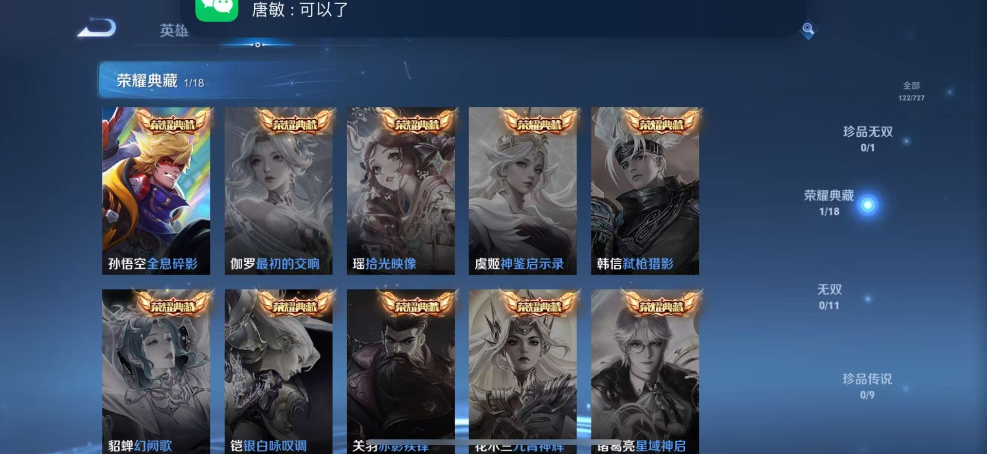 金蝉唐三藏,裴擒虎天狼狩猎者,上官婉儿梁祝,孙悟空至尊宝,百里守约朱雀志,后羿辉光之辰