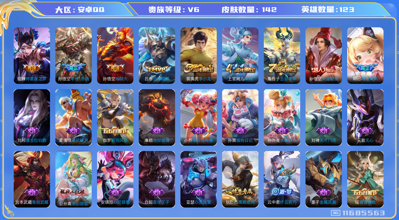 - [11818745]V9 4典藏 16传说 125英雄 320皮肤 典藏英雄武则天 可修改实名 优质装备:倪克斯神谕(宇宙婆娘),杀手不太冷,全息碎影(猴子典藏),最初的交响(伽罗典藏),猫影幻舞,炽阳神光,云霓雀翎,地狱火,仲夏夜之梦(大飞蛾),海洋之心,时之恋人-刘备(电焊工),淬星耀世,挚爱之约,山海·炽霜斩(李信年限) 珍宝阁皮:优雅恋人,女武神 限定皮:愿照·岁时盈(虞姬年限),逐霄战戟,鸣野蒿,至尊宝,凤凰于飞,武陵仙君(小桃花),异界灵契(白毛香),傲雪梅枪,白鹤梁神女,神威(电光马子),遇见飞天,高山流水,怒海麟威,青龙志(铠年限),梁祝,天狼狩猎者,天狼溯光者,李小龙,猪悟能,大圣娶亲,美猴王,山海·玄木吟(马可年限) 史诗皮:器灵·浮梦炉,绮世丹青,化蝶舞,茶境仙,谪仙醉月,炽弈燎原,百相守梦-黄忠,遇见神鹿,紫霞仙子,苍穹之光,电玩小子(小书包),白龙吟,千年之狐,真我赫兹(镜),浮梦罗烟,真我赫兹(百里守约),偶像歌手,龙骑士(小龙虾),暗夜猫娘,魅语,晚萤,冰冠公主,末日机甲-吕布,猫狗日记-孙策,猫狗日记-大乔,乱世虎臣,节奏热浪,修罗,女仆咖啡,摇滚巨星,水果甜心,绅士熊喵,天才门将,星夜王子,心灵骇客,功夫厨神,德古拉伯爵,暗隐猎兽者,幽灵船长,鬼剑武藏,暗渊魔法,心灵战警,舞动绿茵,地狱岩魂,纤云弄巧,繁星吟游(呼啦呼啦),拒霜思,缤纷独角兽,乘风破浪,逐浪之夏,水晶猎龙者,曙光守护者,箭羽风息,金属风暴,原初追逐者,圣诞恋歌,鹰眼统帅,暗夜贵公子,魅力维加斯,黎明之约,赏金猎手,无心,未来纪元-赵云