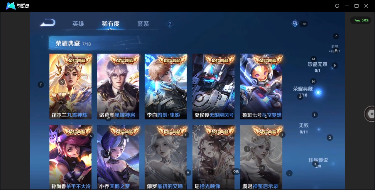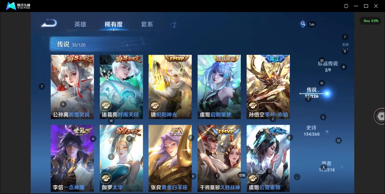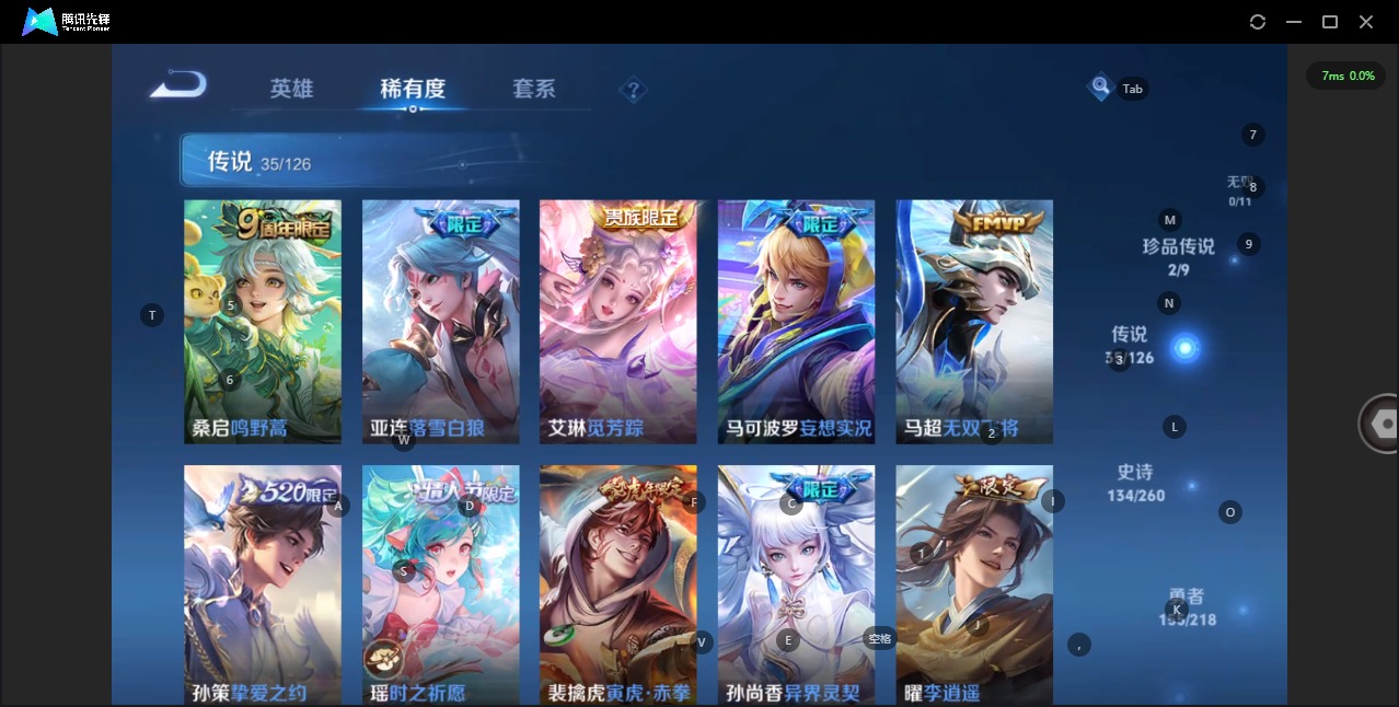 - [11651980]V8 1典藏 10传说 126英雄 232皮肤 典藏英雄武则天 可修改实名 优质装备:全息碎影(猴子典藏),冠军飞将,久胜战神,云霓雀翎,地狱火,海洋之心 传说皮:乘龙·铭钟鼎(赵云年限) 珍宝阁皮:女武神 限定皮:至尊宝,凤求凰(白切鸡),武陵仙君(小桃花),神威(电光马子),遇见飞天,五谷丰年,青龙志(铠年限),冰锋战神,游园惊梦,天狼狩猎者,李小龙,逐梦之光,如梦令-后羿,一生所爱,大圣娶亲,天魔缭乱,青春决赛季,冰霜恋舞曲,蜜橘之夏 史诗皮:赞萌露比,龙之律动,石田雨龙,守夜人,紫霞仙子,苍穹之光,白龙吟,黄金分割率,特工魅影,千年之狐,魅语,冰冠公主,偶像歌手,晚萤,猫狗日记-孙策,时之恋人-孙尚香,乱世虎臣,修罗,女仆咖啡,摇滚巨星,水果甜心,天才门将,星夜王子,功夫厨神,德古拉伯爵,暗隐猎兽者,幽灵船长,心灵战警,舞动绿茵,纤云弄巧,繁星吟游(呼啦呼啦),乘风破浪,逐浪之夏,水晶猎龙者,原初追逐者,圣诞狂欢,圣诞恋歌,鹰眼统帅,暗夜贵公子,魅力维加斯