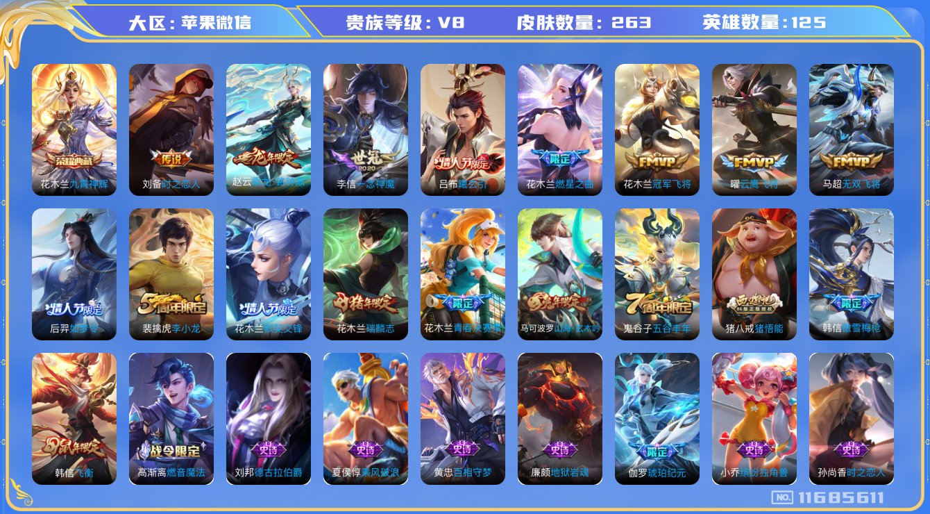 [11685611]V8 1典藏 9传说 123英雄 253皮肤 可修改实名 荣耀水晶:九霄神辉(木兰典藏) 传说皮:乘龙·铭钟鼎(赵云年限),吕布曦玄引,一念神魔,冠军飞将,云鹰飞将(小将军),无双飞将,时之恋人-刘备(电焊工),燃星之曲 珍宝阁皮:蔷薇恋人,女武神 限定皮:傲雪梅枪,飞衡(韩信年限),瑞麟志(木兰年限),五谷丰年,李小龙,如梦令-后羿,默契交锋-花木兰,猪悟能,青春决赛季,山海·玄木吟(马可年限) 史诗皮:百相守梦-黄忠,蔬乡物语(鲁班七号),超元猎域,琥珀纪元伽罗,苍穹之光,电玩小子(小书包),黄金分割率,特工魅影,永昼,江河有灵,高渐离燃音魔法,百解令(蒙犽),蒙恬荣光圣徽,冰冠公主,偶像歌手,晚萤,无限星赏官,电玩·爆裂旋风,龙骑士(小龙虾),末日机甲-吕布,猫狗日记-孙策,时之恋人-孙尚香,修罗,水果甜心,绅士熊喵,星夜王子,功夫厨神,德古拉伯爵,暗隐猎兽者,鬼剑武藏,心灵战警,繁星吟游(呼啦呼啦),拒霜思,缤纷独角兽,乘风破浪,逐浪之夏,水晶猎龙者,金属风暴,原初追逐者,圣诞狂欢,圣诞恋歌,鹰眼统帅,魅力维加斯,黎明之约,赏金猎手,奇遇舞章,千筹问战,无心