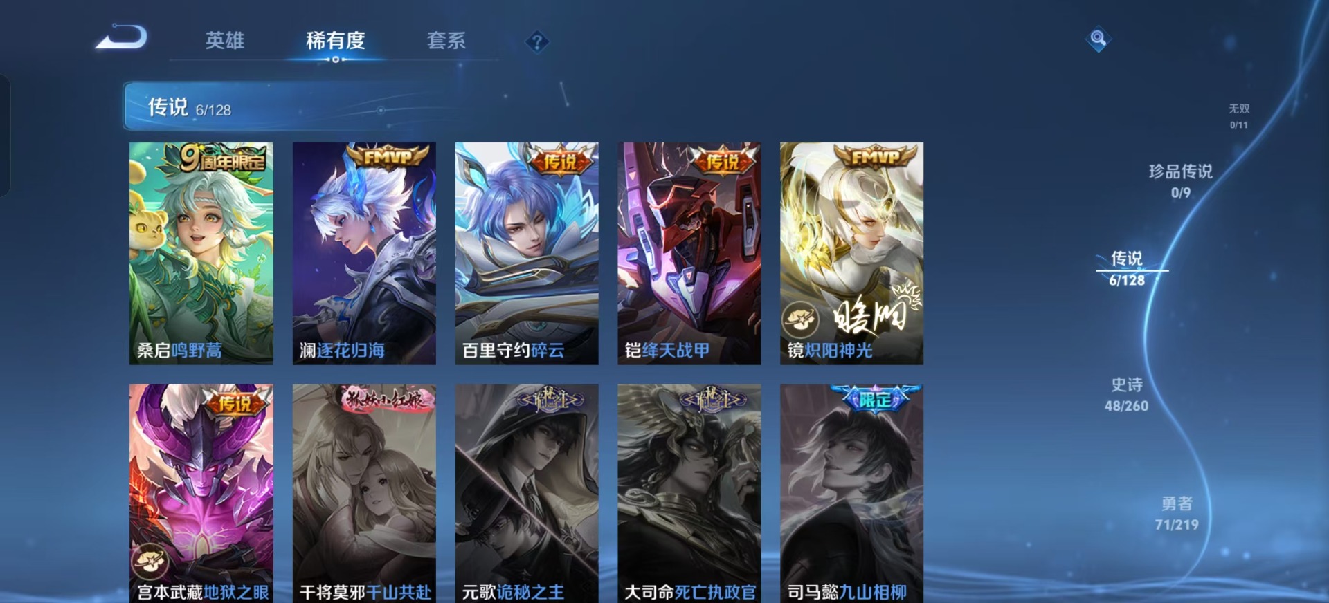 - [11604933]V6 7传说 125英雄 229皮肤 可修改实名 优质装备:冠军飞将,炽阳神光,音你心动-小乔,无双飞将,山海·炽霜斩(李信年限) 珍宝阁皮:妄想食味,优雅恋人 限定皮:愿照·山河定(司空震年限),逐霄战戟,鸣野蒿,遇见飞天,高山流水,游园惊梦,梁祝,李小龙,孙行者,猪悟能 史诗皮:器灵·浮梦炉,星界战将,石田雨龙,芈月浮光幕影,百相守梦-黄忠,紫霞仙子,偶像歌手,魅语,冰冠公主,乱世虎臣,节奏热浪,修罗,女仆咖啡,摇滚巨星,水果甜心,天才门将,星夜王子,心灵骇客,功夫厨神,德古拉伯爵,暗隐猎兽者,幽灵船长,鬼剑武藏,心灵战警,地狱岩魂,纤云弄巧,乘风破浪,水晶猎龙者,曙光守护者,金属风暴,原初追逐者,圣诞狂欢,圣诞恋歌,鹰眼统帅,暗夜贵公子,魅力维加斯,黎明之约,无心,未来纪元-赵云
