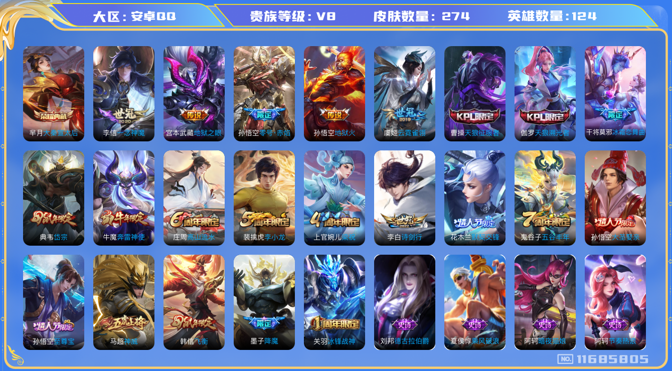 - [12082689]V8 2典藏 7传说 123英雄 271皮肤 可修改实名 优质装备:星域神启(倪克斯贼亮),幻阙歌(貂蝉典藏),久胜战神,仲夏夜之梦(大飞蛾),零号·赤焰,山海·炽霜斩(李信年限) 珍宝阁皮:优雅恋人,女武神 限定皮:梅西,异界灵契(白毛香),绯月行,神威(电光马子),瑞麟志(木兰年限),遇见飞天,高山流水,五谷丰年,游园惊梦,梁祝,天狼溯光者,李小龙,大圣娶亲,神奇女侠,山海·玄木吟(马可年限) 史诗皮:龙之律动,紫霞仙子,苍穹之光,电玩小子(小书包),白龙吟,黄金分割率,特工魅影,江河有灵,高渐离燃音魔法,无限星赏官,偶像歌手,晚萤,电玩·爆裂旋风,暗夜猫娘,猫狗日记-孙策,猫狗日记-大乔,节奏热浪,修罗,女仆咖啡,水果甜心,天才门将,星夜王子,心灵骇客,功夫厨神,德古拉伯爵,暗隐猎兽者,幽灵船长,鬼剑武藏,心灵战警,天秀·启明,舞动绿茵,地狱岩魂,纤云弄巧,繁星吟游(呼啦呼啦),拒霜思,缤纷独角兽,乘风破浪,逐浪之夏,水晶猎龙者,曙光守护者,箭羽风息,金属风暴,圣诞狂欢,圣诞恋歌,鹰眼统帅,暗夜贵公子,魅力维加斯,黎明之约,无心,未来纪元-赵云