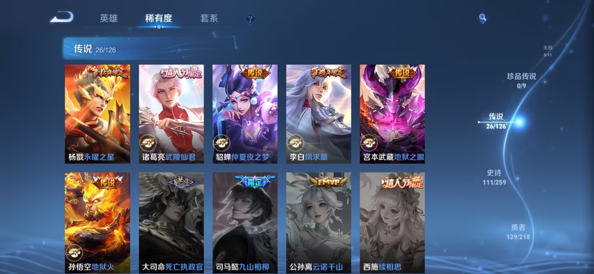 大乔白鹤梁神女,伽罗天狼溯光者,赵云百木心枪,干将莫邪冰霜恋舞曲,项羽霸王别姬,吕布御风骁将,后羿如梦令,露娜启示之音,后羿辉光之辰,露娜一生所爱,镜匿光追影者,诸葛亮时雨天司,兰陵王默契交锋,裴擒虎李小龙,裴擒虎寅虎·赤拳,上官婉儿梁祝,上官婉儿天狼绘梦者,花木兰默契交锋,花木兰瑞麟志,花木兰青春决赛季,马可波罗逐梦之星,桑启鸣野蒿,孙悟空孙行者,孙悟空大圣娶亲,芈月白晶晶,孙悟空至尊宝,百里玄策白虎志,韩信傲雪梅枪,百里守约朱雀志,王昭君凤凰于飞,关羽冰锋战神