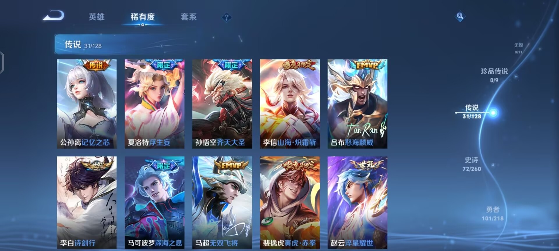 - PX_2079750-苹果Q 【可二次】 英雄数量:125 皮肤数量:209 贵族等级:贵族V8 无双限定1 荣耀典藏2 传说品质20 史诗品质52碎月剑心 神鉴启示录 弑枪猎影 凤求凰 黄金天蝎座 武陵仙君 淬星耀世 山海苍雷引 愿照·山河定 久胜战神 末日机甲女 异界灵契 遇见胡旋 神器狴犴令 枫霜尽 前尘镜 启明星使 地狱之眼 时之恋人男 落雪白狼 曦玄引男 乘龙淬吴钩 琥珀纪元马超 天才门
