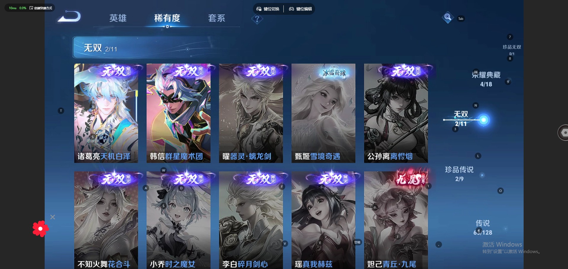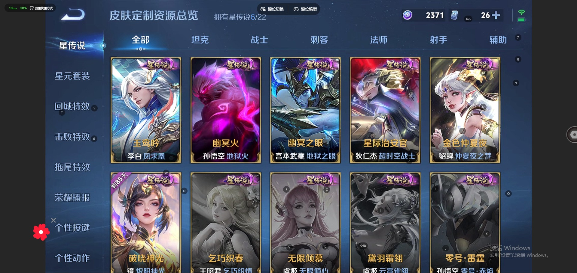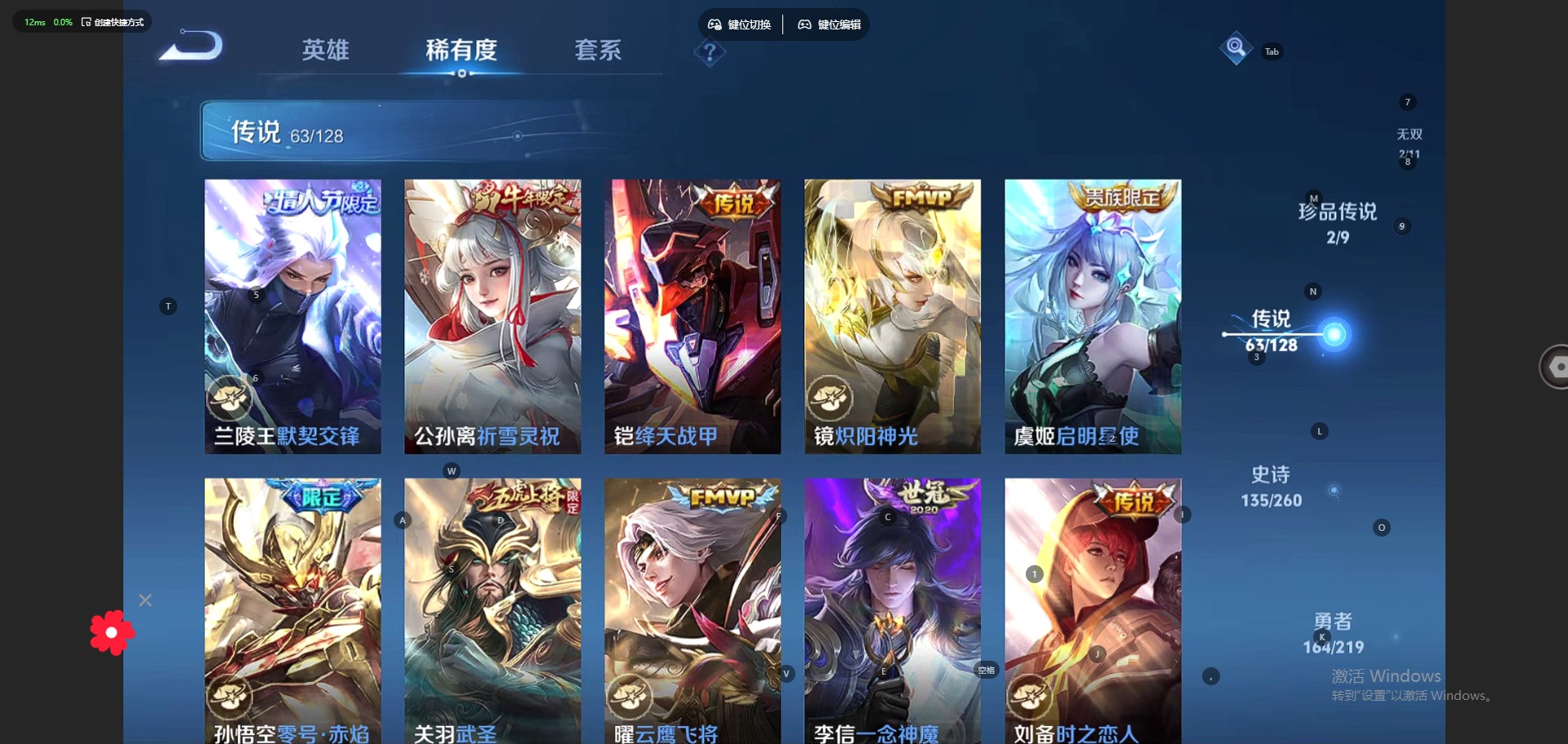 - PX_2095967-贵族等级: V8 英雄数: 125 皮肤数: 299 荣耀水晶: 九霄神辉,银白咏叹调 无双皮: 花合斗 星传说: 幽冥之眼,玉鸾吟 传说皮: 黄金狮子座,炽阳神光,末日机甲-孙尚香,地狱之眼,超时空战士-狄仁杰,末日机甲-孙策,无双飞将,神器·狴犴令,燃星之曲,记忆之芯,妄想实况,永恒水手月亮,夜礼服假面,云诺千山 限定皮: 冰锋战神,李小龙,游园惊梦,梁祝,御风骁将,逐梦