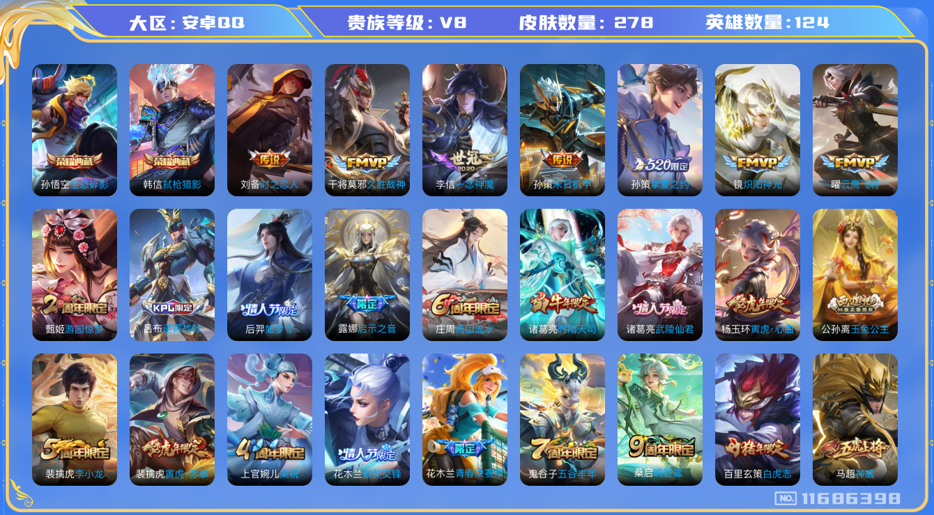 [11686398]V8 2典藏 14传说 124英雄 278皮肤 可修改实名 优质装备:全息碎影(猴子典藏),弑枪猎影(韩信典藏),云鹰飞将(小将军),久胜战神,炽阳神光,一念神魔,时之恋人-刘备(电焊工),末日机甲-孙策,挚爱之约 珍宝阁皮:妄想食味,女武神,玩趣恶龙 限定皮:逐霄战戟,鸣野蒿,白虎志(电光耗子),武陵仙君(小桃花),傲雪梅枪,时雨天司(水龙头),神威(电光马子),高山流水,五谷丰年,游园惊梦,梁祝,李小龙,如梦令-后羿,默契交锋-花木兰,青春决赛季,寅虎·心曲(虎婆),寅虎·赤拳(老虎年限),玉兔公主,启示之音 史诗皮:灵蛊蚀心,星界战将,龙之律动,石田雨龙,茶境仙,蒙犽顽岩魄,芈月浮光幕影,决胜骁骑,百相守梦-黄忠,织梦人,紫霞仙子,电玩小子(小书包),黄金分割率,特工魅影,千年之狐,永昼,江河有灵,雪夜绮愿(周瑜),蒙恬荣光圣徽,冰冠公主,偶像歌手,晚萤,电玩·爆裂旋风,暗夜猫娘,末日机甲-吕布,猫狗日记-孙策,猫狗日记-大乔,时之恋人-孙尚香,乱世虎臣,节奏热浪,修罗,女仆咖啡,摇滚巨星,水果甜心,绅士熊喵,天才门将,星夜王子,心灵骇客,功夫厨神,德古拉伯爵,暗隐猎兽者,幽灵船长,鬼剑武藏,心灵战警,舞动绿茵,地狱岩魂,纤云弄巧,拒霜思,缤纷独角兽,乘风破浪,逐浪之夏,月团寄思,水晶猎龙者,曙光守护者,箭羽风息,金属风暴,原初追逐者,圣诞狂欢,圣诞恋歌,鹰眼统帅,暗夜贵公子,魅力维加斯,黎明之约,赏金猎手,无心,未来纪元-赵云