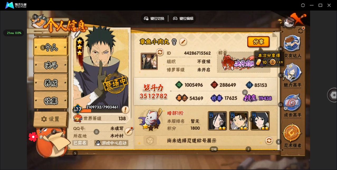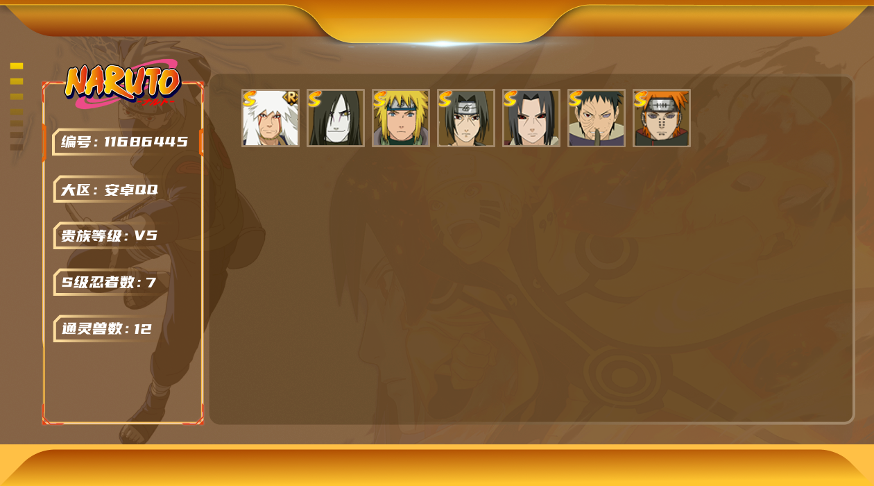 [11686445]V5 7S忍 19A忍 12通灵 351.2W战力 可二次 可修改实名 优质装备:宇智波鼬「秽土转生」,宇智波带土 「忍界大战」 S级忍者:自来也 「舞之豪杰」,宇智波鼬 「须佐能乎」,佩恩「天道」,波风水门,大蛇丸