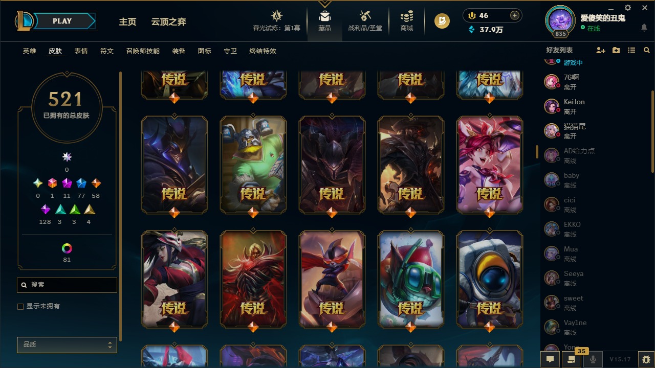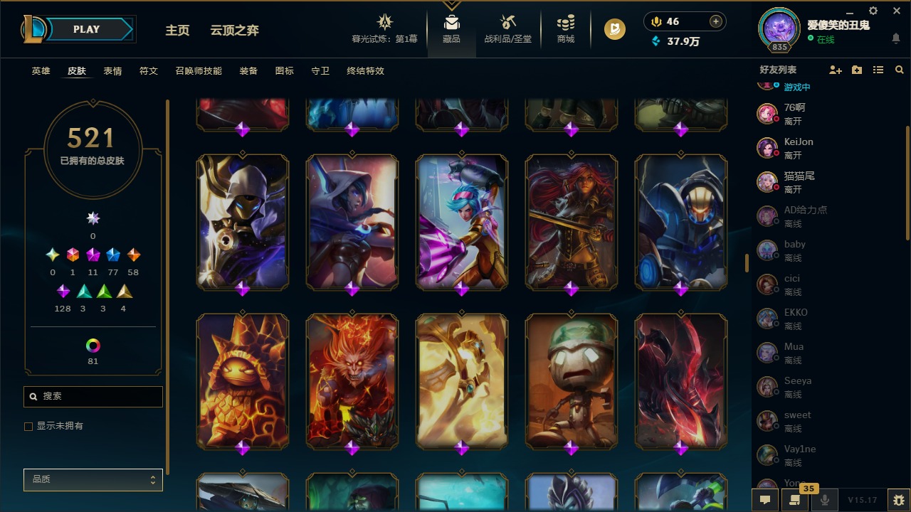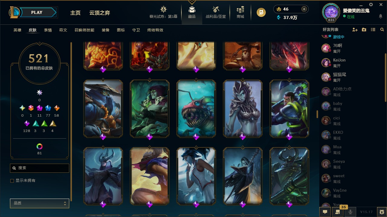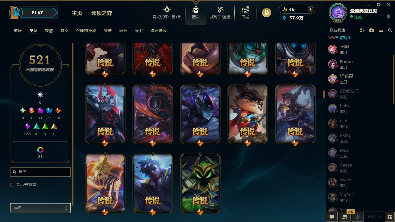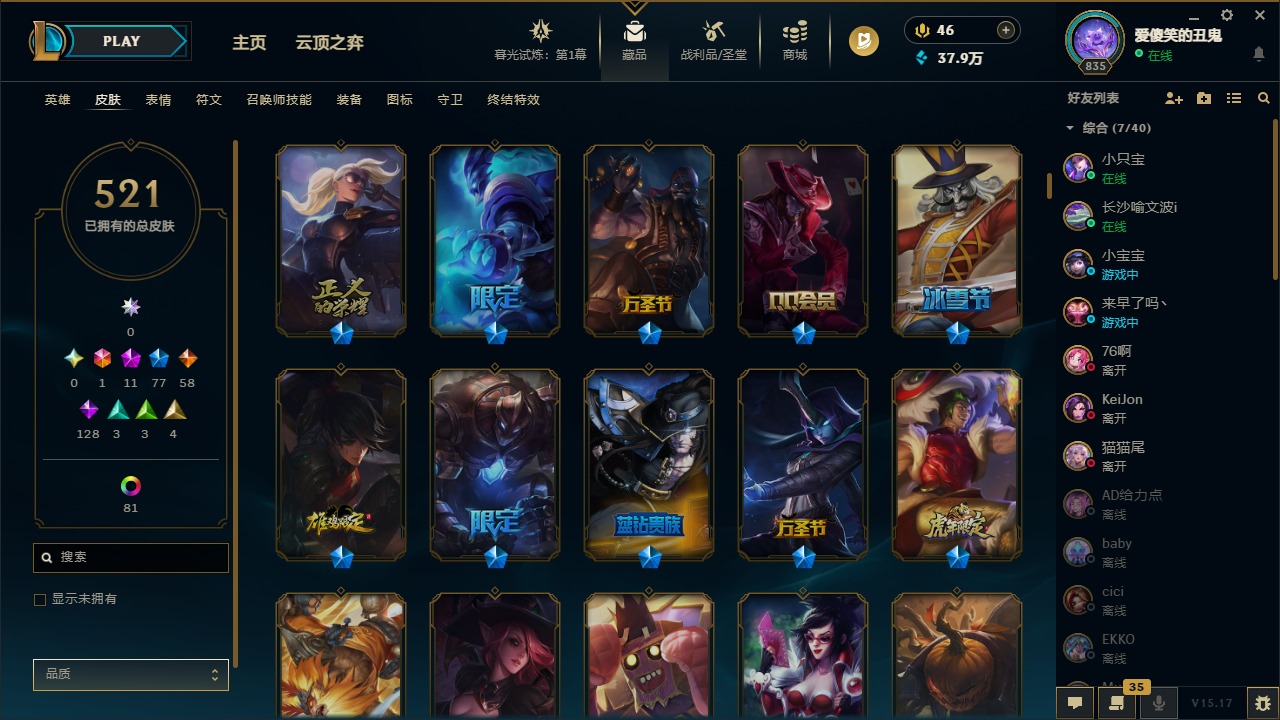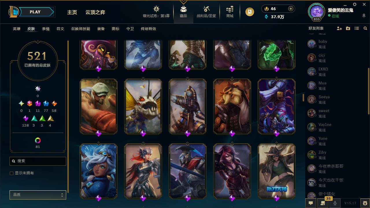[11686538]1终极 11神话 77限定 58传说 128史诗 521皮肤 92炫彩 170英雄 可二次 可修改实名 优质装备:至臻 玉剑传说 武剑仙,至臻 K/DA 卡莎,至臻 真实伤害 奇亚娜,至臻 战斗学院 蕾欧娜,源代码 乐芙兰,防爆天使 凯尔,暗影 沃里克,巧克力工坊 波比,都铎王朝 图奇,防爆士兵 炼金,冠军典狱长 锤石,红桃杰克 崔斯特,机械迷城 加里奥,蓝色忧郁 崔斯特,蒙多蒙多,女猎手 希维尔,诺斯费拉图 弗拉基米尔,破空枪骑 孙悟空,糖果使徒 费德提克,未来战士,霸天巨兽·雪崩 墨菲特,偶像歌手 阿理 极地雪莲,外星装甲 库奇,至臻 灵魂莲华 拉克丝,至臻 灵魂莲华 劫 海克斯:海克斯 嘉文四世,海克斯 阿木木 情人节限定:觅心猎手 薇恩 赛季限定皮:胜利女神 莫甘娜,胜利女神 希维尔,胜利之树 茂凯,胜利枪神 格雷福斯,胜利女神 奥利安娜,胜利之剑 剑魔,胜利枪神 卢锡安 冠军限定系列:S13 T1 李青,S1FNC 迦娜,S1FNC 卡尔萨斯,S2 暗杀星 蒙多,S2 暗杀星 努努,S2 暗杀星 慎,S3 SKT T1 劫,S3 SKT T1 贾克斯,S3 SKT T1 李青,S4 SSW 锤石,S4 SSW 泰隆,S4 SSW 图奇,S4 SSW 炼金,S5 SKT T1 雷克顿,S5 SKT T1 阿利斯塔,S5 SKT T1 瑞兹,S5 SKT T1 蜘蛛,S6 SKT T1 烬,S8 IG 艾瑞莉娅,S8 IG 菲奥娜,S8 IG 卡密尔,S8 IG 卡莎,S8 IG 乐芙兰,S8 IG 洛,S9 FPX 锤石 冰雪节限定:“主人不要我了” 阿木木,冰雪风暴 希维尔,冰雪节 马尔扎哈,胡桃夹子 小丑,圣诞开心鬼 提莫,圣诞精灵 崔丝塔娜,圣诞狂欢 时光,圣诞狂欢 努努,圣诞老人 酒桶,圣诞糖果棒 厄运小姐,圣诞玩偶 波比,圣诞驯鹿 克格莫,冰雪节 茂凯,幸福女神 乐芙兰,雪默丁格,英勇玩具兵船长 泳池派对:泳池派对 吉格斯,泳池派对 蕾欧娜,泳池派对 男枪,泳池派对 李青,泳池派对 普朗克 万圣节限定:海贼 瑞兹,灵魂收割者 索拉卡,魅惑女巫 莫甘娜,南瓜头 费德提克,无头骑士 人马 年限:龙年 克格莫,蛇年 安妮,猴年 孙悟空,鸡年 蔚,龙腾虎跃 瑟提 周年:10周年 安妮,10周年 凤凰