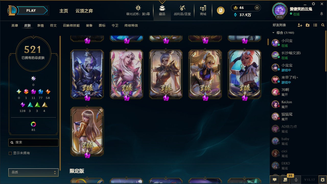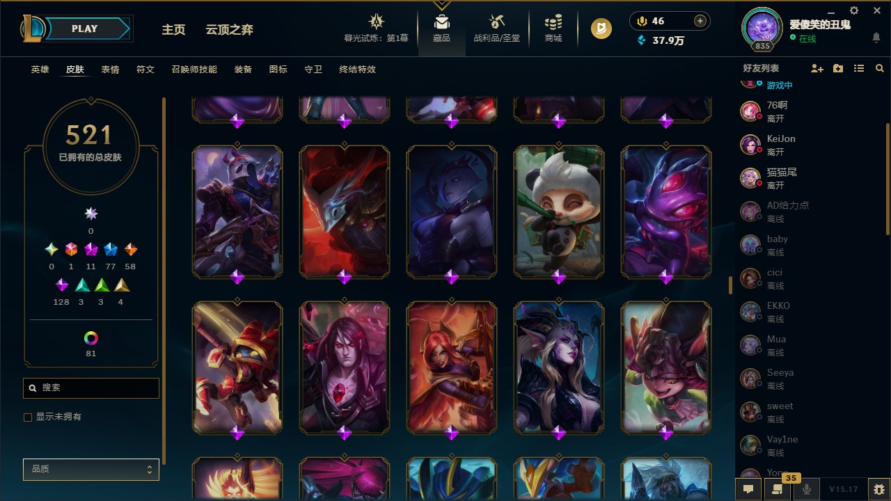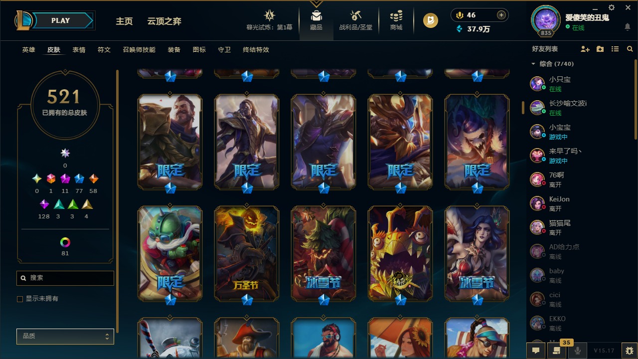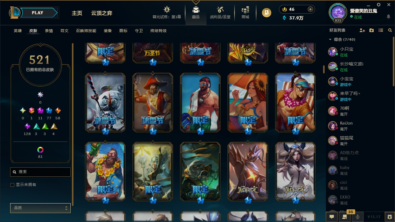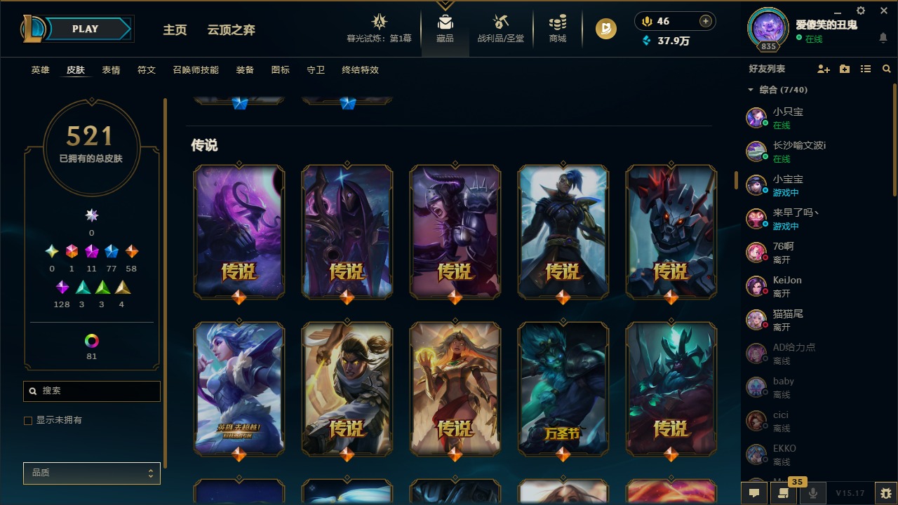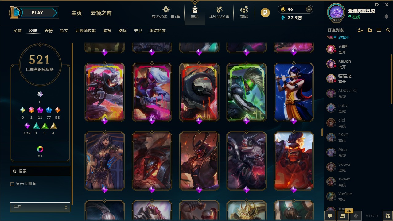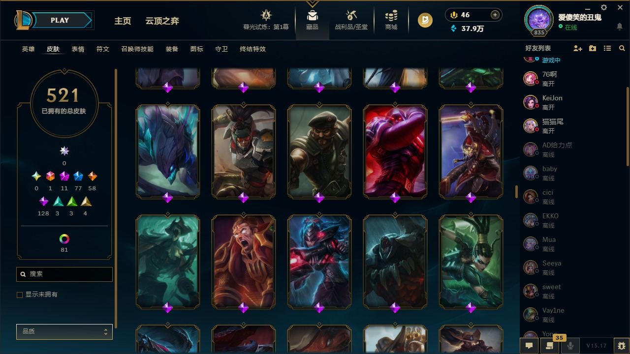 [11686538]1终极 11神话 77限定 58传说 128史诗 521皮肤 92炫彩 170英雄 可二次 可修改实名 优质装备:至臻 玉剑传说 武剑仙,至臻 K/DA 卡莎,至臻 真实伤害 奇亚娜,至臻 战斗学院 蕾欧娜,源代码 乐芙兰,防爆天使 凯尔,暗影 沃里克,巧克力工坊 波比,都铎王朝 图奇,防爆士兵 炼金,冠军典狱长 锤石,红桃杰克 崔斯特,机械迷城 加里奥,蓝色忧郁 崔斯特,蒙多蒙多,女猎手 希维尔,诺斯费拉图 弗拉基米尔,破空枪骑 孙悟空,糖果使徒 费德提克,未来战士,霸天巨兽·雪崩 墨菲特,偶像歌手 阿理 极地雪莲,外星装甲 库奇,至臻 灵魂莲华 拉克丝,至臻 灵魂莲华 劫 海克斯:海克斯 嘉文四世,海克斯 阿木木 情人节限定:觅心猎手 薇恩 赛季限定皮:胜利女神 莫甘娜,胜利女神 希维尔,胜利之树 茂凯,胜利枪神 格雷福斯,胜利女神 奥利安娜,胜利之剑 剑魔,胜利枪神 卢锡安 冠军限定系列:S13 T1 李青,S1FNC 迦娜,S1FNC 卡尔萨斯,S2 暗杀星 蒙多,S2 暗杀星 努努,S2 暗杀星 慎,S3 SKT T1 劫,S3 SKT T1 贾克斯,S3 SKT T1 李青,S4 SSW 锤石,S4 SSW 泰隆,S4 SSW 图奇,S4 SSW 炼金,S5 SKT T1 雷克顿,S5 SKT T1 阿利斯塔,S5 SKT T1 瑞兹,S5 SKT T1 蜘蛛,S6 SKT T1 烬,S8 IG 艾瑞莉娅,S8 IG 菲奥娜,S8 IG 卡密尔,S8 IG 卡莎,S8 IG 乐芙兰,S8 IG 洛,S9 FPX 锤石 冰雪节限定:“主人不要我了” 阿木木,冰雪风暴 希维尔,冰雪节 马尔扎哈,胡桃夹子 小丑,圣诞开心鬼 提莫,圣诞精灵 崔丝塔娜,圣诞狂欢 时光,圣诞狂欢 努努,圣诞老人 酒桶,圣诞糖果棒 厄运小姐,圣诞玩偶 波比,圣诞驯鹿 克格莫,冰雪节 茂凯,幸福女神 乐芙兰,雪默丁格,英勇玩具兵船长 泳池派对:泳池派对 吉格斯,泳池派对 蕾欧娜,泳池派对 男枪,泳池派对 李青,泳池派对 普朗克 万圣节限定:海贼 瑞兹,灵魂收割者 索拉卡,魅惑女巫 莫甘娜,南瓜头 费德提克,无头骑士 人马 年限:龙年 克格莫,蛇年 安妮,猴年 孙悟空,鸡年 蔚,龙腾虎跃 瑟提 周年:10周年 安妮,10周年 凤凰