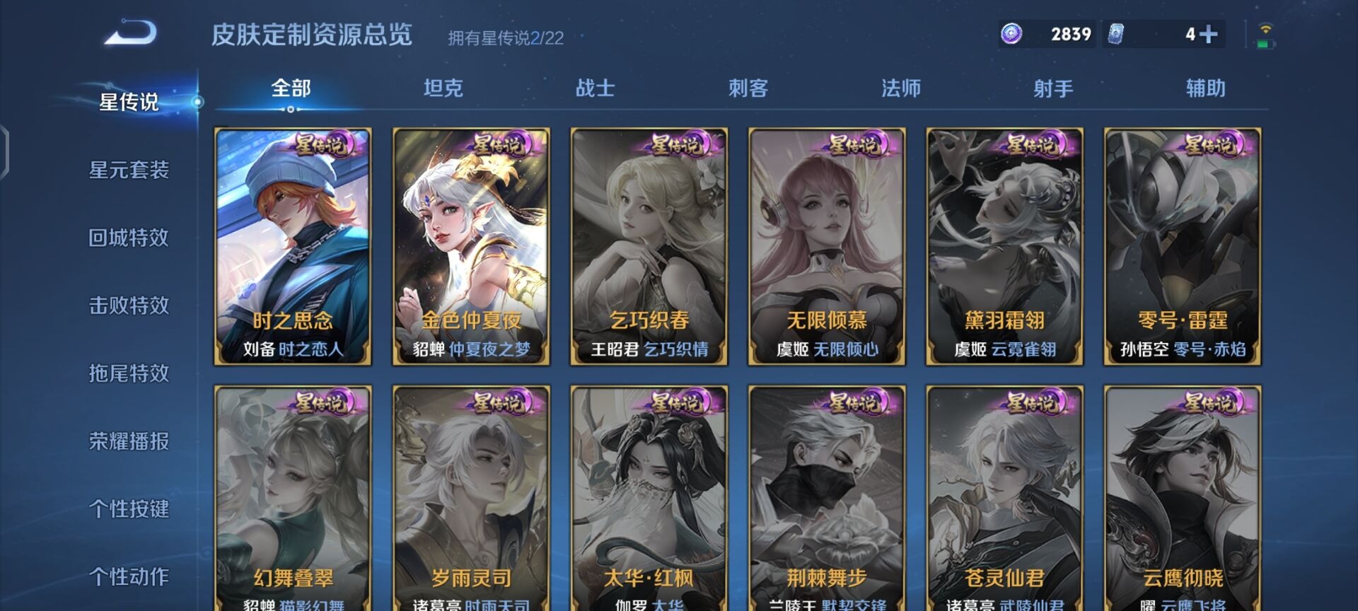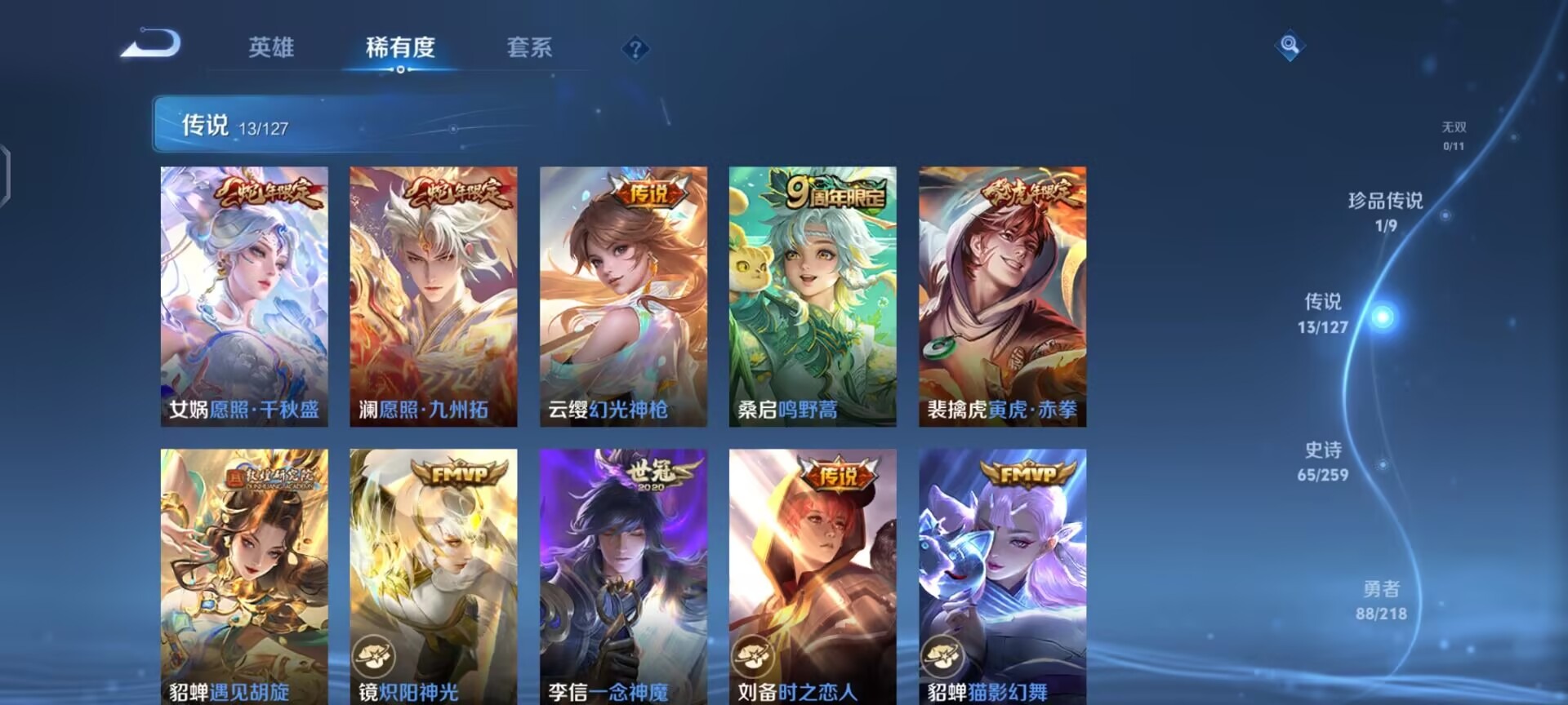 黄忠烈魂,甄姬幽恒,裴擒虎李小龙,裴擒虎寅虎·赤拳,上官婉儿梁祝,上官婉儿天狼绘梦者,马可波罗逐梦之星,桑启鸣野蒿,女娲愿照·千秋盛,孙悟空至尊宝,马超神威,韩信傲雪梅枪,百里守约朱雀志,澜愿照·九州拓,嫦娥如梦令,王昭君凤凰于飞,关羽冰锋战神