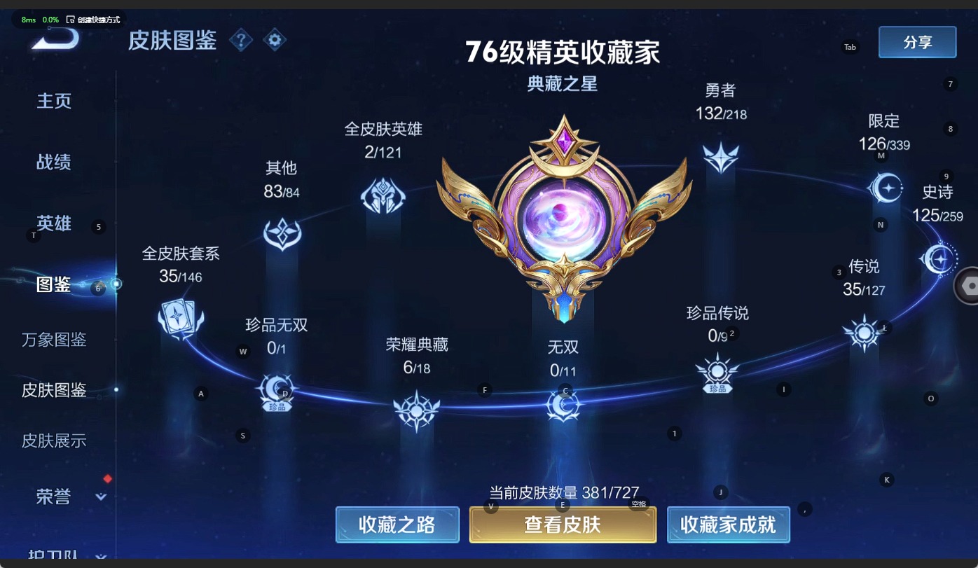 - PX_2095958-贵族等级: V8 英雄数: 124 皮肤数: 285 荣耀水晶: 天鹅之梦 星传说: 金色仲夏夜 传说皮: 云霓雀翎,末日机甲-孙尚香,仲夏夜之梦,音你心动-小乔,音你心动-周瑜,乞巧织情,超时空战士-狄仁杰,花朝如约,挚爱之约,挚爱花嫁,音你闪耀,山海·琳琅生,炽翼辉光 限定皮: 遇见飞天,游园惊梦,梁祝,白鹤梁神女,辉光之辰,白晶晶,天狼溯光者,天狼运算者,热情桑巴,纯白