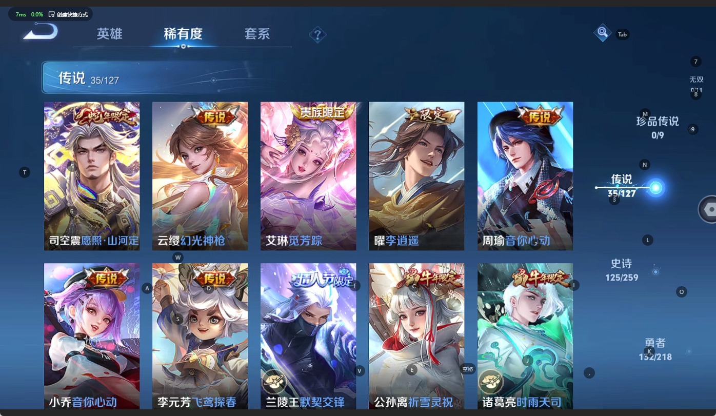 - [12204320]V7 2珍品传说 8传说 125英雄 203皮肤 可修改实名 女号 优质装备:江户川柯南,怪盗基德,黄金狮子座,末日机甲-孙尚香(绿蚂蚱),地狱火,山海·炽霜斩(李信年限),山海·苍雷引(电光曜子),炽翼辉光(娃娃菜牛角包) 珍宝阁皮:优雅恋人 限定皮:愿照·岁时盈(虞姬年限),逐霄战戟,鸣野蒿,遇见飞天,梁祝,龙胆,烈魂,李小龙,山海·玄木吟(马可年限) 史诗皮:器灵·浮梦炉,化蝶舞,谪仙醉月,茶境仙,百相守梦-百里守约,星界特工,黄金分割率,特工魅影,千年之狐,偶像歌手,晚萤,末日机甲-吕布,猫狗日记-孙策,节奏热浪,女仆咖啡,水果甜心,星夜王子,功夫厨神,德古拉伯爵,暗隐猎兽者,幽灵船长,鬼剑武藏,舞动绿茵,乘风破浪,水晶猎龙者,曙光守护者,箭羽风息,金属风暴,原初追逐者,圣诞狂欢,鹰眼统帅,黎明之约