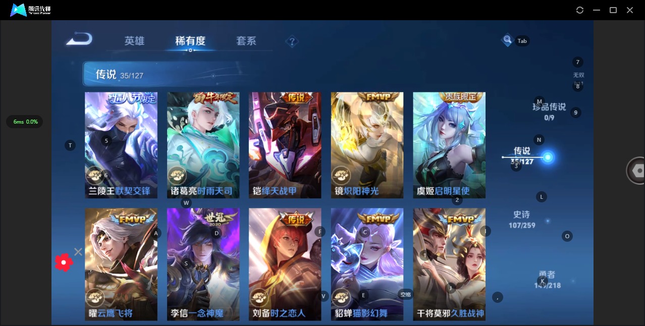 - PX_2093312-88 安卓QQ/最强王者/348皮肤/124英雄/2典藏/0珍品无双/1无双/0珍品传说/21传说/109史诗/8稀有英雄 【2 典藏皮肤】杀手不太冷 孙尚香,拾光映像 瑶, 【1 无双皮肤】花合斗 不知火舞, 【21 传说皮肤】胖达荣荣 梦奇,启明星使 虞姬,逐花归海 澜,时之祈愿 瑶,无双飞将 马超,白虎志 百里玄策,李逍遥 曜,云鹰飞将 曜,永曜之星 杨戬,遇见胡旋