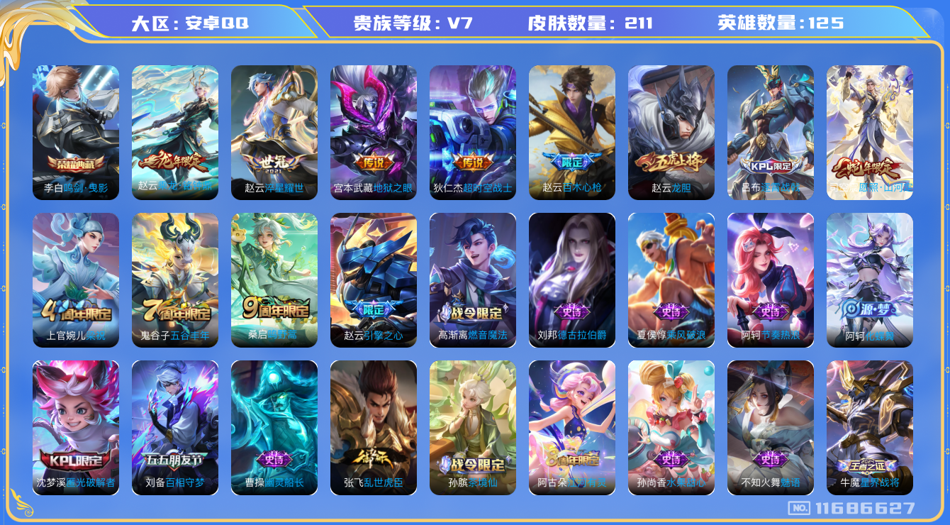 [11686627]V7 1典藏 6传说 125英雄 211皮肤 可修改实名 优质装备:鸣剑·曳影,地狱之眼,淬星耀世,超时空战士-狄仁杰 传说皮:乘龙·铭钟鼎(赵云年限) 珍宝阁皮:蔷薇恋人 限定皮:愿照·山河定(司空震年限),逐霄战戟,鸣野蒿,五谷丰年,梁祝,龙胆,引擎之心,百木心枪 史诗皮:化蝶舞,星界战将,百相守梦-周瑜,茶境仙,破空之剑,蔬乡物语(鲁班七号),超元猎域,百相守梦-百里守约,紫霞仙子,特工魅影,匿光破解者,百相守梦(刘备),电玩·爆裂旋风,江河有灵,百解令(蒙犽),高渐离燃音魔法,蒙恬荣光圣徽,偶像歌手,魅语,无限星赏官,冰冠公主,乱世虎臣,节奏热浪,修罗,摇滚巨星,水果甜心,天才门将,星夜王子,德古拉伯爵,暗隐猎兽者,幽灵船长,鬼剑武藏,纤云弄巧,拒霜思,乘风破浪,逐浪之夏,水晶猎龙者,圣诞恋歌,鹰眼统帅,暗夜贵公子,魅力维加斯,黎明之约,无心,未来纪元-赵云